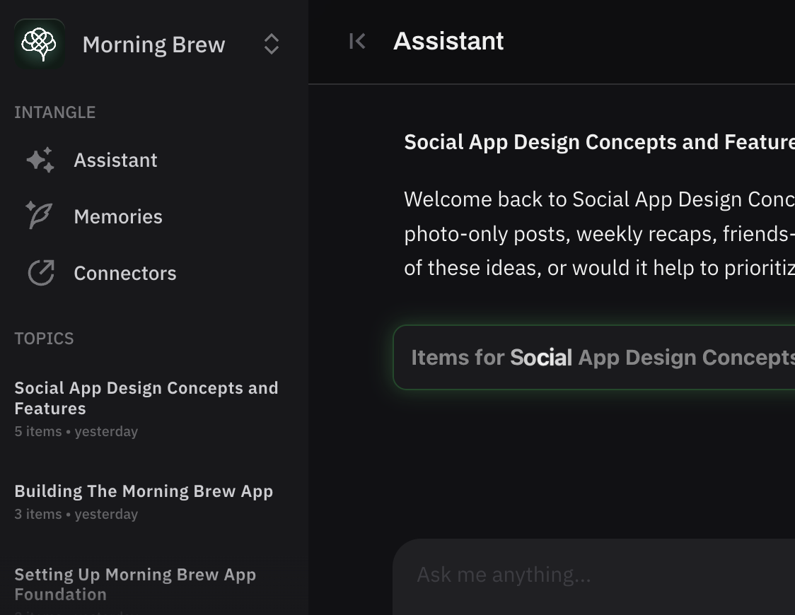 Memory is the problem. Intangle is the answer. Your data stays yours. Works across every AI tool and provider, self-organising your conversations, context, tasks, processes, ideas & insights - delivering the right context, everywhere you work. Built on the most advanced memory architecture in production today, the "coherence engine" will transform how AI works for you. Your memory data. Your control.