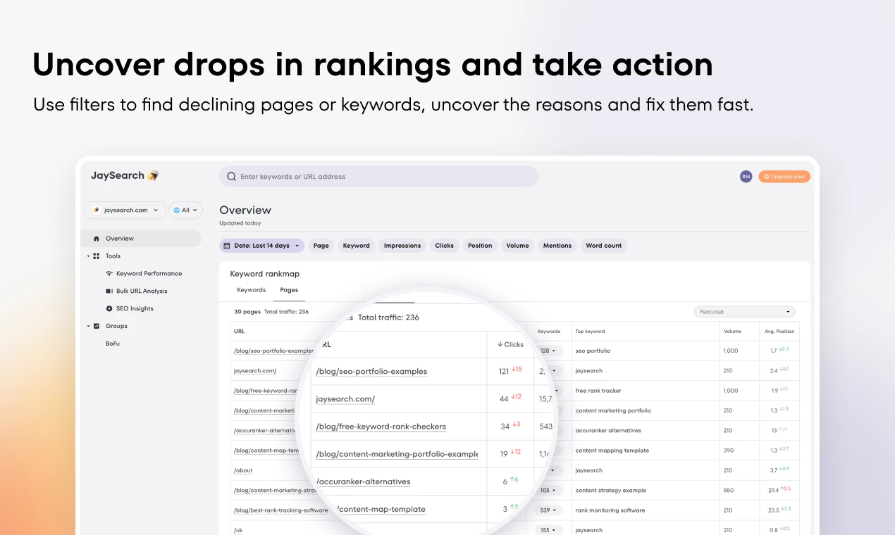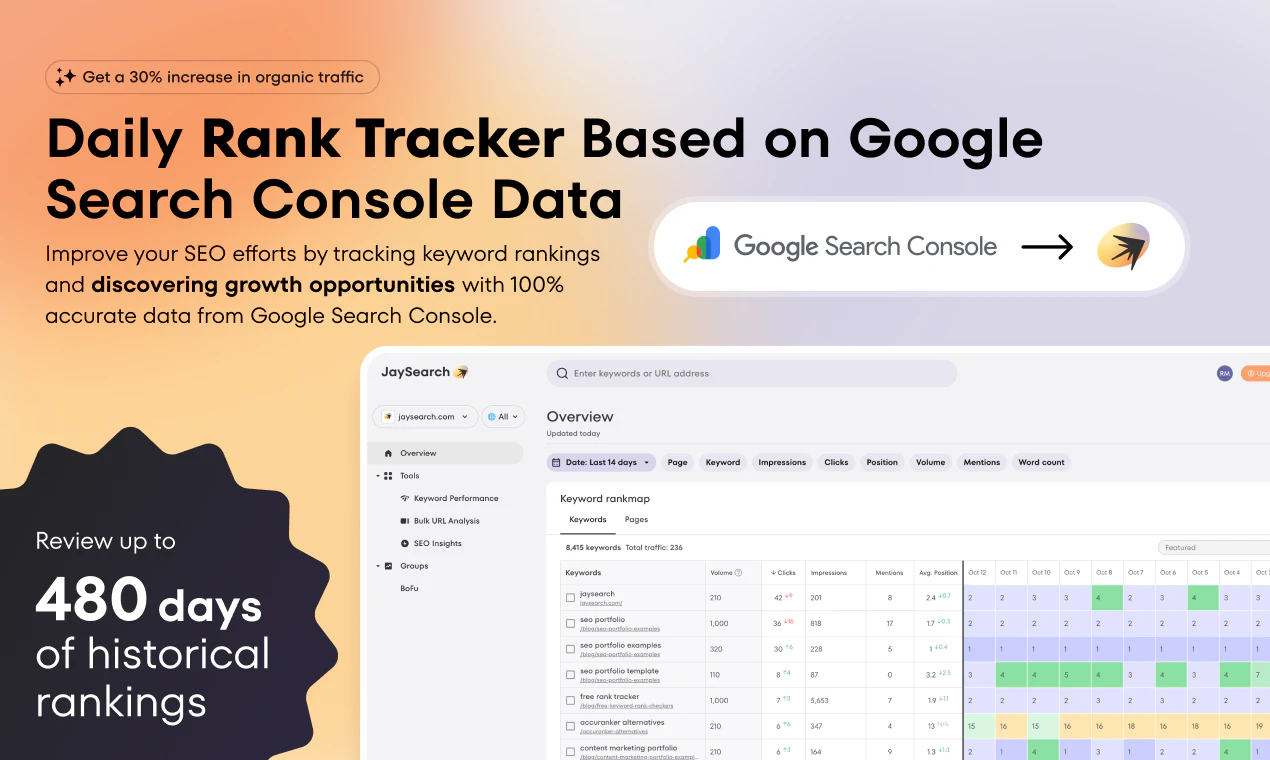 JaySearch is a rank tracker for SEOs, built by SEOs. We changed a classical rank tracking pricing model, you’re not charged for each position check — you pay only for Google Search Console data processing. For just $19, you can now track daily rankings for up to 100 search results across 10,000 keywords. Take a look!