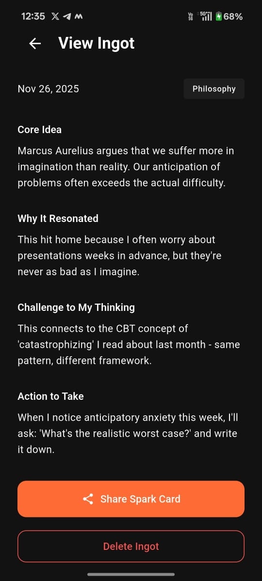 Anvil is a minimalist reading journal that helps you actually remember what you read. Unlike traditional note-taking apps, Anvil uses 4 meta-cognitive prompts after each reading session: Core Idea - What concept challenged you? Resonance - Why did it matter to you? Challenge - How does it connect to past reading? Action - What will you do this week? 100% privacy-first: All your thoughts stay on your device. No cloud sync, no AI training, no data collection. Your reading journal is truly yours.