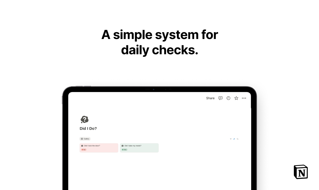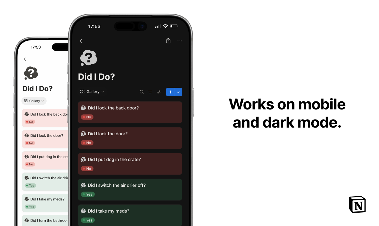 Did I Do? is a simple Yes/No checklist for the small tasks you often forget. Lock the door, take meds, switch things off—track it all in one clean daily view. Each item resets automatically, with colour indicators for quick clarity. Mobile-friendly, dark-mode ready, and lightweight for everyday use. A calm way to stay consistent with your routine.