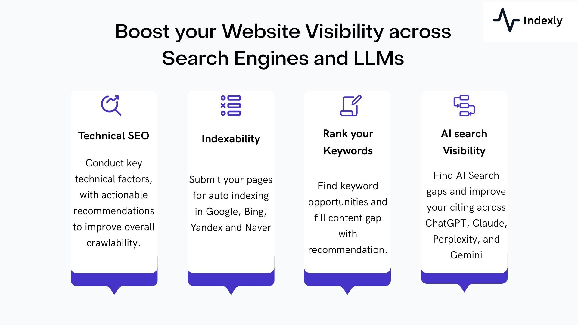 Indexly 3.0 represents everything we’ve learned over the last year about scaling organic growth for businesses and agencies. It goes beyond traditional SEO by combining Technical SEO, Content Writing, and AI Search Visibility into one platform. Built for where search is headed next.