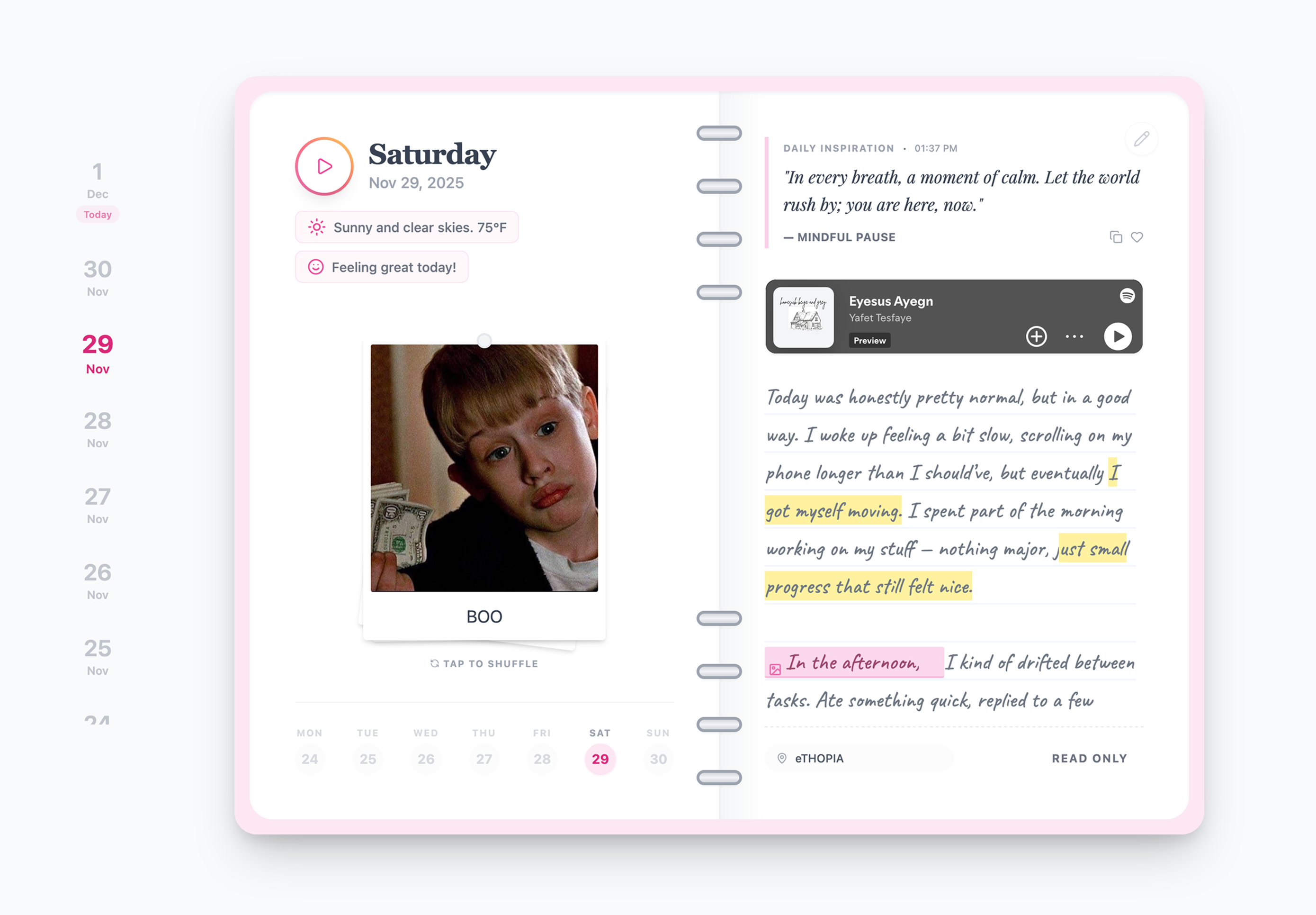 Hushh is a personal diary app that actually feels personal. Write your thoughts, drop in photos, add the song you were looping on Spotify. You can switch themes, look back on past entries, and even post story-style snippets when you just want to save a quick memory. There’s also a Vision Board where you can build your goals with images and notes, your future, but visual. And a Streaks & Milestones page that shows how consistent you’ve been. If you want your space, Hushh is that place.