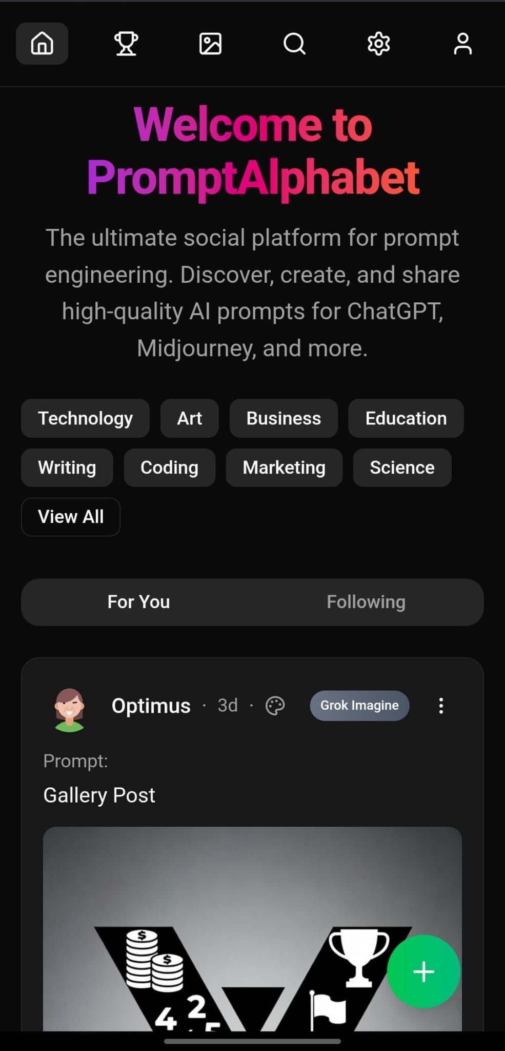 PromptAlphabet transforms prompt engineering into a social experience. Unlike scattered paywalled prompt libraries, we built the first true social network for AI prompts. What makes us different: Works with 5+ AI models (ChatGPT, Gemini, Grok, DeepSeek) Daily challenges with competitive leaderboards Offline-first architecture - queue posts without internet Visual AI model indicators for quick scanning Advanced search by keywords and specific AI models Bookmark & remix top-performing prompts