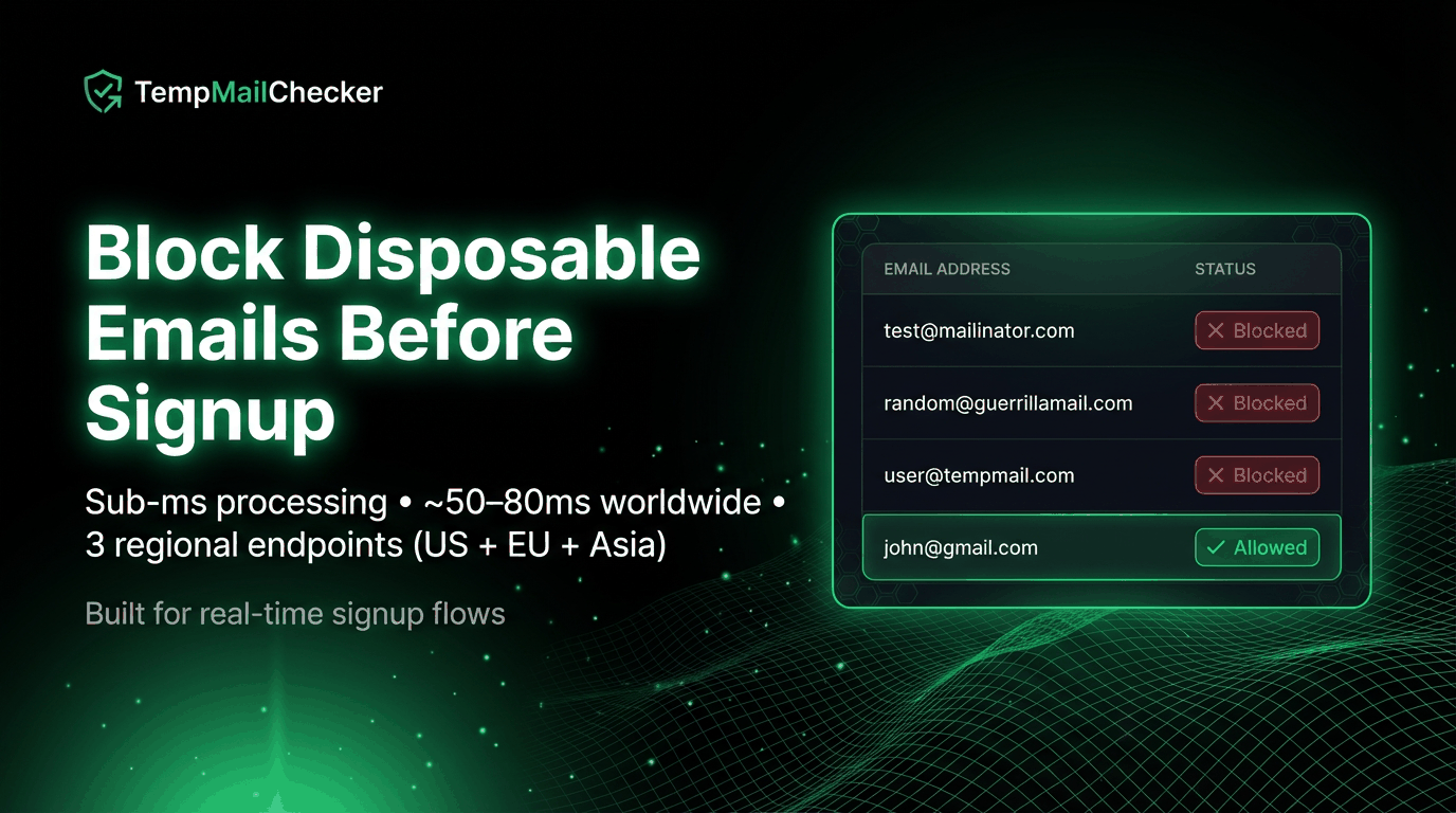 Temporary email abuse destroys signup funnels: fake accounts, trial farming, referral fraud, wasted server resources — especially for AI SaaS where every request costs money. TempMailChecker blocks 277,358+ temporary/disposable email domains with one API call. Returns temp: true/false in sub-ms time across US/EU/Asia endpoints. Works with any product, any stack. Free plan included.