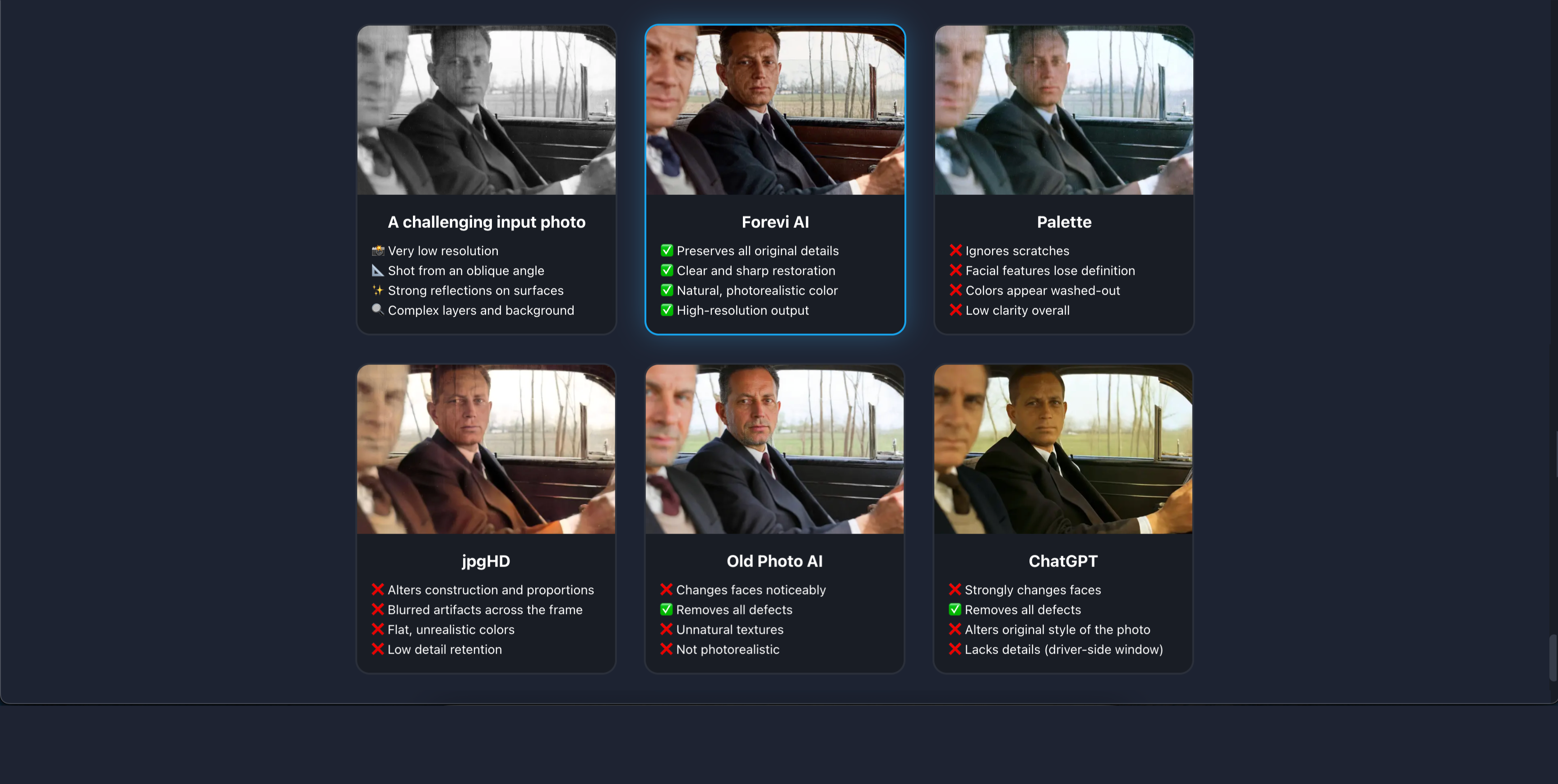 Forevi brings old photos back to life with AI that restores, colorizes, and enhances old images without changing faces or geometry. Then animate your photos with motion and sound to recreate the moment. It’s built for real family archives and historical photos: authentic, clean results with fast processing and 4K exports.