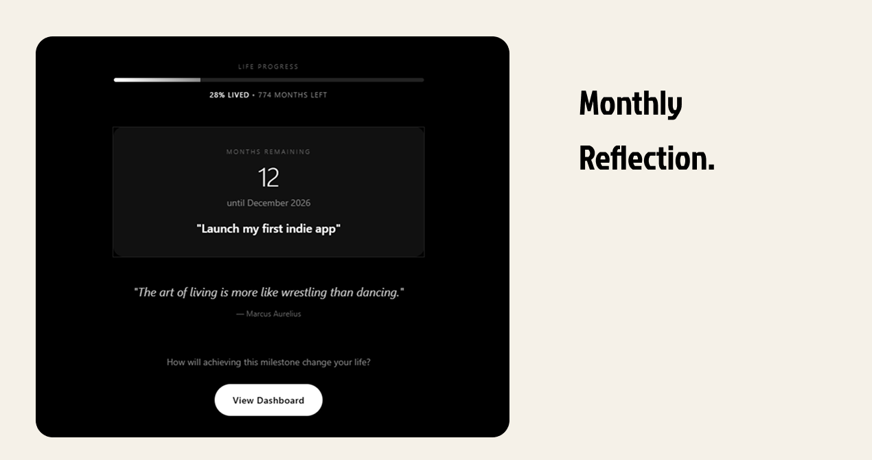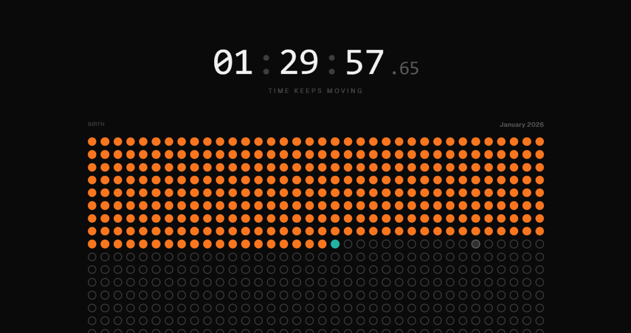 Most of us treat time as infinite. It's not. intnt shows your entire life as a grid of 1,080 months — from birth to ~90 years old. Each dot is one month. Set milestones and see exactly where they fit in your remaining time. Stop planning "someday." See how much time you actually have.