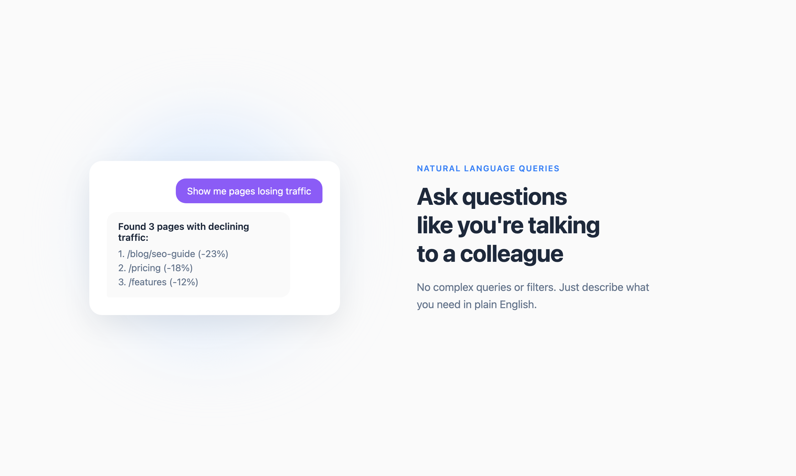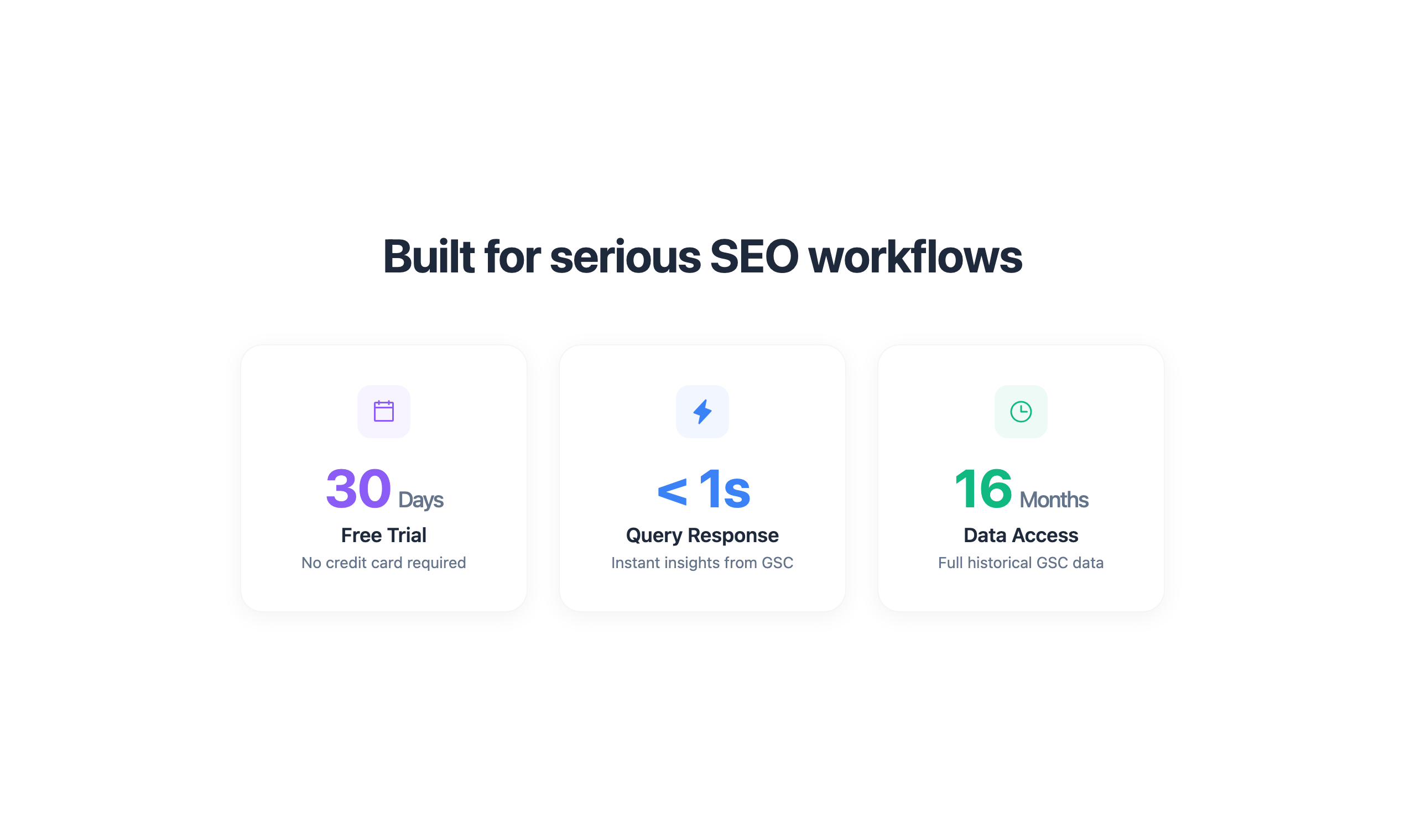 You know the drill: Export CSV from Search Console. Upload to ChatGPT. Watch it hallucinate your data. Cry. Repeat. We fixed that. We built this for SEOs who just want to ask questions. Connect your Google account and it's done. Works with Claude, ChatGPT and Cursor instantly. Just ask: - "Why did my traffic drop last Tuesday?" - "Which pages have high impressions but low CTR?" - "Is Google even indexing my new pages?" 30-day free trial. No terminal commands. Zero credit cards harmed.