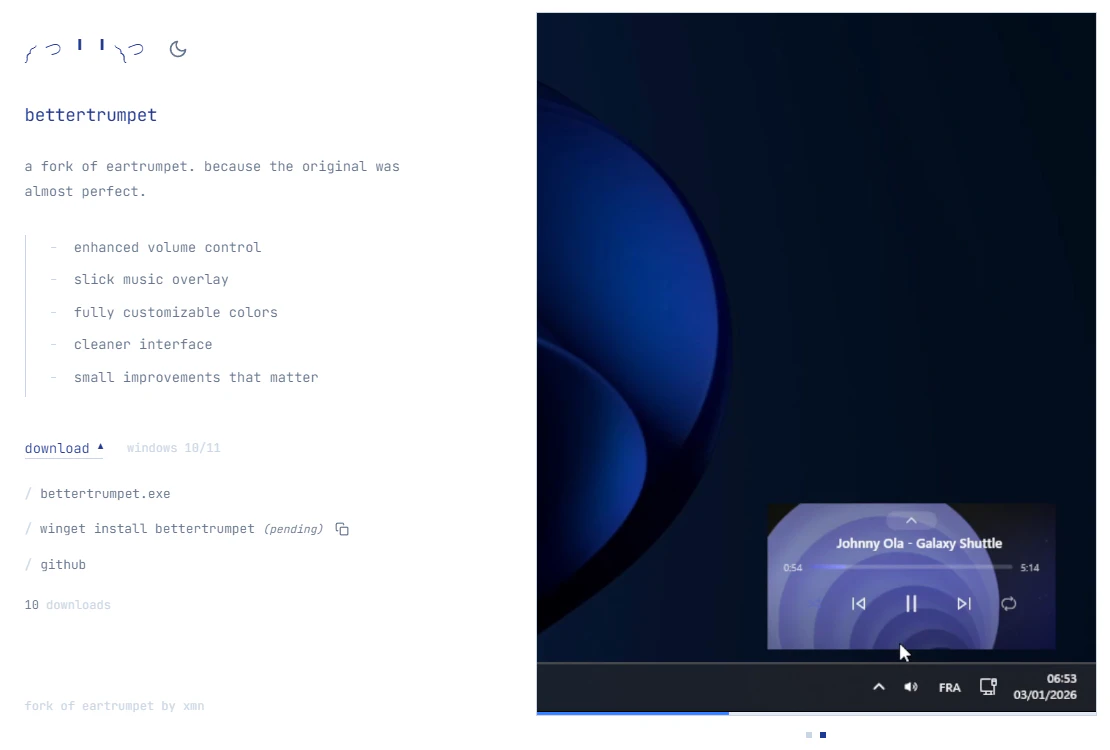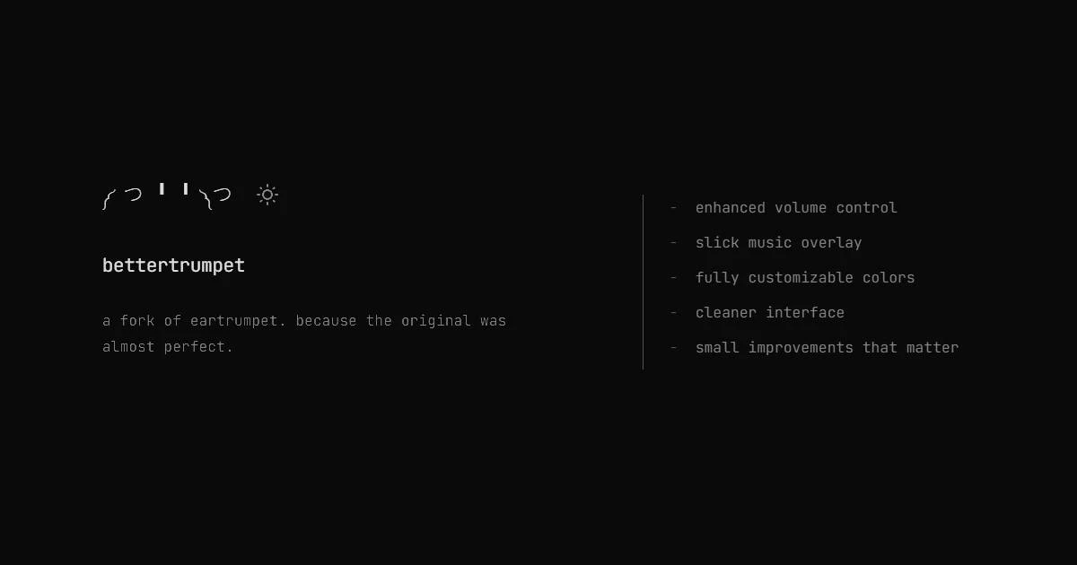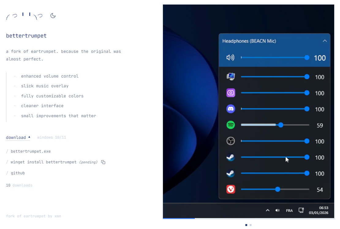 a refined fork of eartrumpet, the beloved windows volume mixer. what's new: → music overlay – control playback directly from the popup → cleaner ui – refined visuals for windows 11 → smoother volume control – better per-app management no bloat. no subscription. just a better daily driver. built because the original was almost perfect.
