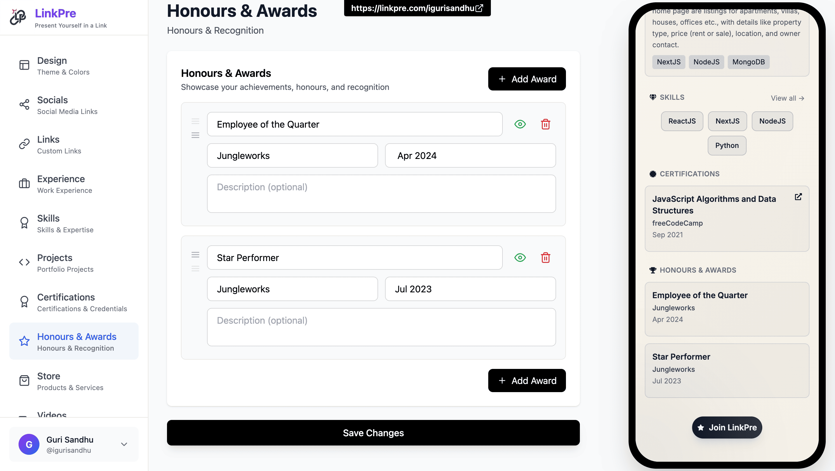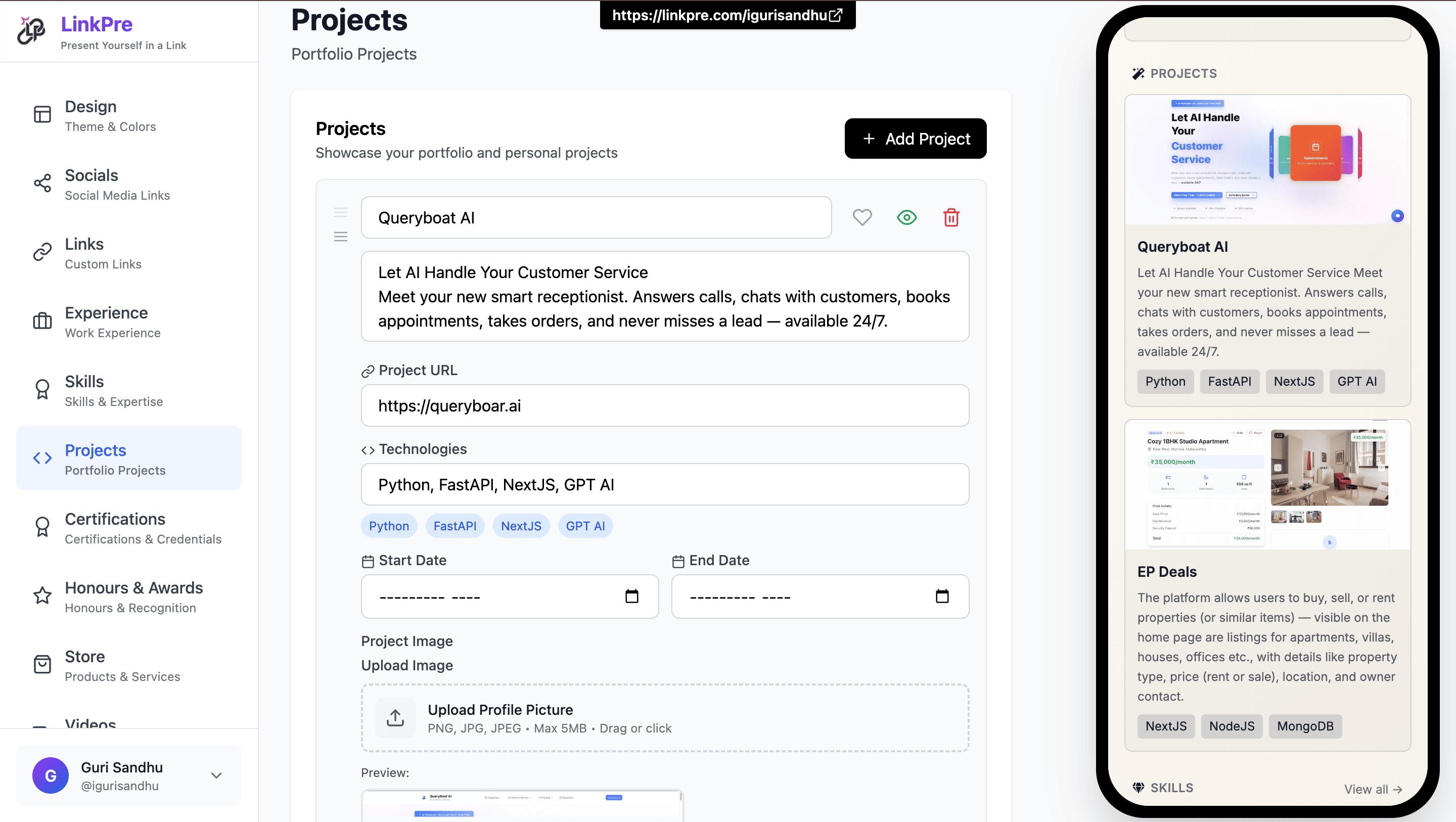 LinkPre is a powerful digital profile that brings your entire online presence into one link. Showcase projects, products, testimonials, skills, certifications, awards, videos, and images—while letting visitors book meetings directly. With full customization, analytics, and monetization, LinkPre helps creators, professionals, students, and businesses build trust, stand out, and convert attention into real opportunities.