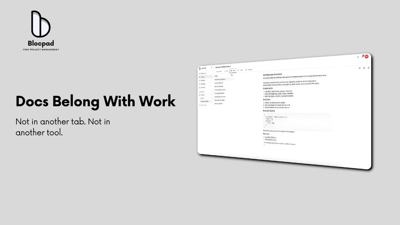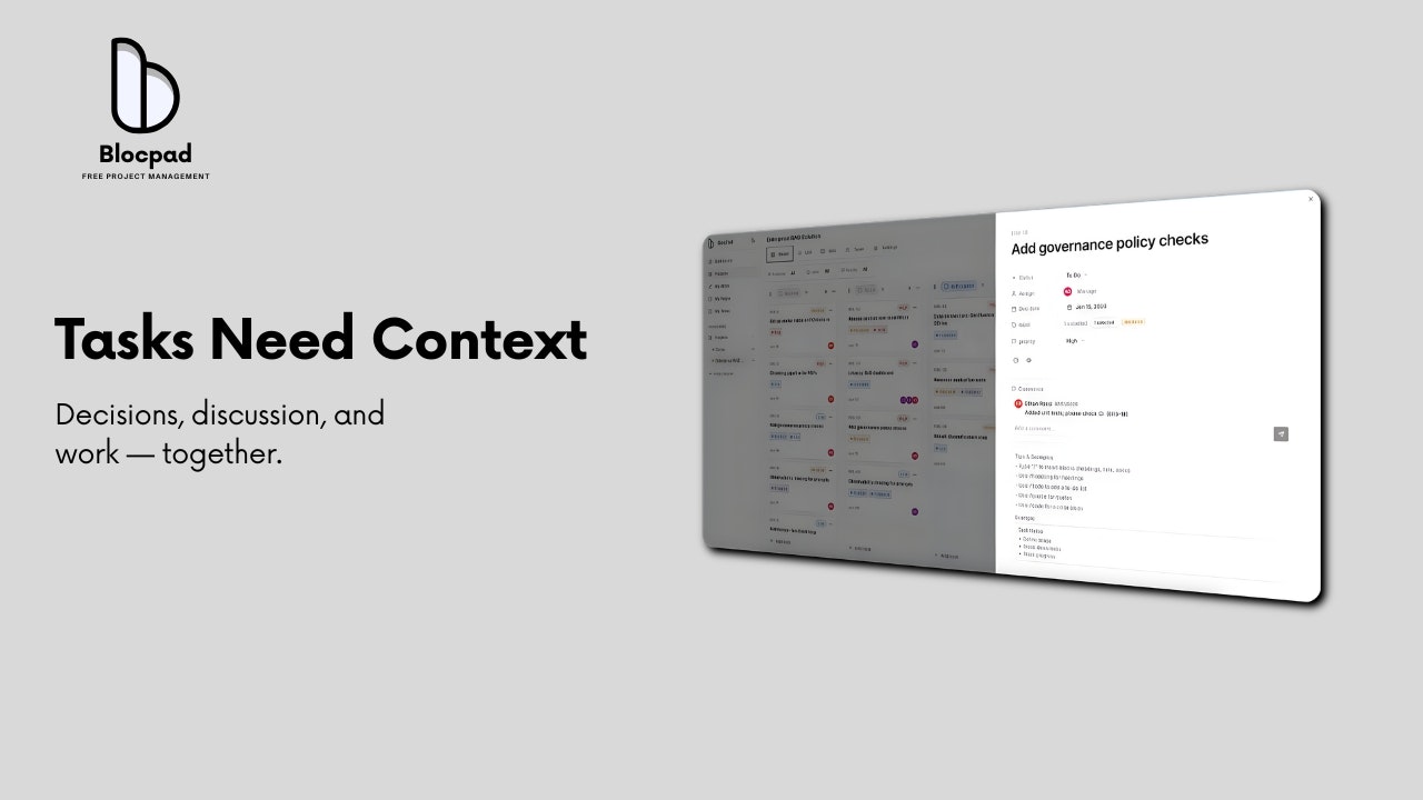 BlocPad is a modern project management app built on one belief: your work shouldn’t be used as leverage. Plan projects, manage tasks, and document decisions in one place—kanban boards, task details with context, and a built-in wiki that lives with the work. No mid-project paywalls. No sudden lock-ins. Built for real teams doing real work.