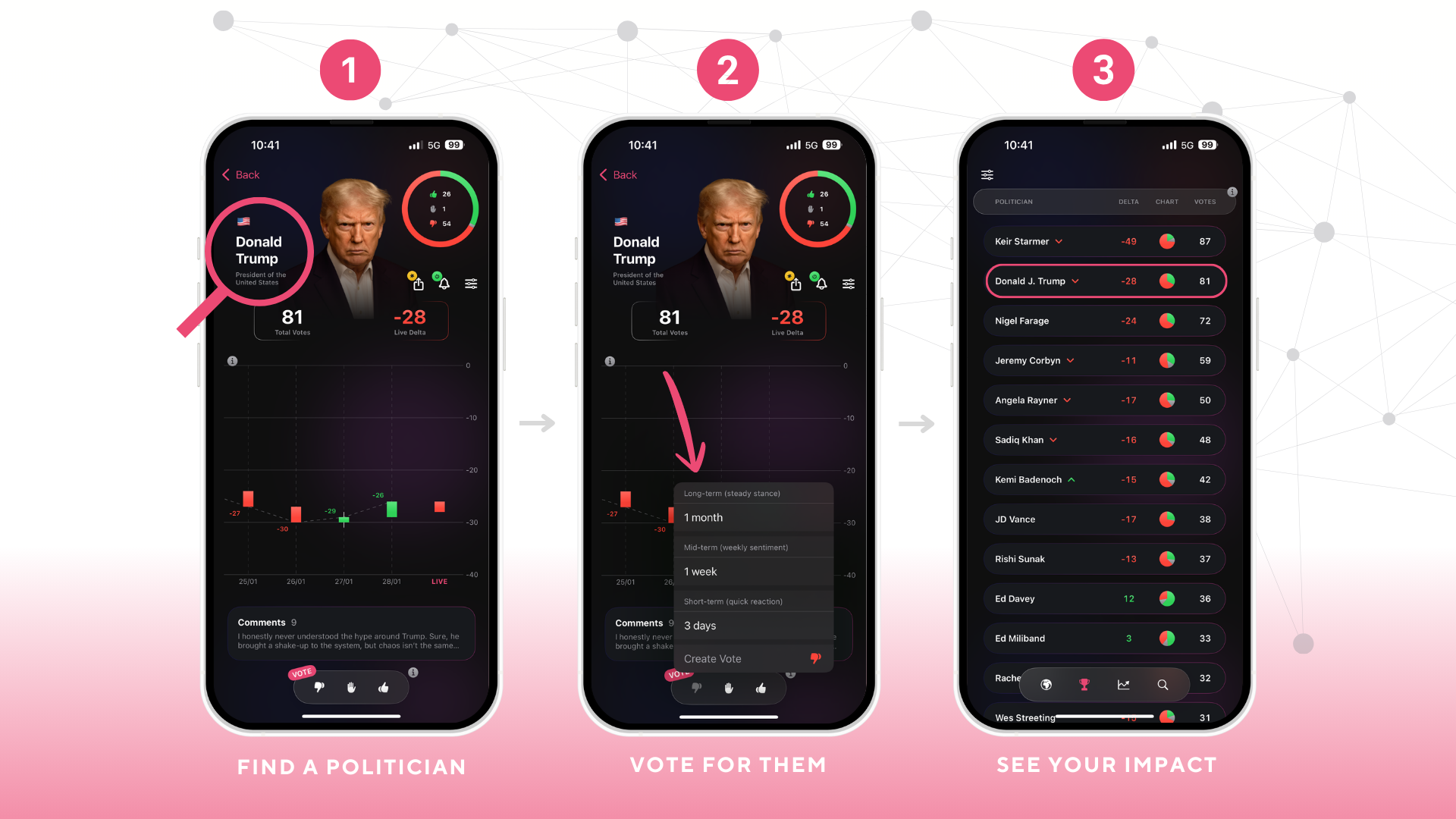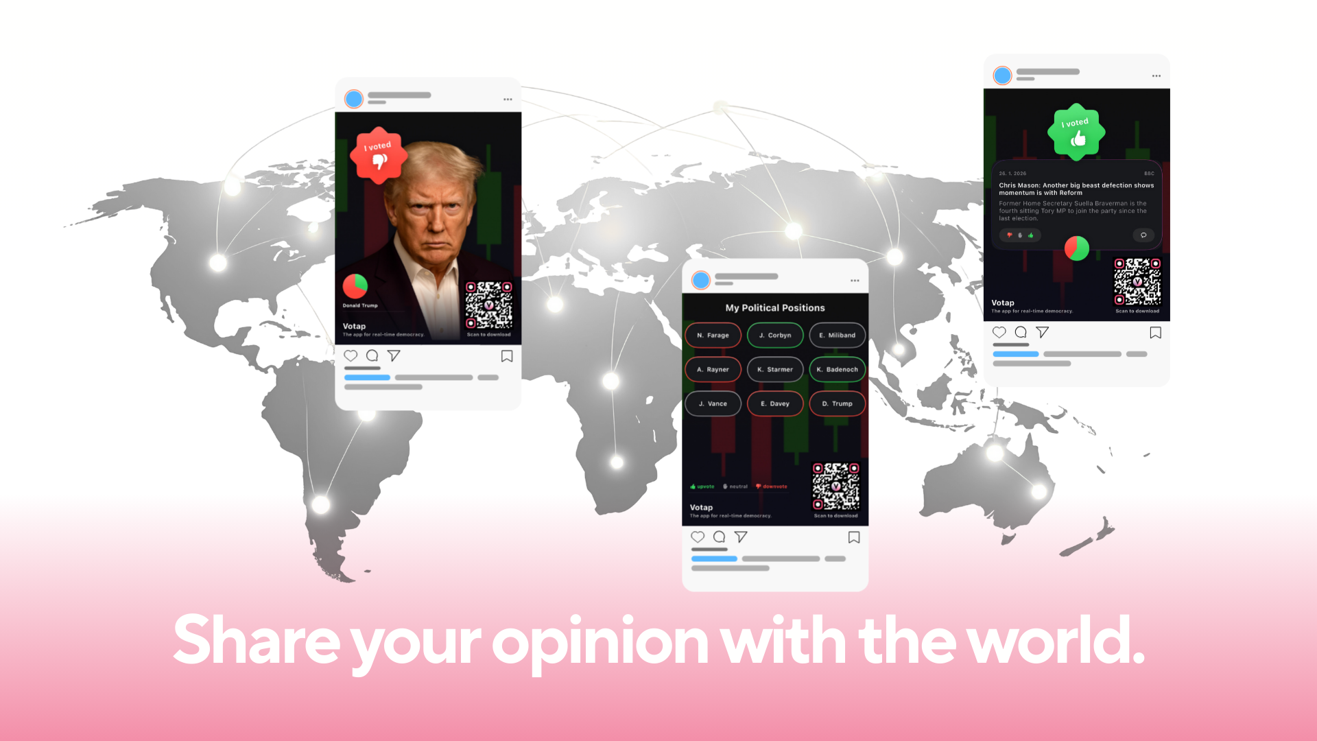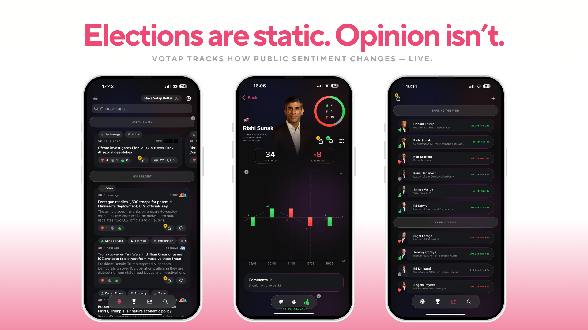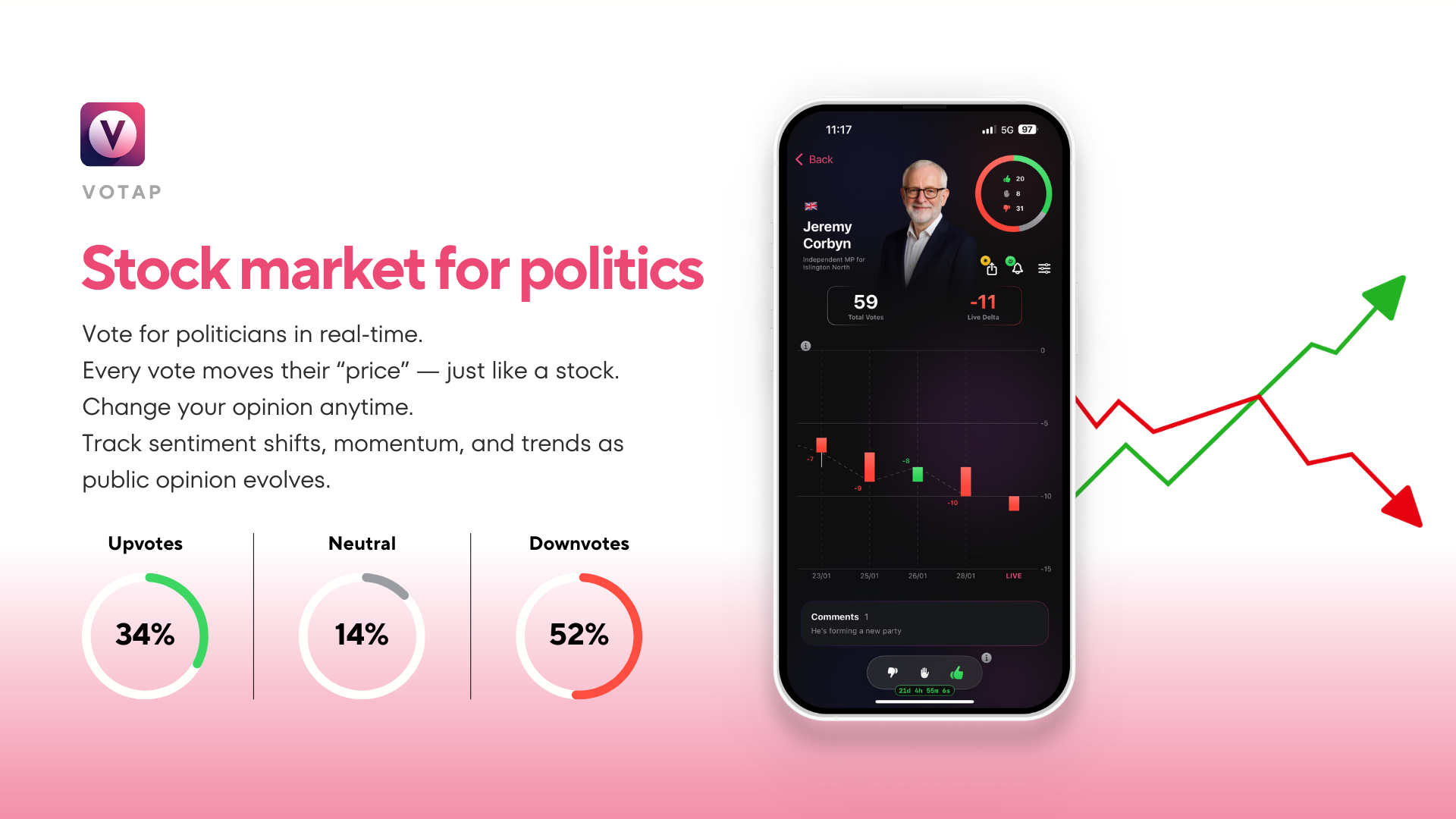 Votap is like Google Reviews, but for politicians. Tap to upvote or downvote—and see thousands of votes move the chart live.