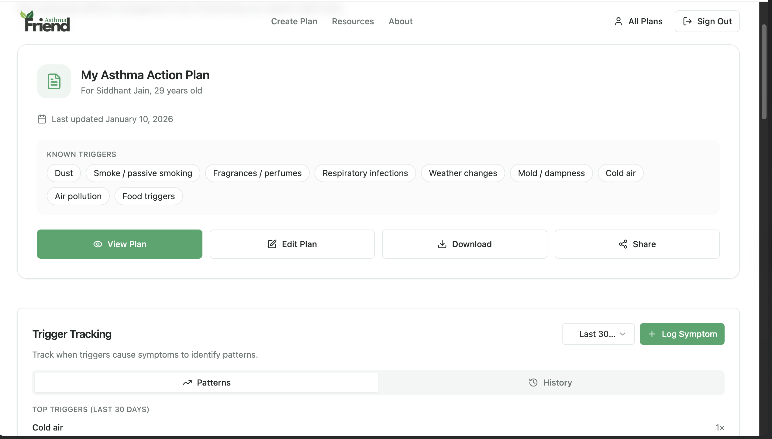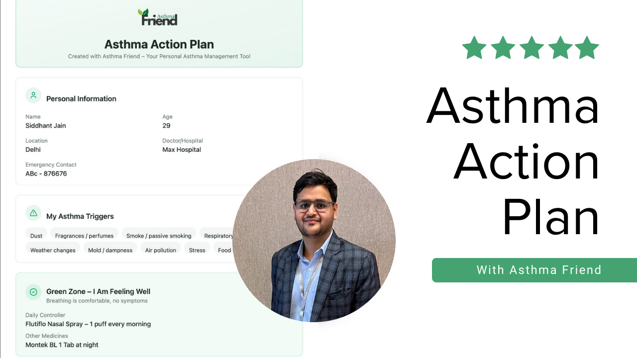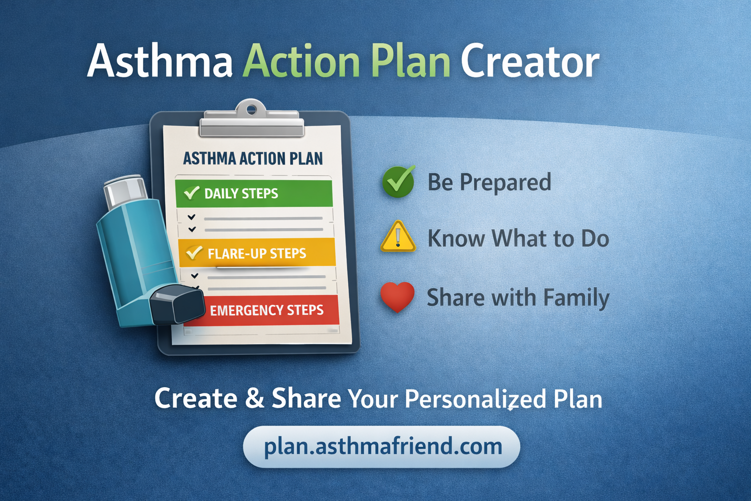 A free asthma action plan generator to help patients, parents, and caregivers know exactly what to do when symptoms worsen. Create a clear, personalized plan in minutes, built from lived asthma experience to reduce panic and bring clarity during real-life asthma emergencies.
