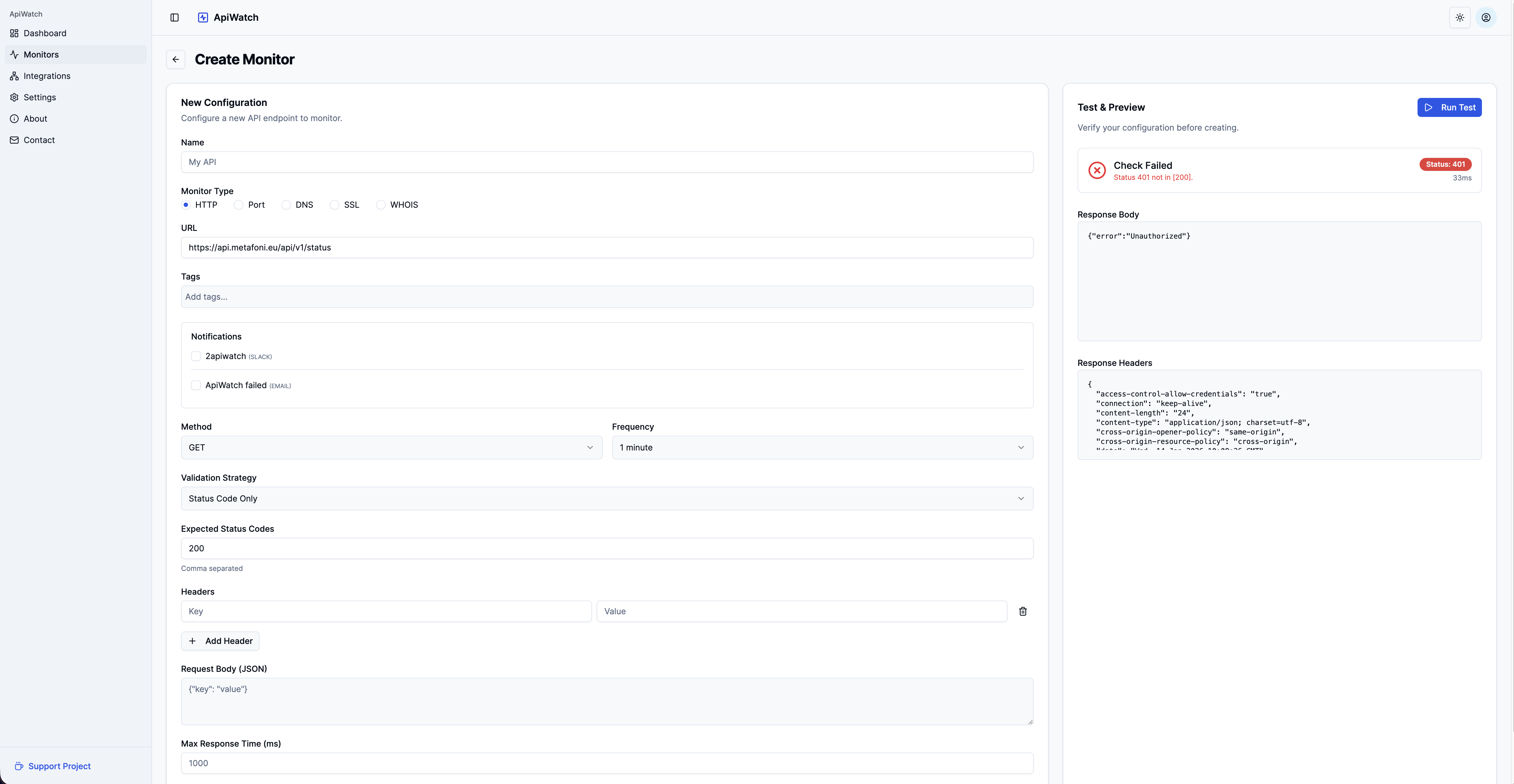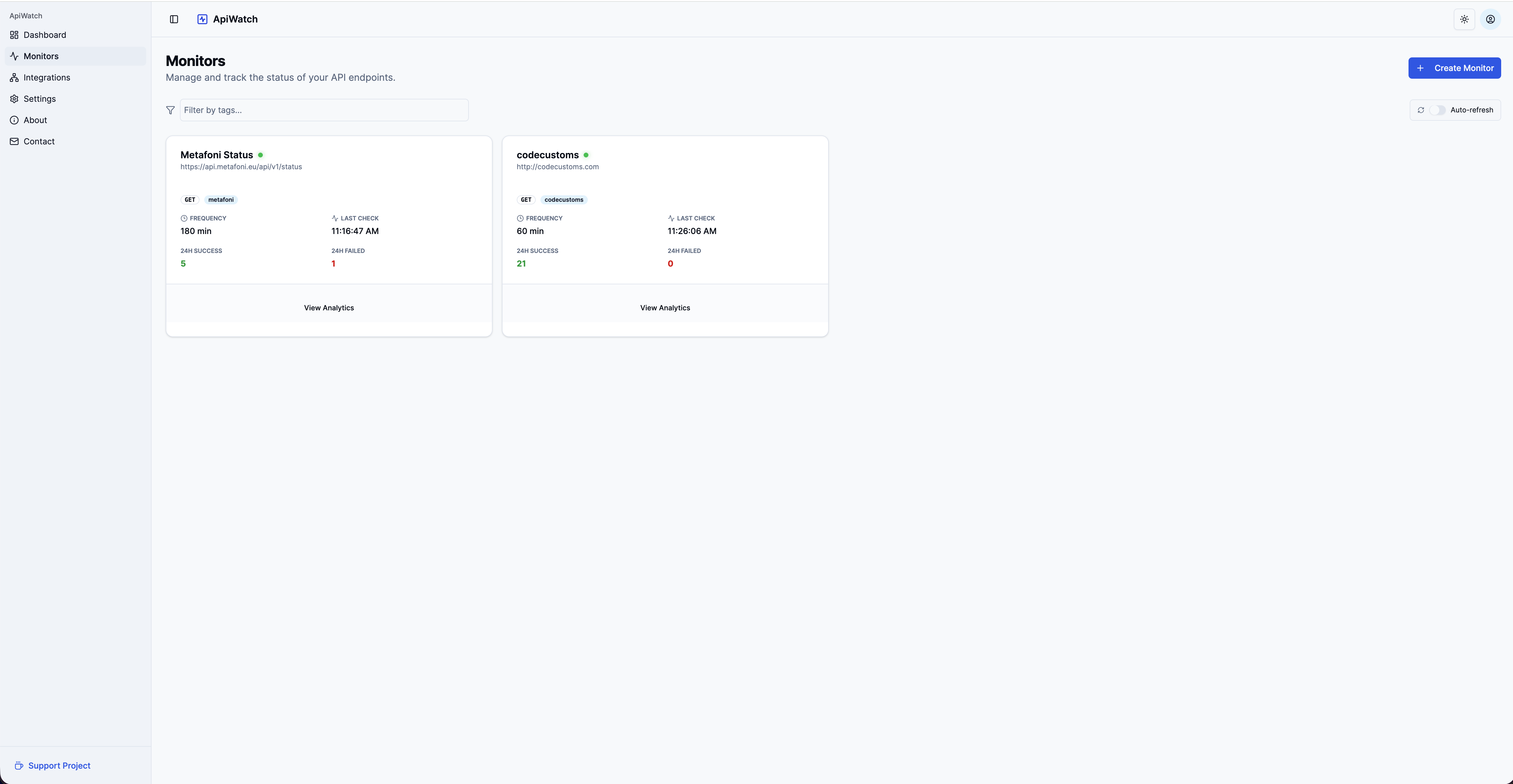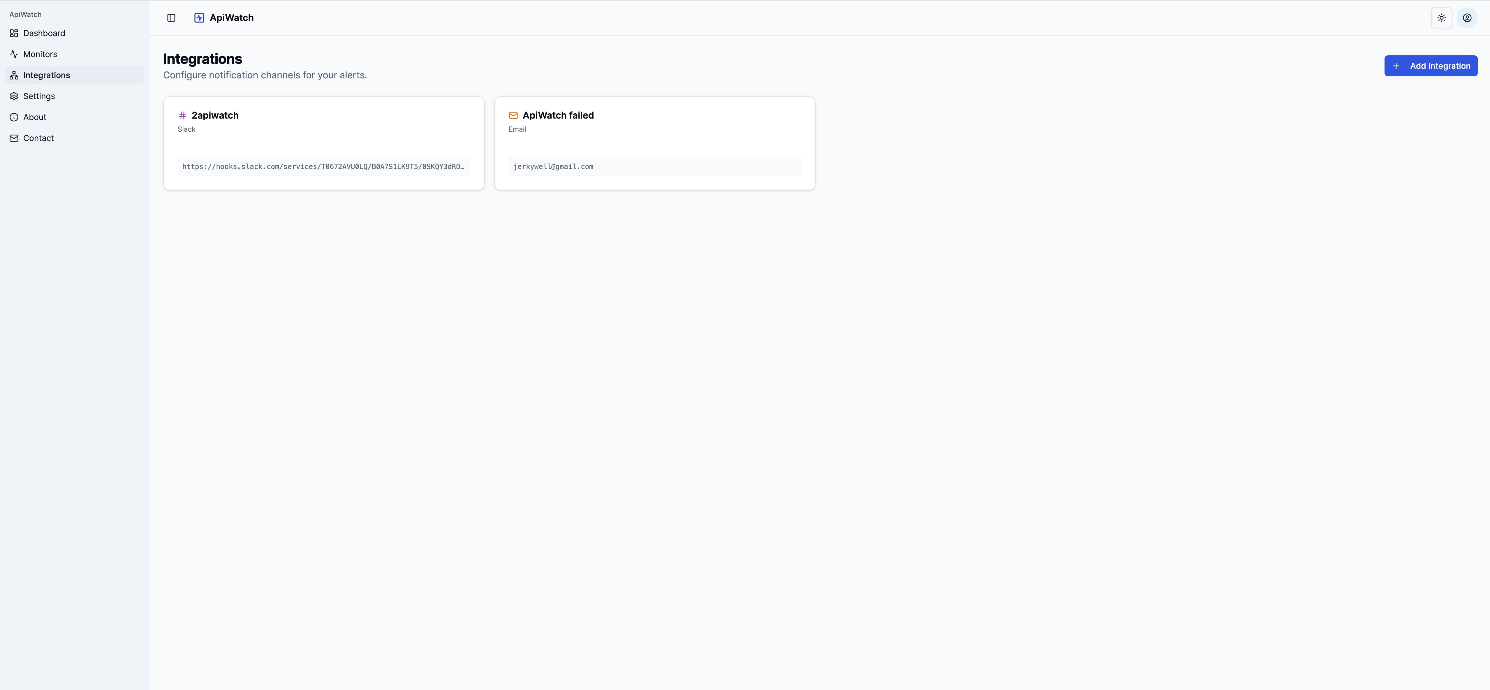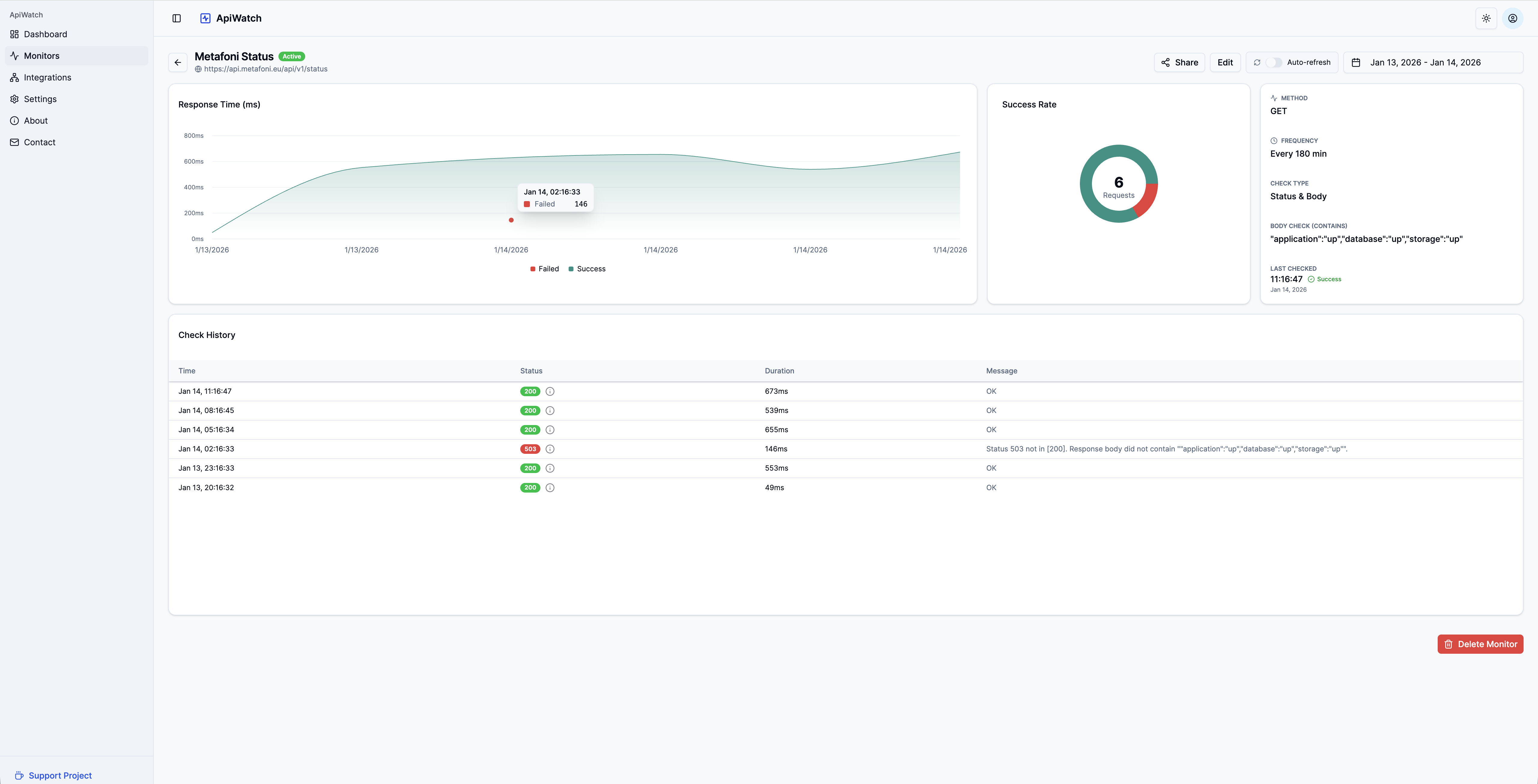 ApiWatch - Modern API Monitoring and Observability Platform. Checks endpoints on a schedule and alerts you when something breaks. Track incidents automatically, see response-time trends, and share a clean status page with customers. Supports HTTP checks and common failure signals (timeouts, status codes, keyword mismatch) so you know not only that it’s down—but why.