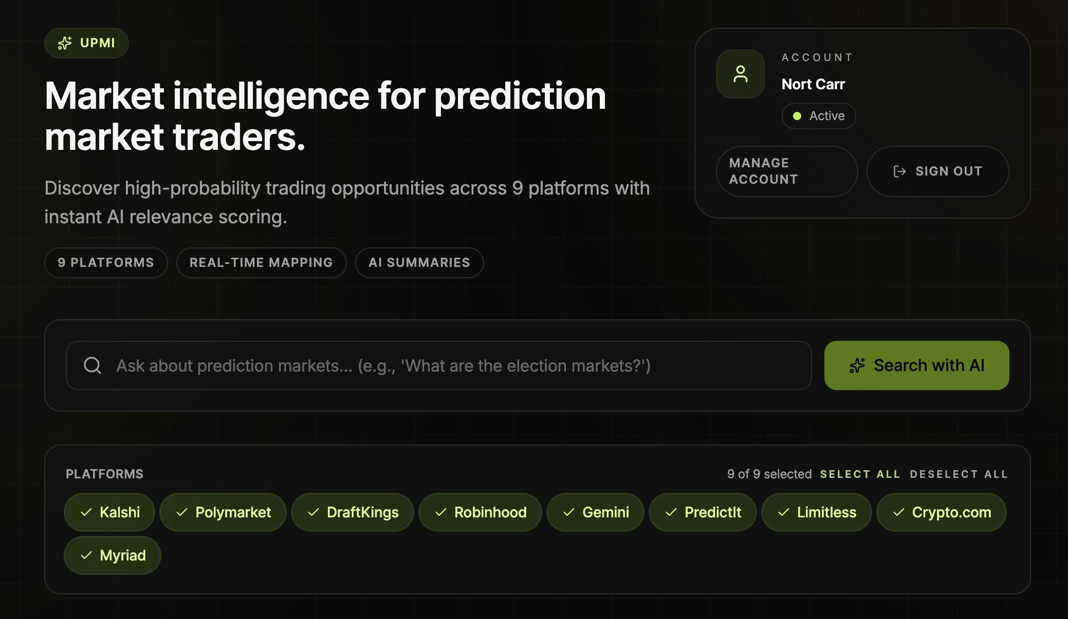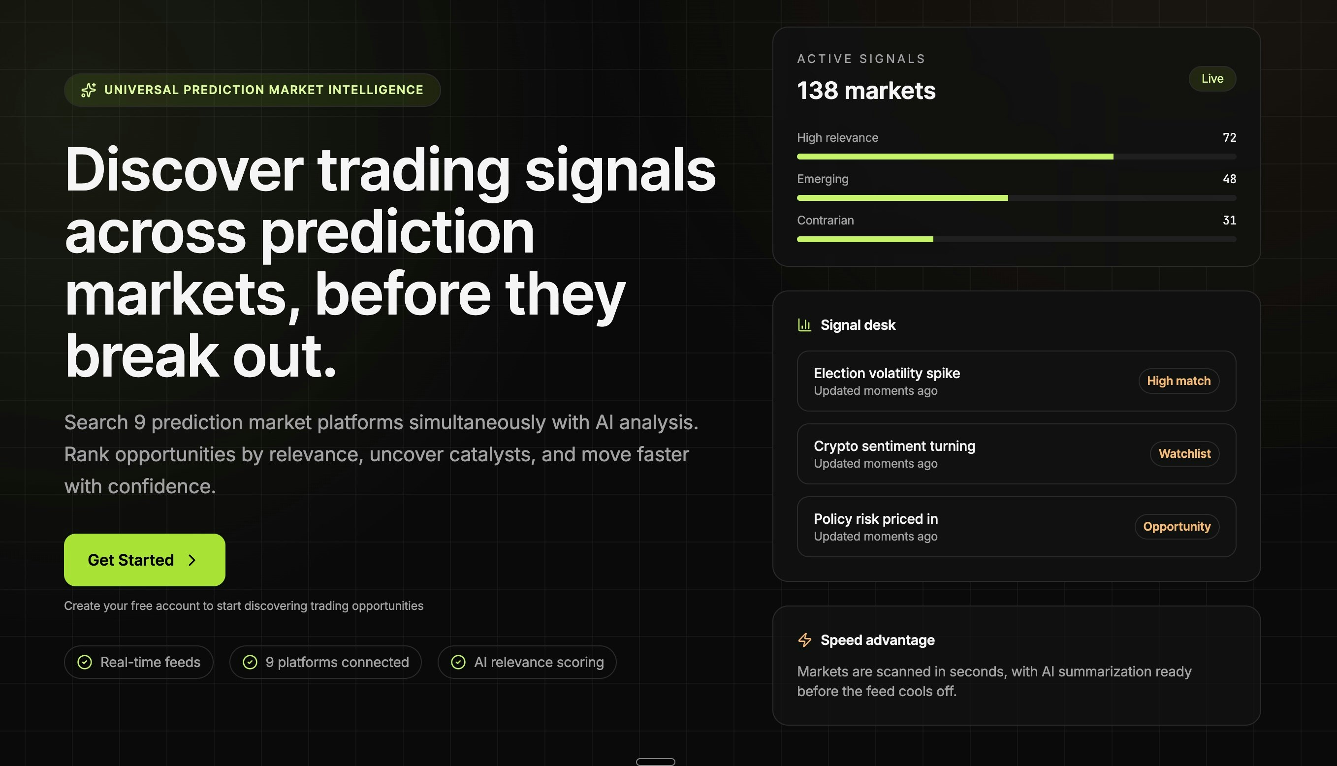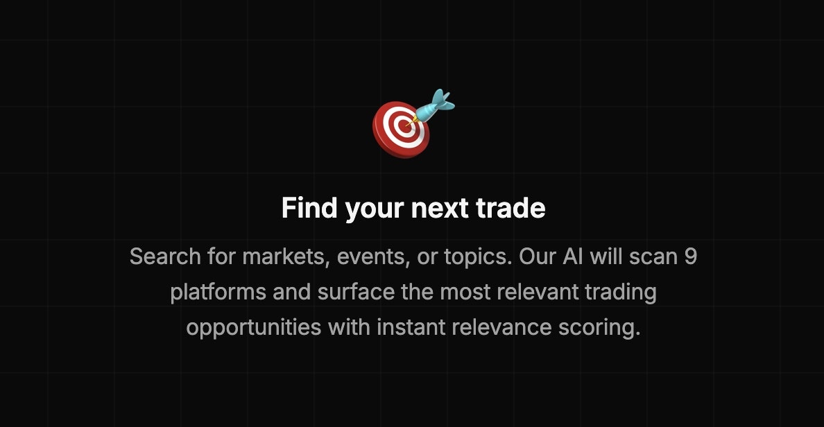 Professional-grade AI analysis of prediction markets across 9 major platforms. Make smarter trading decisions with real-time market discovery, relevance scoring, and deep analysis. Built for active traders and retail investors.