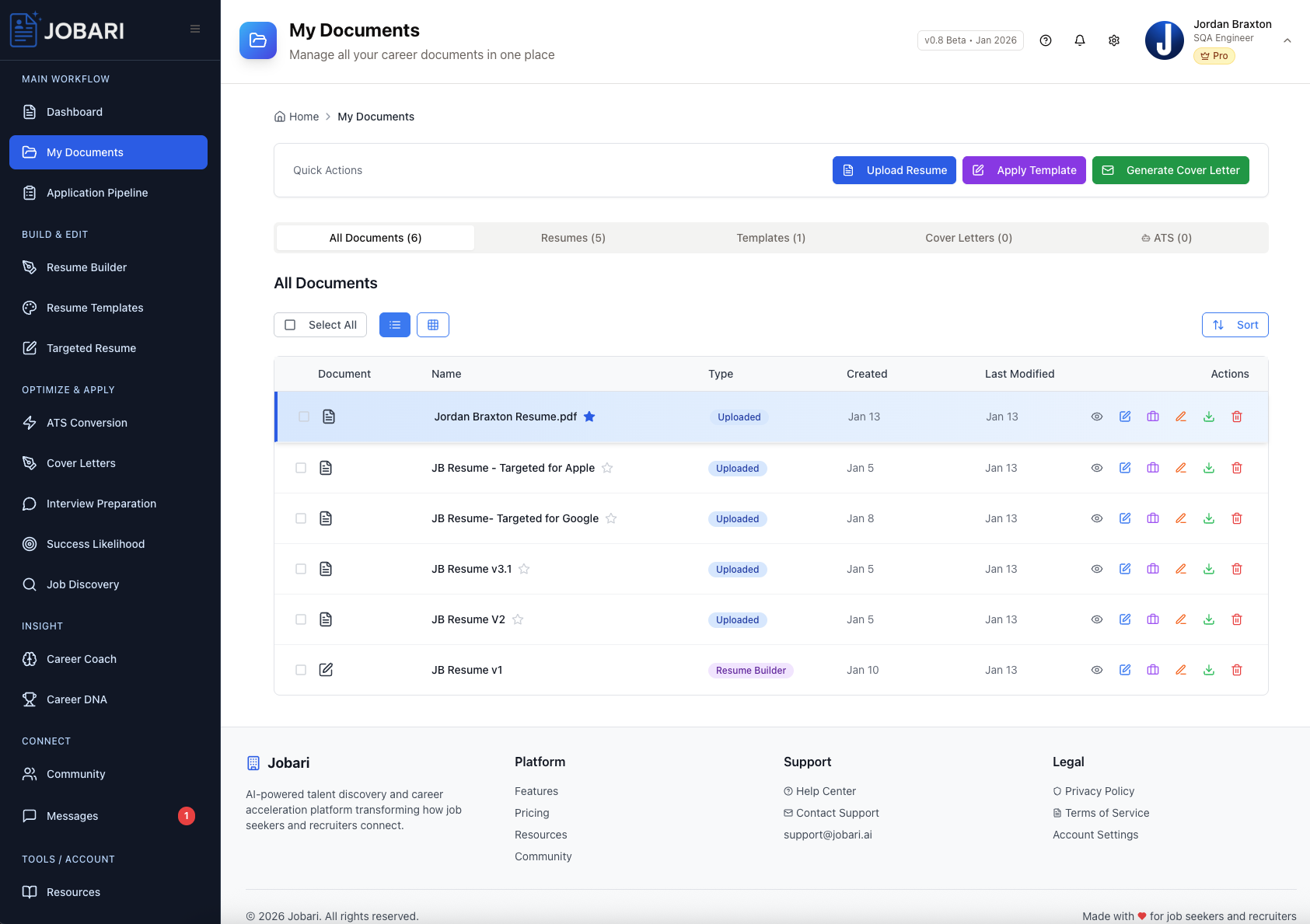 Jobari is an AI-powered job search platform that helps you build, optimize, and manage your applications in one place. Upload or build a resume, set a default, optimize for ATS, apply templates, and save versions. Create targeted resumes and cover letters, prep for interviews, get resume-aware AI career coaching, track applications in a Kanban board, and see how well your resume matches a job posting.