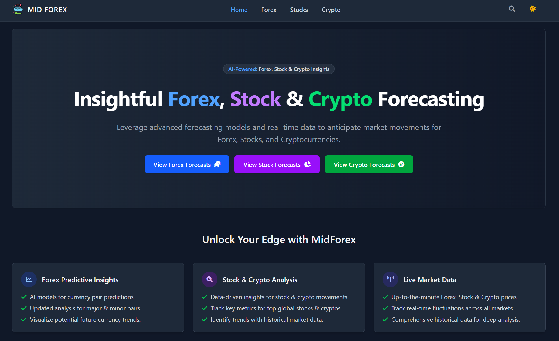 MidForex empowers traders and investors with real-time Forex rates, live stock prices, and up-to-date cryptocurrency data, all backed by AI-driven forecasts. Using decades of historical data, advanced algorithms, and continuous market updates, we deliver clear, actionable insights. Whether you're an experienced investor or just starting out, MidForex is your reliable partner for navigating Forex, stocks, and crypto markets with confidence and data-driven precision.