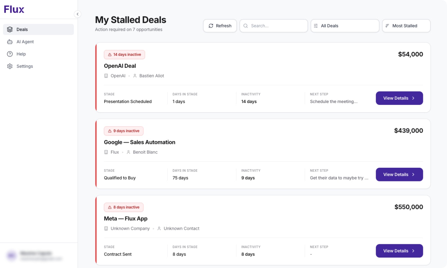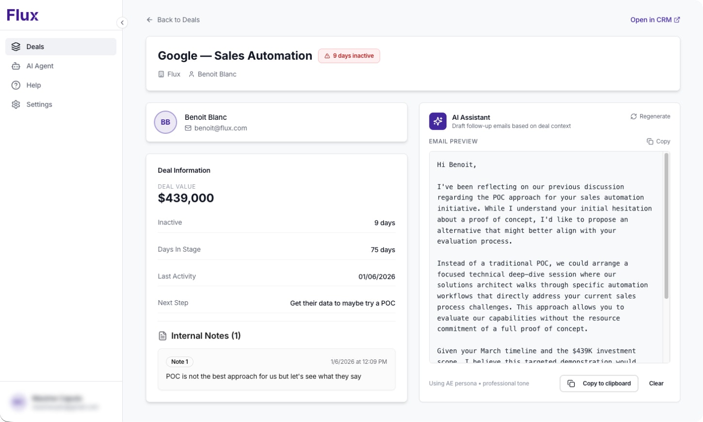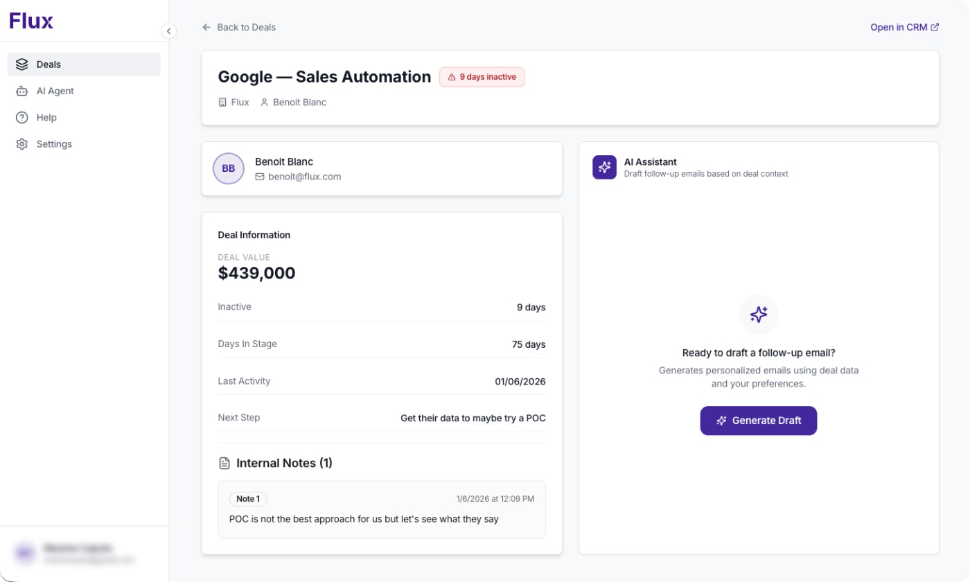 Flux automatically tracks inactive deals in your HubSpot pipeline and generates personalized AI follow-ups in seconds. Connect your account, identify stalled opportunities, and re-engage with better emails. Free for your first 5 deals.