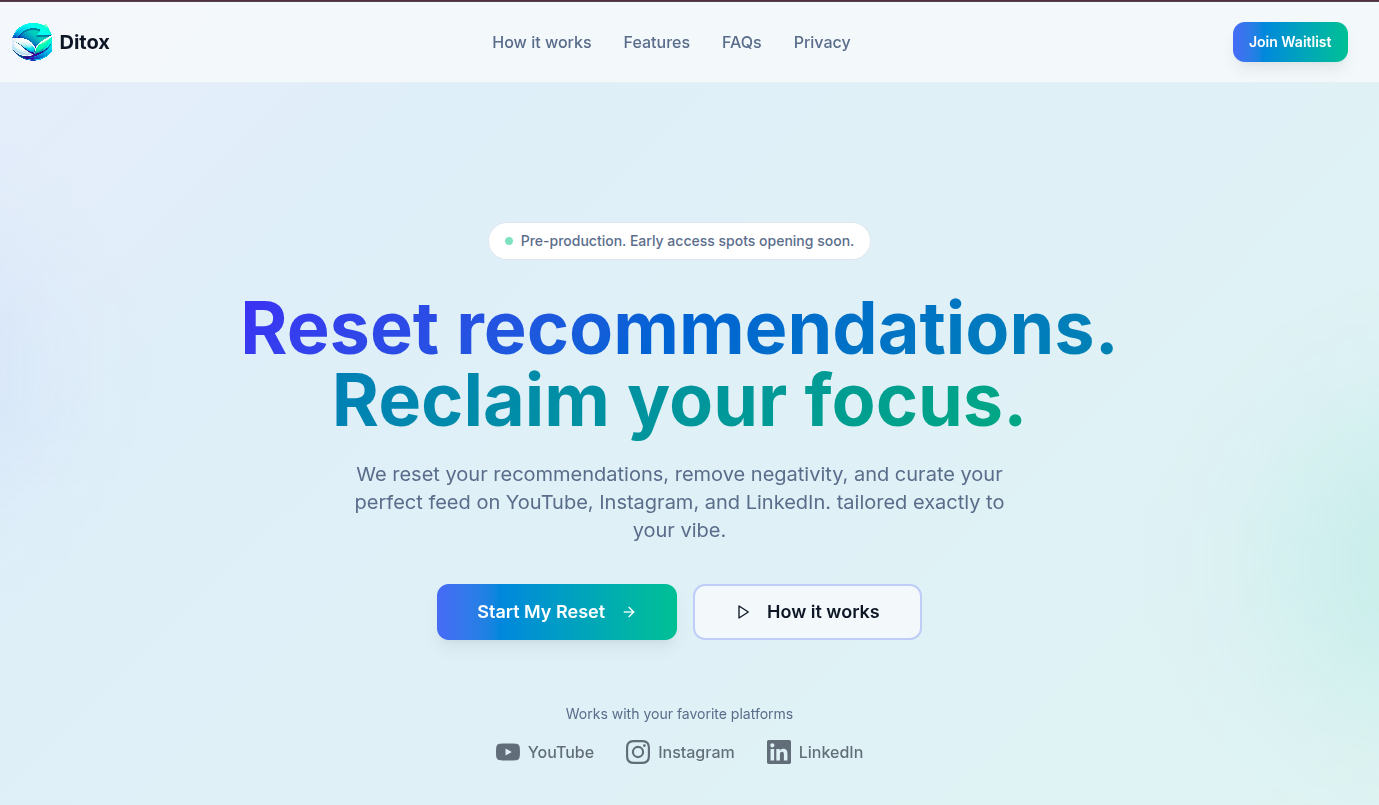 Ditox is a digital detox service that resets your social media recommendations and rebuilds your feed around what actually matters to you. We remove toxic, low-quality, doomscrolling content from YouTube, Instagram, and LinkedIn — and retrain the algorithm using curated, high-signal content. Get a clean slate. No rage bait. No engagement traps. Just the feed you actually want.