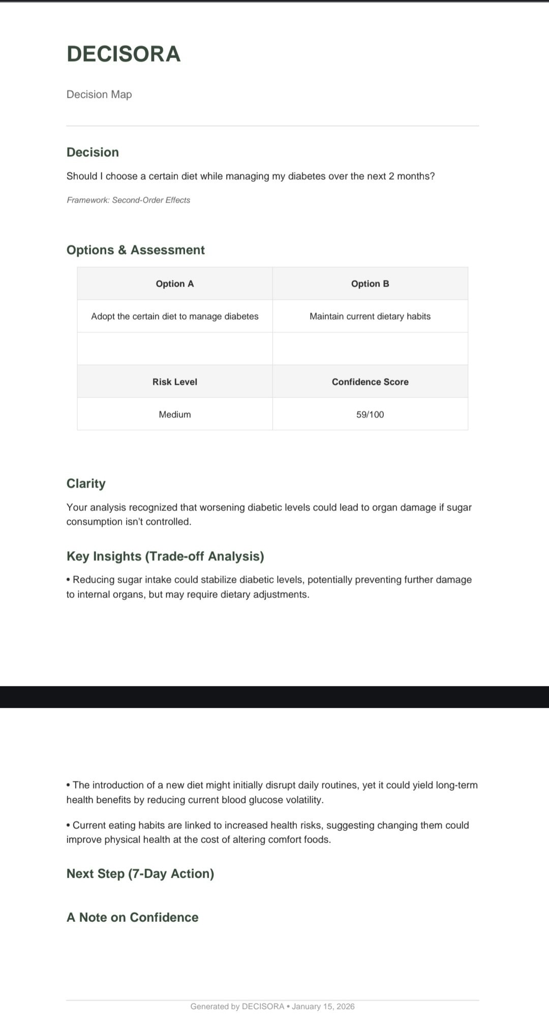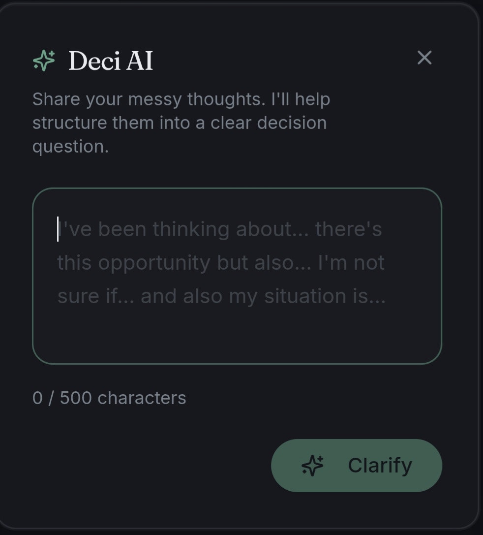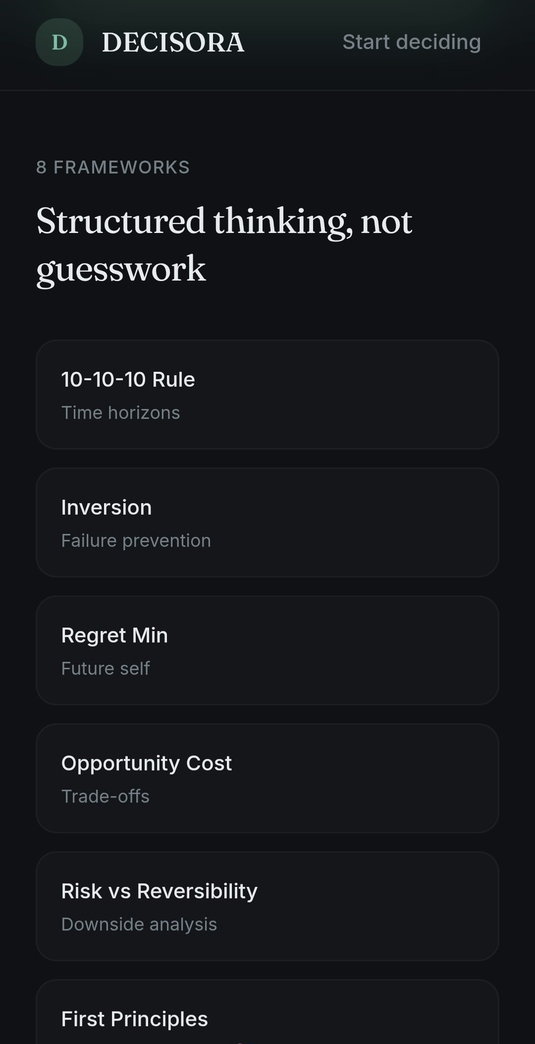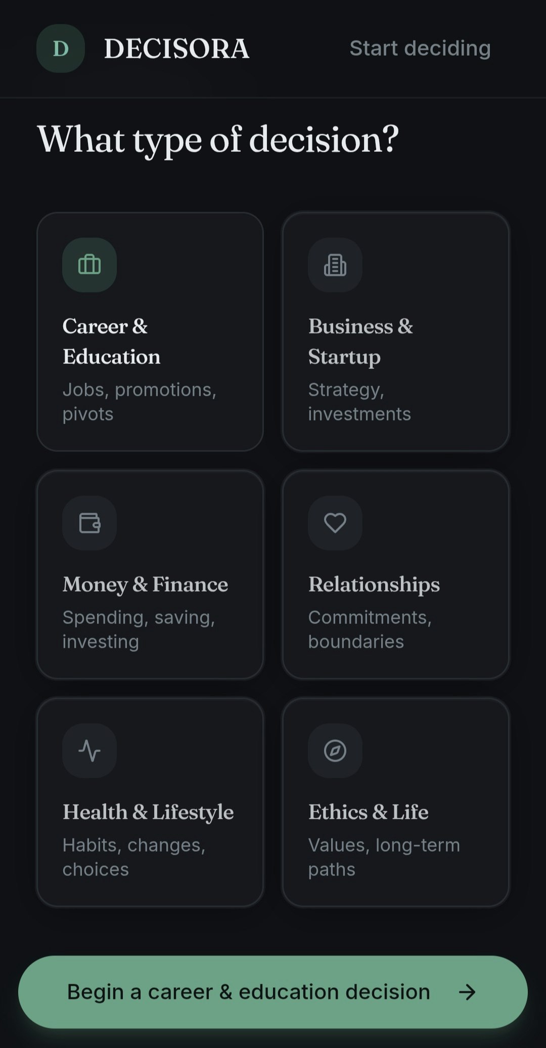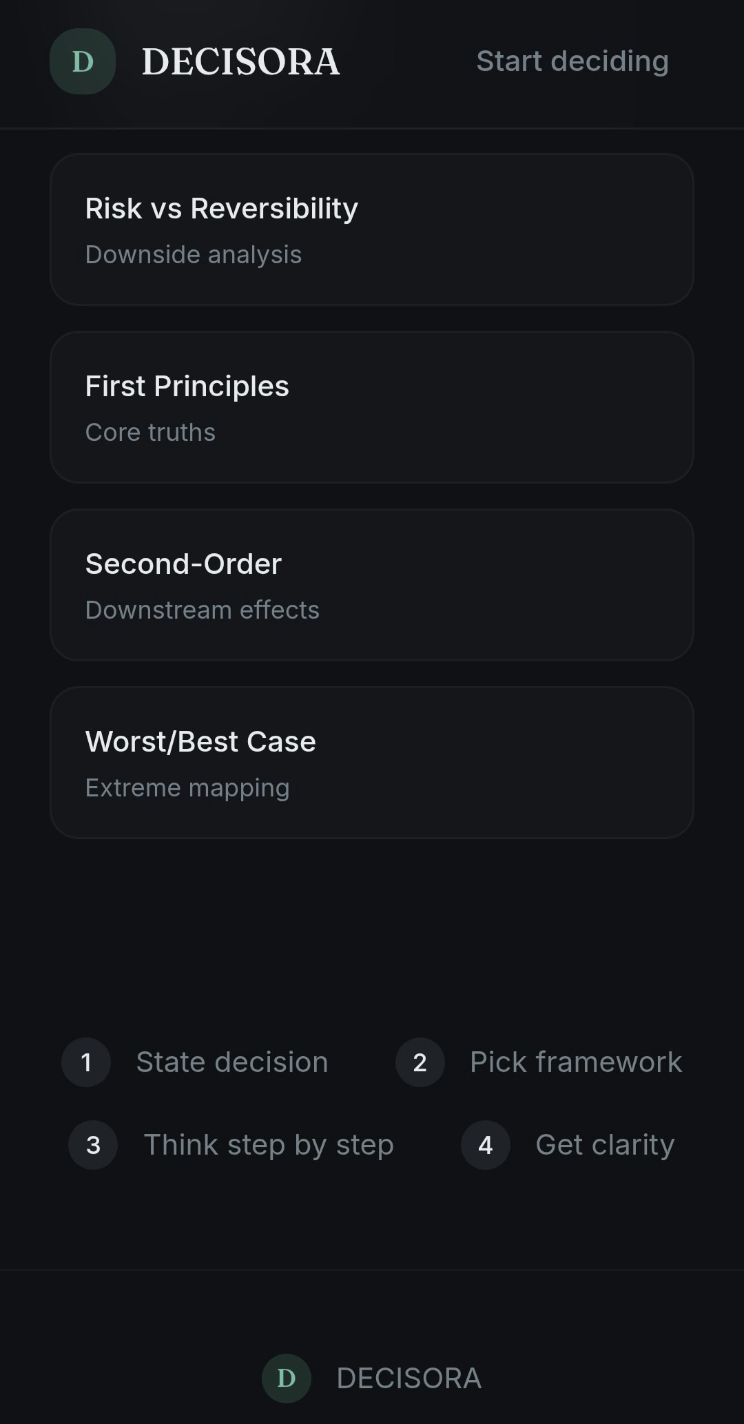 Decisora is a decision-thinking tool designed to help people slow down and reason clearly. Instead of giving advice or motivation, it structures decisions into trade-offs, priorities, and consequences so users can see their options more objectively. It’s built for students, founders, and early-career professionals who want clarity over noise.