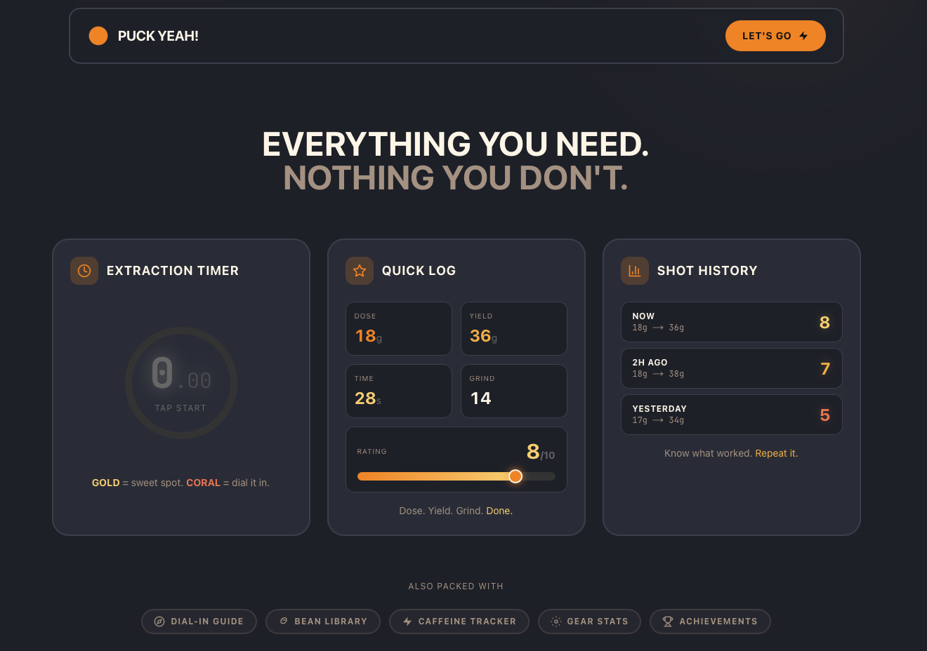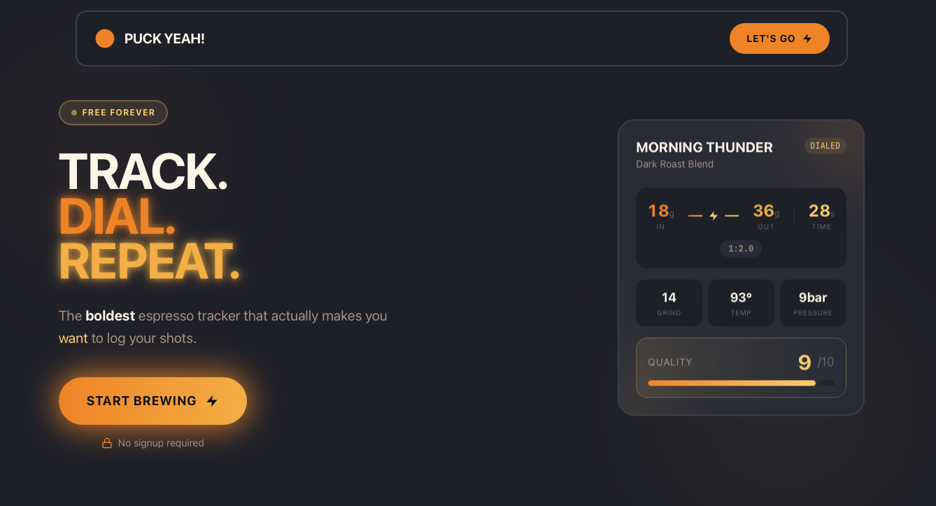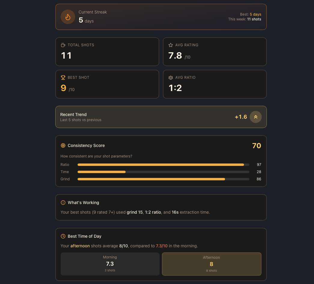 The boldest espresso tracking app that actually makes you want to log your coffee. Track your shots. Nail your ratio. Get caffeinated. Features include a shot timer, a bean library, an extraction compass for visual dial-in feedback and a caffeine tracker. Completely free with no account or sign up required.