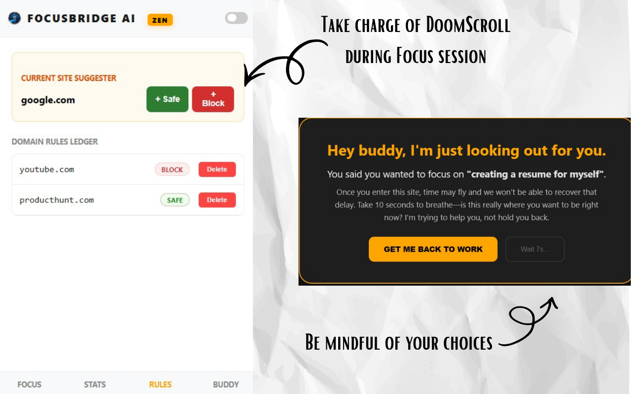 FocusBridge AI is a 100% private productivity engine. Unlike rigid site blockers, it uses on-device SLM AI to semantically analyze tab context, nudging you only when content deviates from your goal. Key standouts: a snappable Pomodoro bubble with progress rings, a 10s 'Buddy' pause for restricted domains, and 31 daily discipline blueprints. It includes Android-style wellbeing stats to track weekly flow. It doesn't just build walls; it acts as a bridge between your intent and your output.