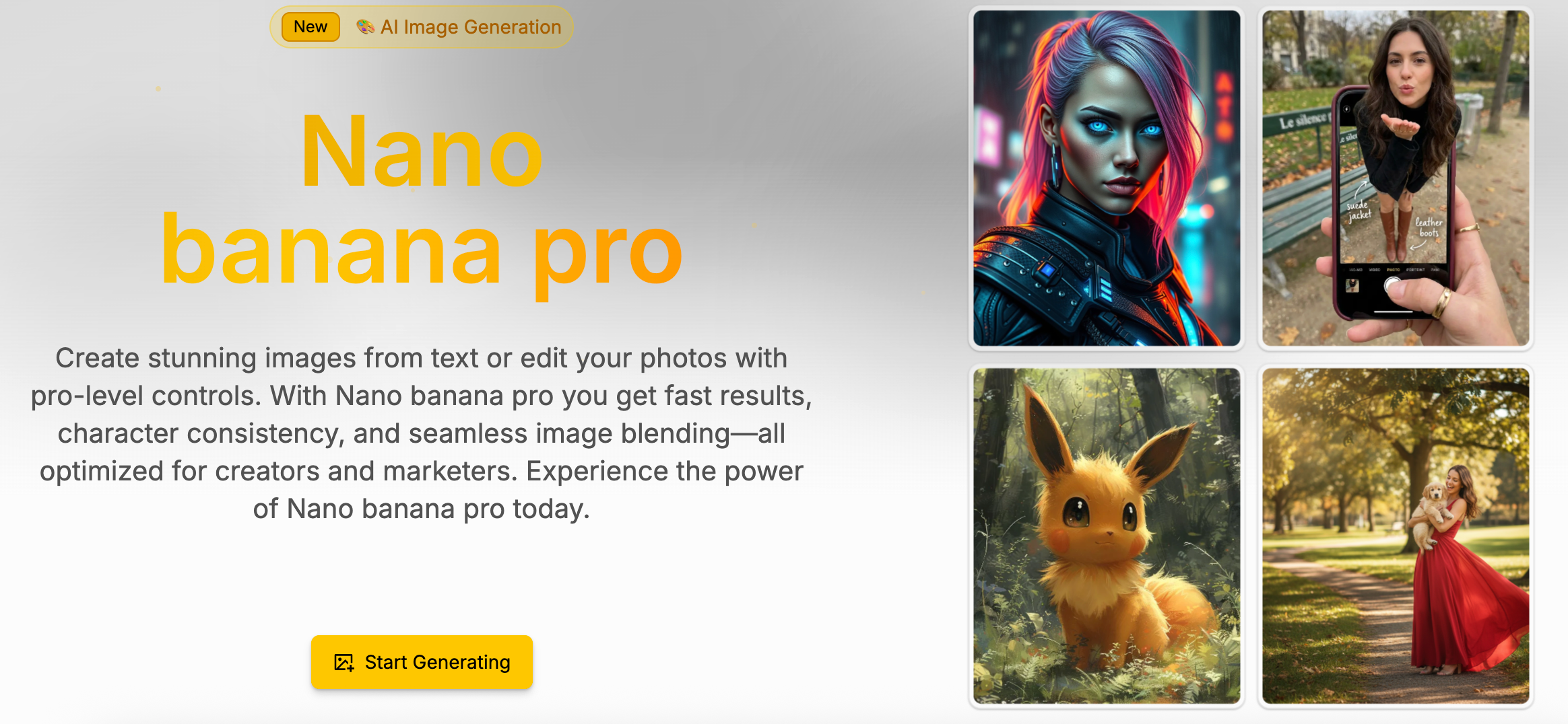 An AI image generation platform powered by Nano Banana, enabling users to create and edit high-quality visuals through simple text commands with exceptional character consistency.