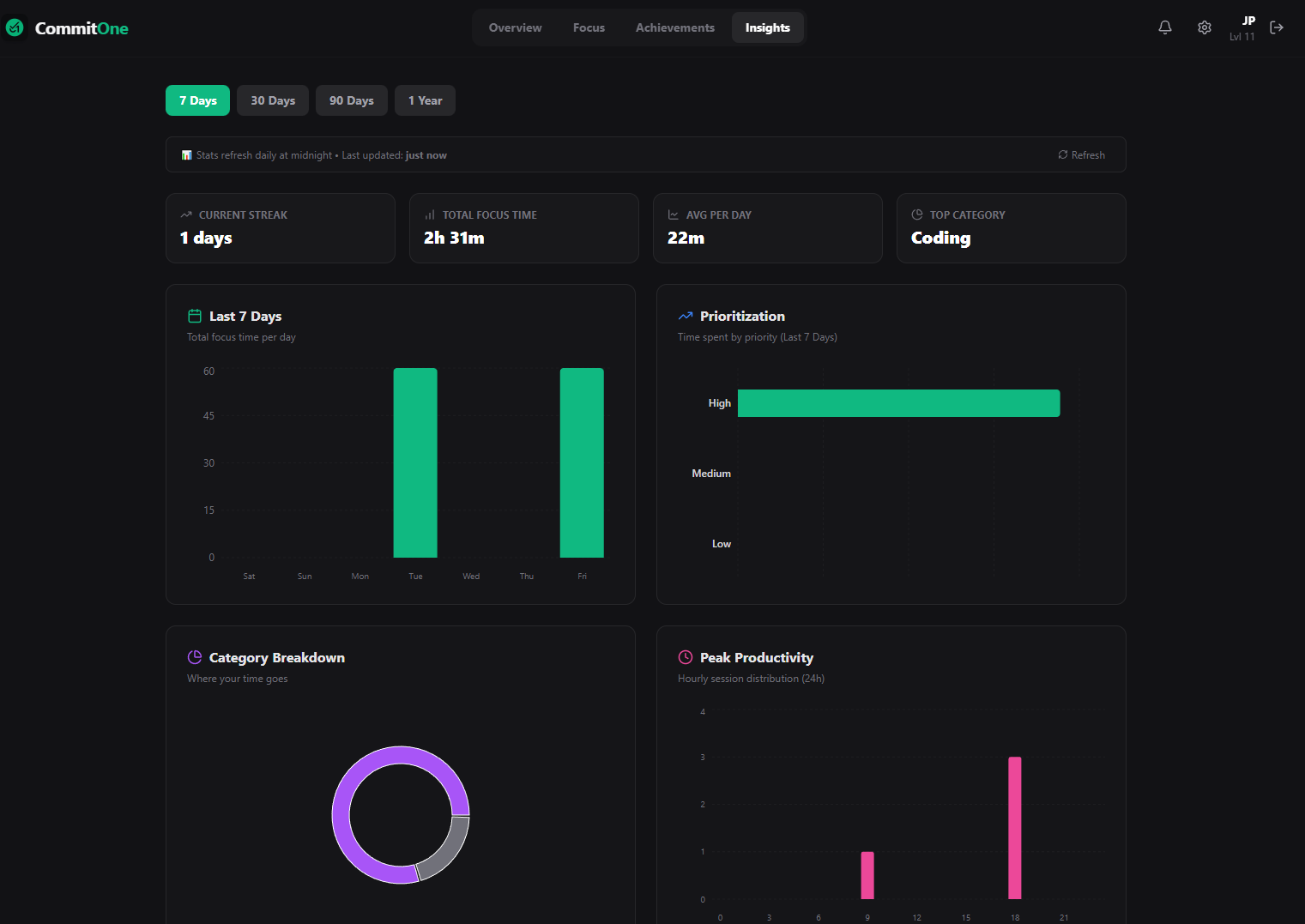 I built CommitOne to solve my own problem. I wanted a system that wasn't just a boring checklist, but actually felt rewarding. The core concept is simple: Turn daily habits into a visual heatmap (like GitHub). It includes: 1. A Focus Timer (with different modes) 2. XP/Leveling system 3. Insights to reveal your patterns It’s not perfect yet. I’m an engineer, not a designer, so I’m sure there are rough edges. I’m looking for feedback from other people who struggle with consistency.