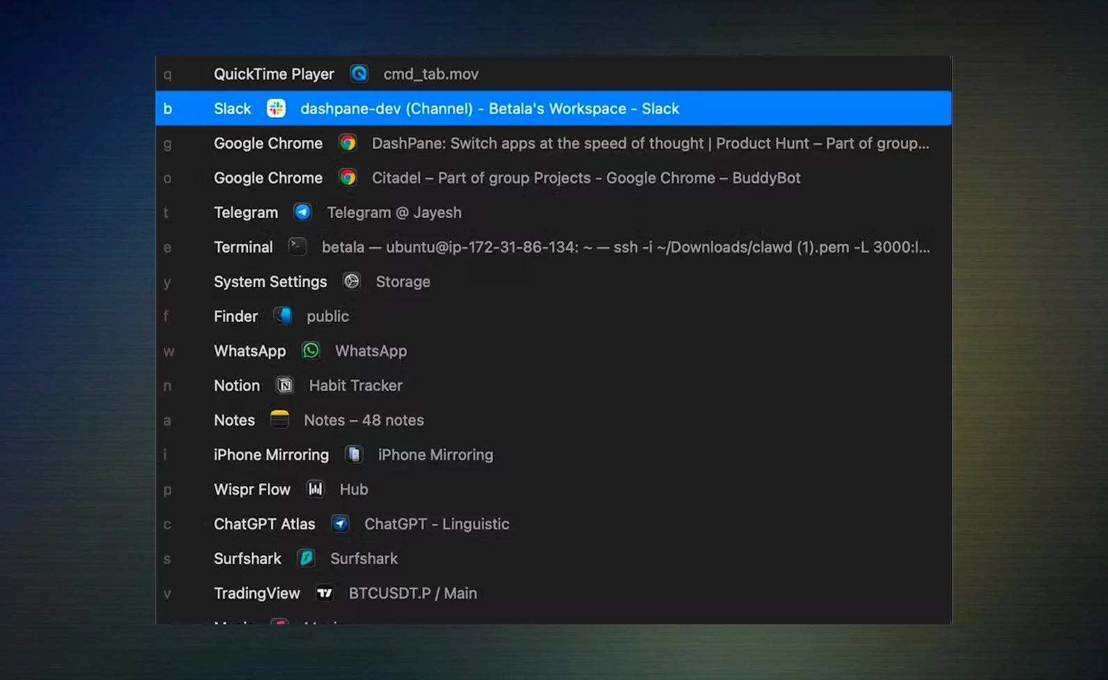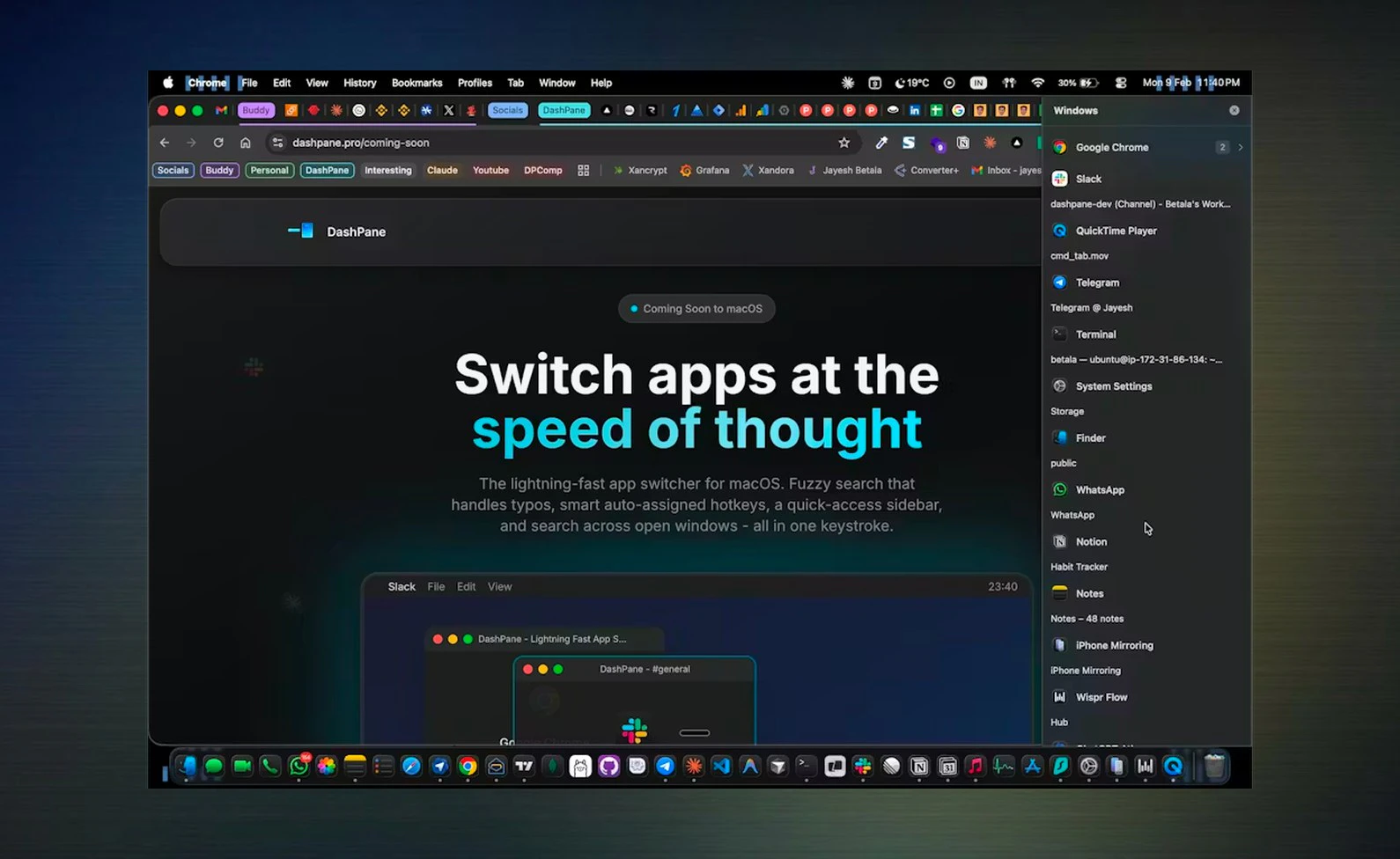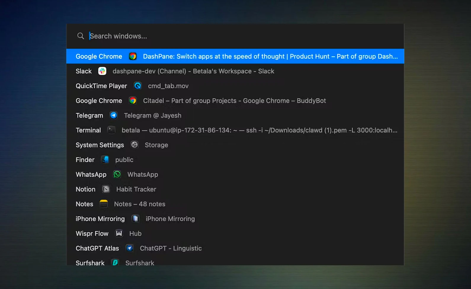 DashPane is a lightning-fast window switcher for macOS. Stop cycling through apps with Command-Tab. Just press a shortcut, type a few letters, and instantly jump to any window. Fuzzy search, gesture sidebar, multi-display support