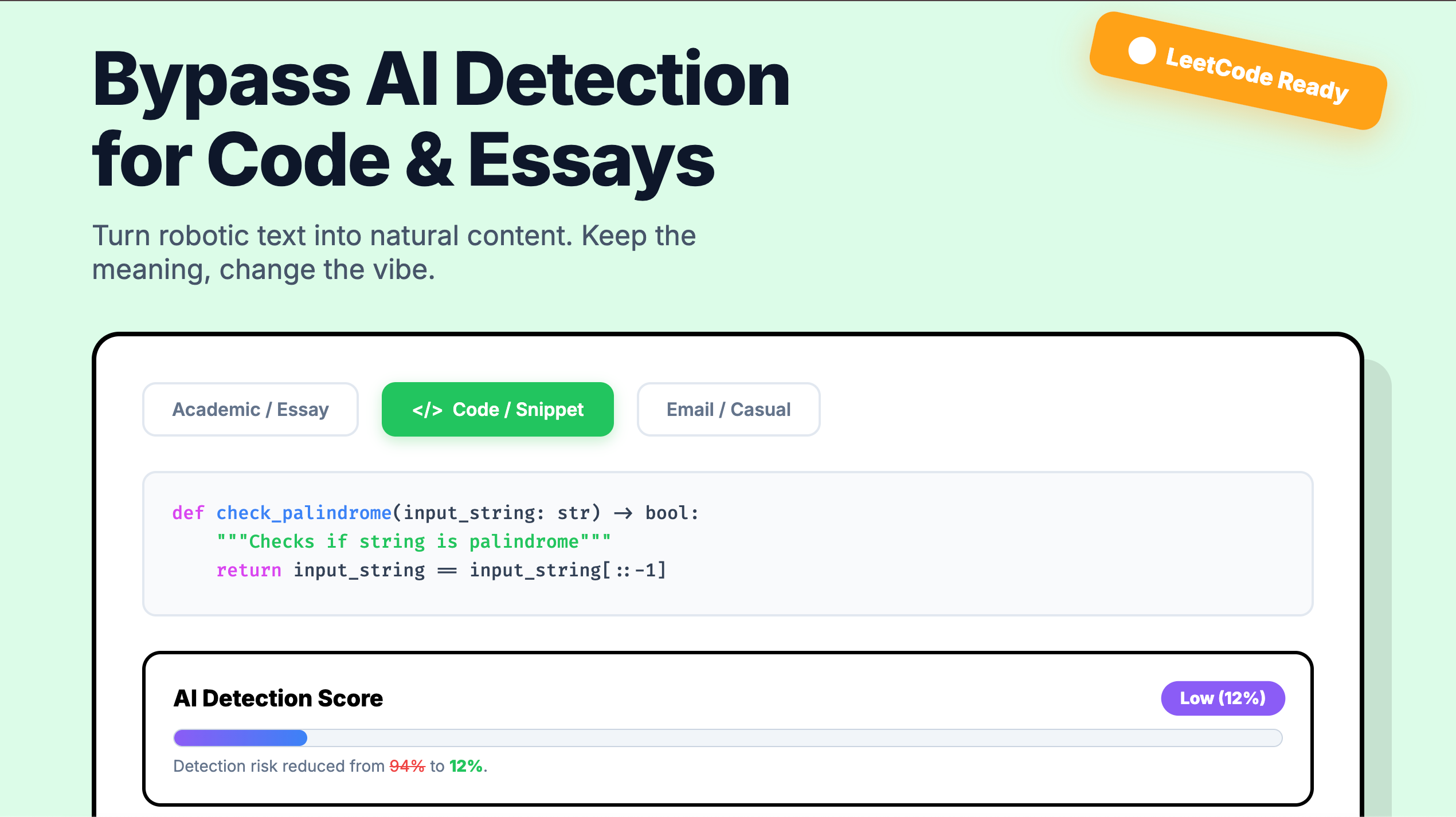 Unlike generic text spinners, CleanMyAI is purpose-built for the **DeepSeek R1 & Developer** workflow. 1. Clean DeepSeek formatting:Instantly strips `` chains and converts raw Markdown to Word-ready Rich Text (preserving headers & bolding). 2. Humanize AI code instantly:Our exclusive Code Mode intelligently renames variables and adjusts logic structure to make LeetCode solutions or assignments look handcrafted, not AI-generated.