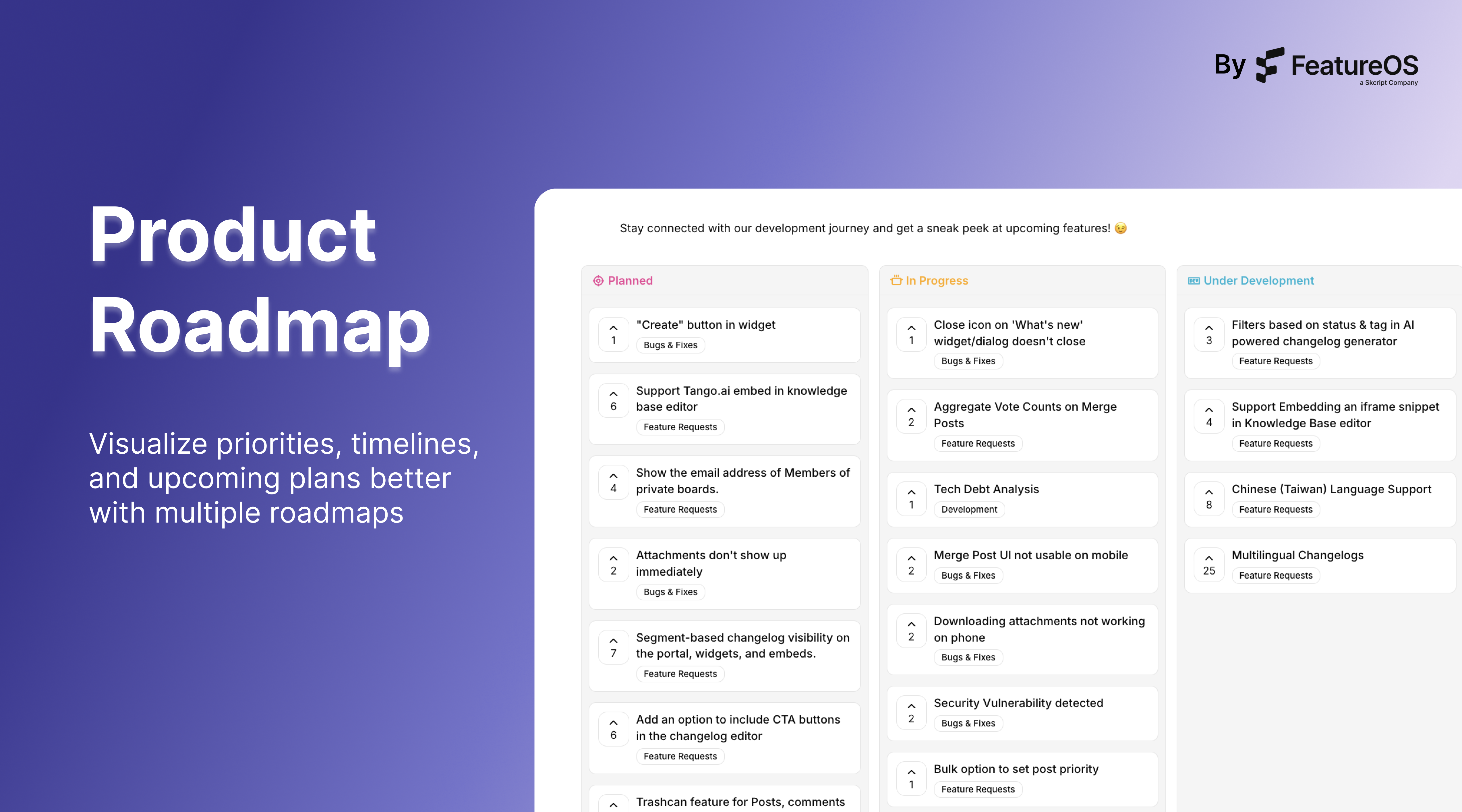 FeatureOS is now a complete product feedback and communication ecosystem, available on web and mobile for teams. Teams can collect feedback through smart forms, manage feature requests, plan roadmaps, publish changelog, and maintain a customer-facing knowledge base, all in one place. With the FeatureOS mobile app, team members can review feedback, track updates, and stay aligned on product decisions from anywhere, making it easier to support remote and distributed teams.