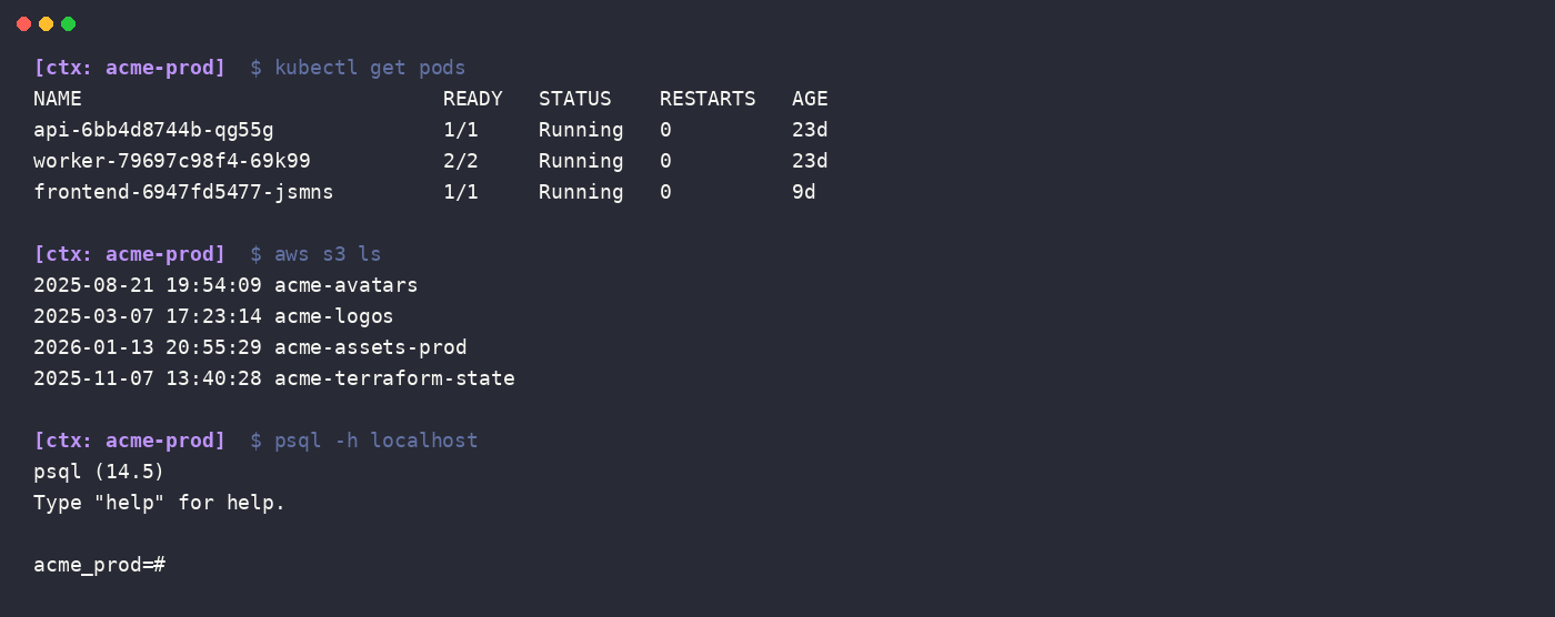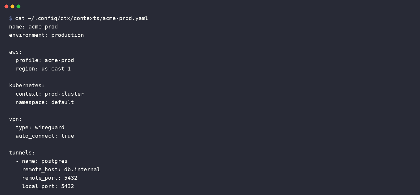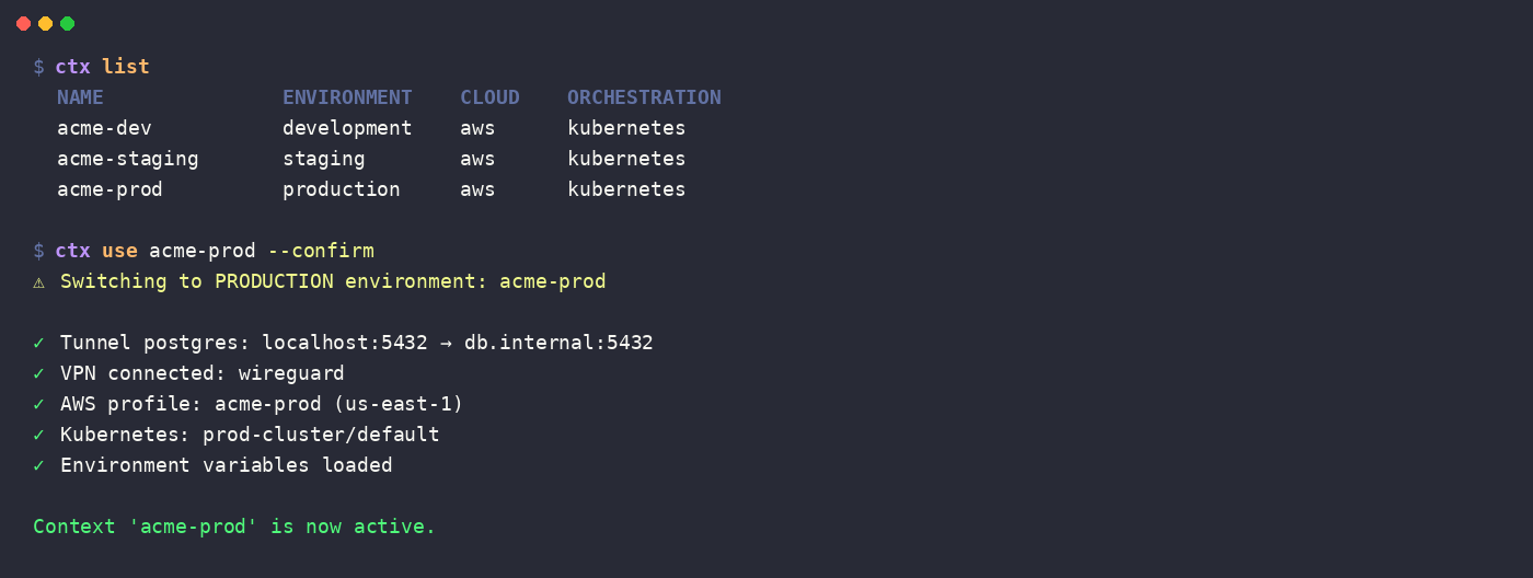 Most tools manage one piece: direnv for env vars, kubectx for K8s, aws-vault for AWS. You're still juggling multiple tools. ctx_ is different - it treats your entire DevOps environment (cloud providers, orchestration, tunnels, VPNs) as one switchable context. One command replaces dozens. It's stateful, meaning active SSH tunnels and connections switch too. Built for people managing 5+ environments daily.