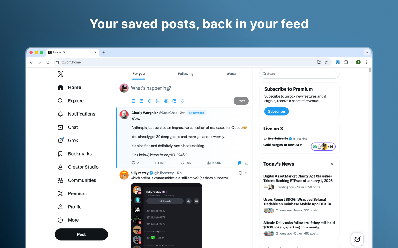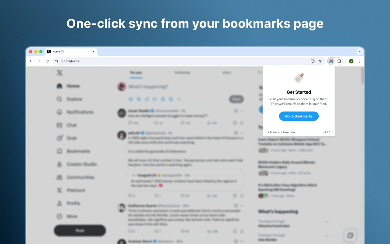 Ever bookmark a great post on X and then forget it exists? X Bookmark Resurfacer brings your saved posts back into your home feed as gentle reminders, right where your attention already is. Sync your bookmarks with one click and let the extension resurface random saved posts at intervals you choose, from 10 minutes to 2 hours. Each resurfaced post is clearly marked, and you can trigger one instantly. Everything runs locally in your browser. No servers, no tracking. Just you and your bookmarks.