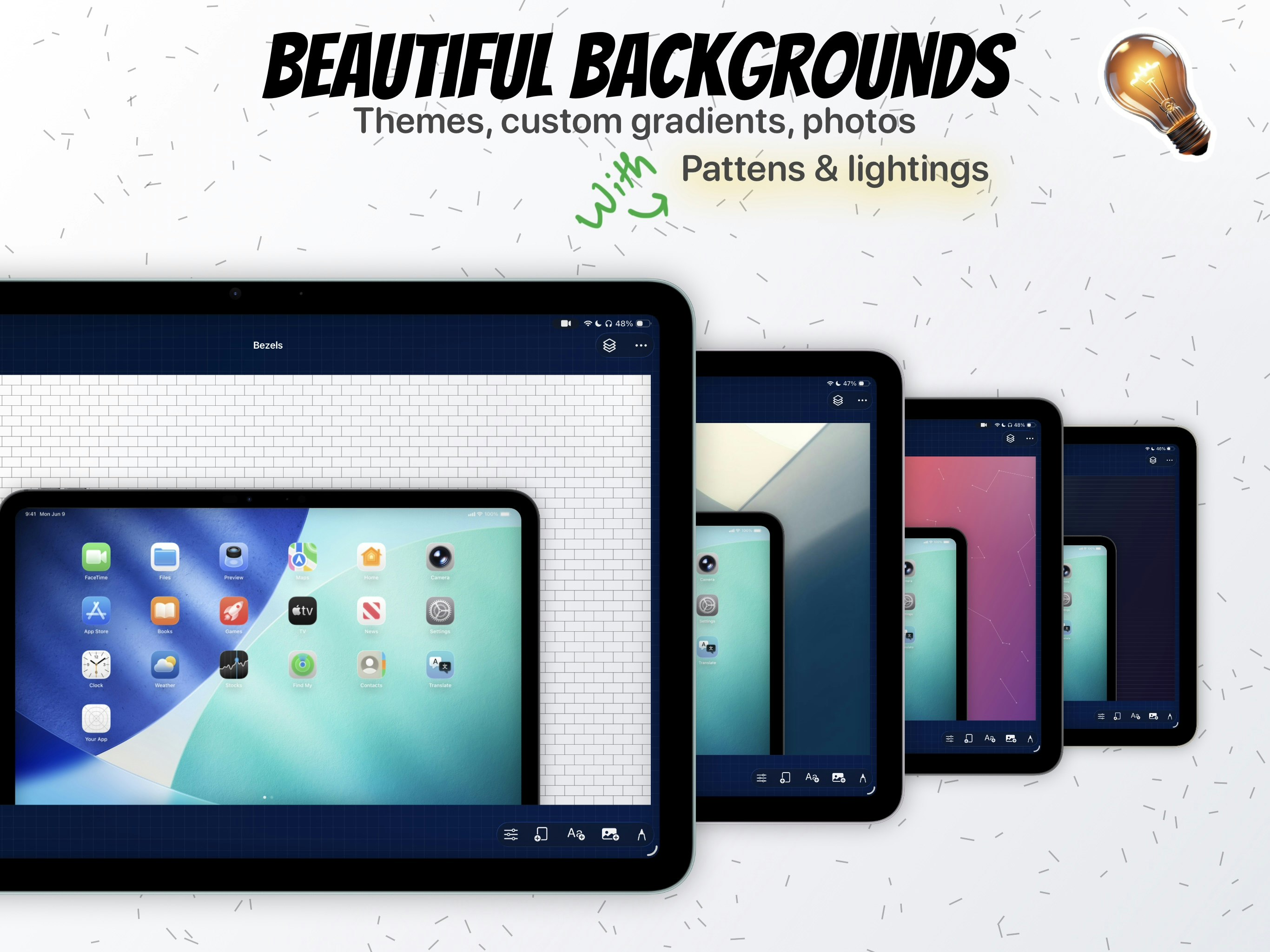 Bezel Studio designs Apple-device mockups in seconds. Build projects with multiple canvases; frame screenshots and recordings with bezels, backgrounds, and pro type. Drag, rotate, resize, and reorder layers of text, images, stickers/badges, and drawings with guides and haptics. iCloud sync across devices. Export high-res renders. Pro: full patterns and lighting, on-device App Translation for any canvas or whole project, Apple Intelligence sticker generation, and video-in-bezel export.