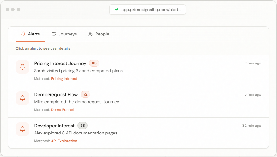 Stop guessing which users are ready to convert. Prime Signal watches your product for high-intent behavior and sends you real-time alerts when users show buying signals. Drop in a simple JavaScript snippet. Record user journeys with our bookmarklet. No code required, just use your own service and Prime Signal will record your steps. Get email alerts the moment someone matches. Built for small SaaS teams who need actionable signals, not dashboards full of analytics.