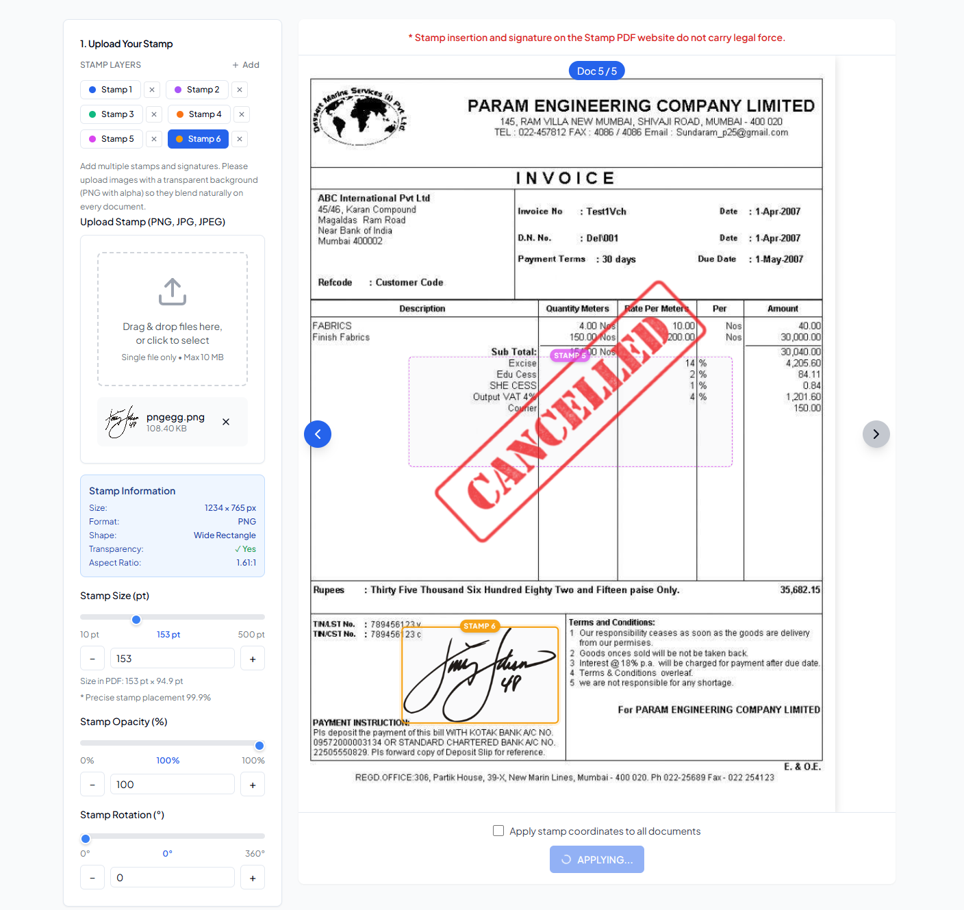 • In-browser — no software, no install • Batch processing — up to 10 files at once • Multiple stamps & signatures per document — place as many as you need • Full control — rotate, resize, and adjust transparency