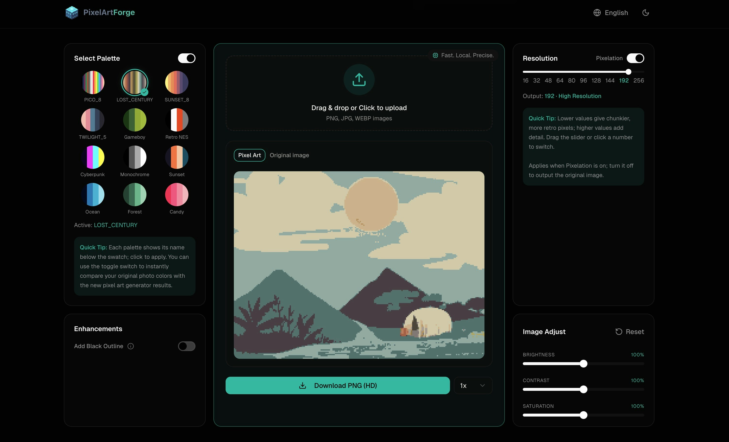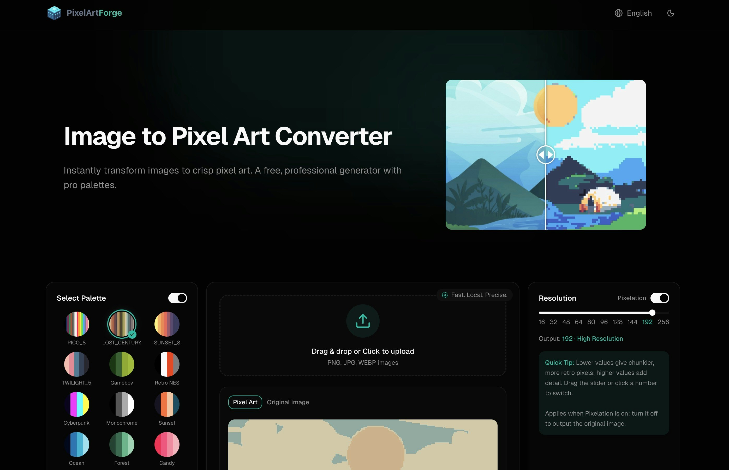 PixelArtForge is a powerful, web-based tool designed to convert any image into professional-grade pixel art instantly. With support for custom palettes (like GameBoy, NES, and PICO-8) and adjustable pixel density, it bridges the gap between modern photos and retro aesthetics. Perfect for indie game devs, NFT creators, and pixel art enthusiasts.