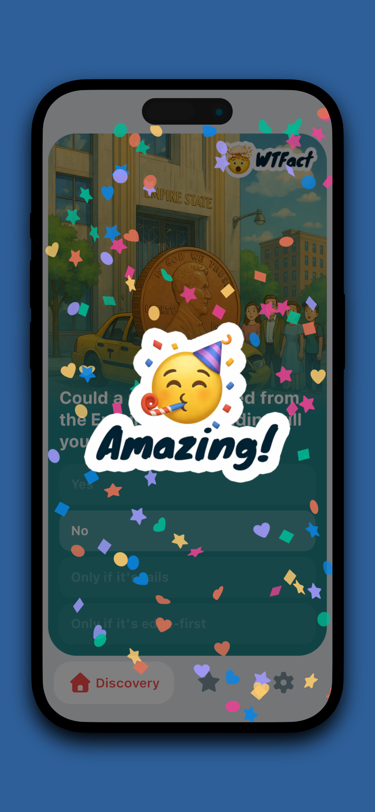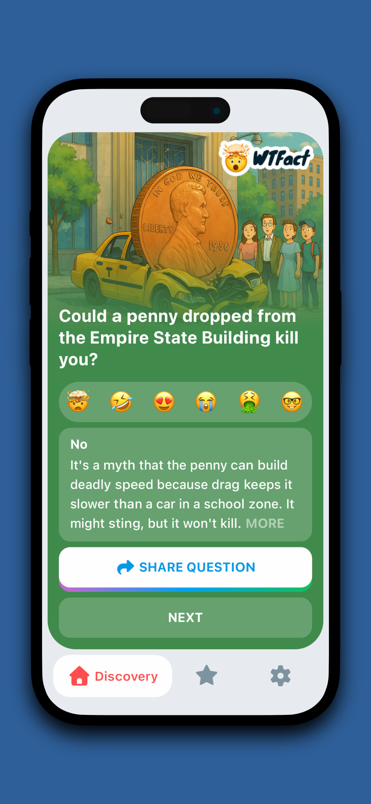 WTFact is a fun-fact quiz app for instant "Wait… That's real?!" moments. Answer quick questions, learn weird-but-true facts, and share the best ones with friends. New quizzes daily, perfect for a 2-minute break. 🤯🤯🤯