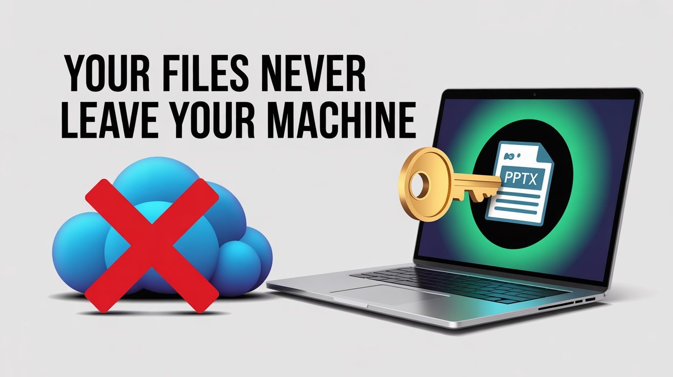 Unlock PPTX files 100% in your browser. No file uploads, no server processing, zero-knowledge privacy. The safest PowerPoint password remover online.