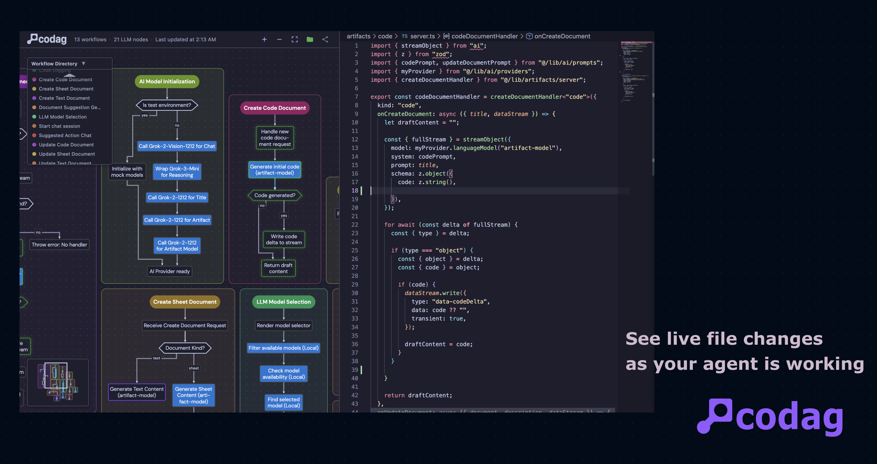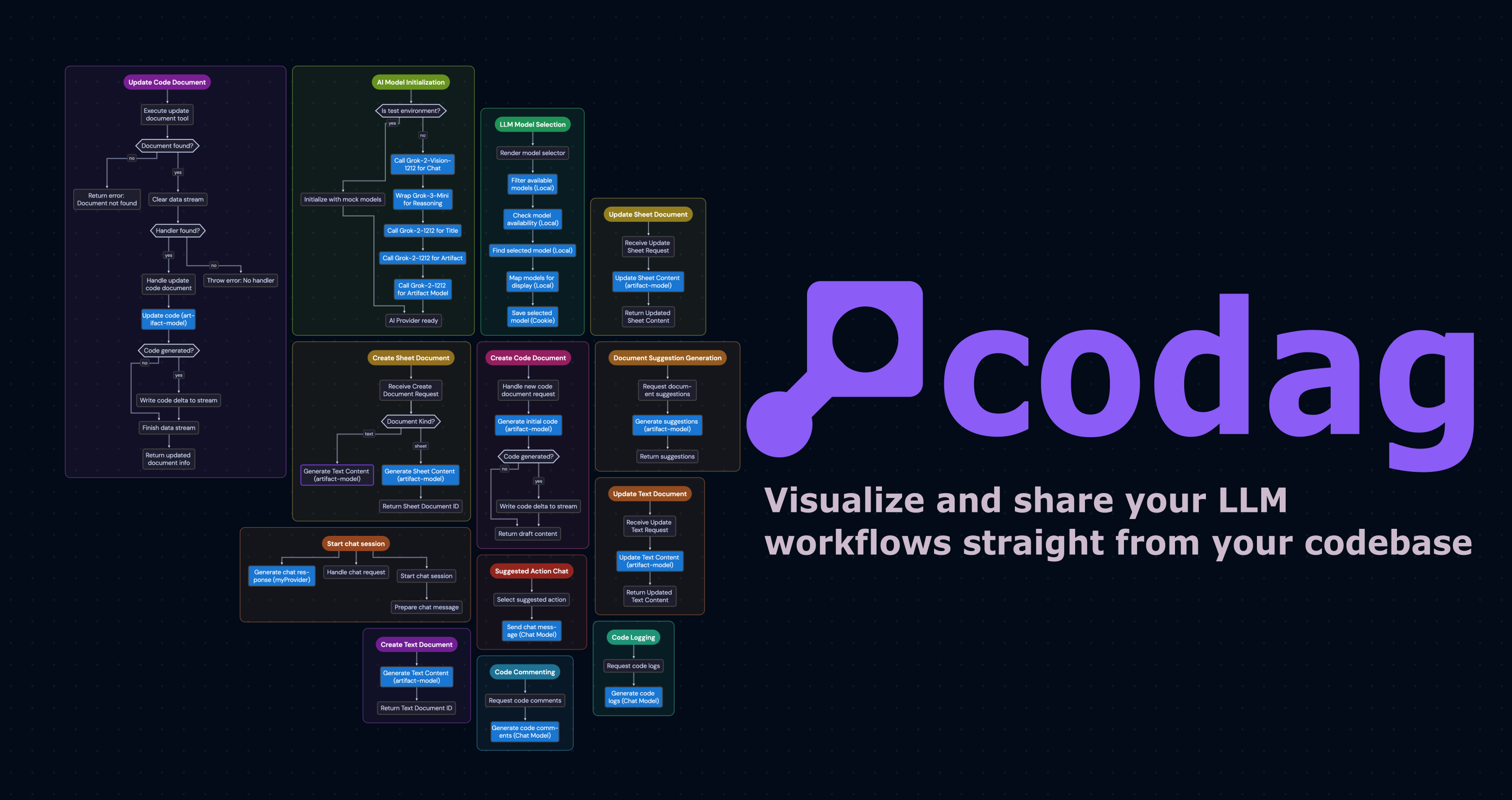 Visualize your LLM workflows as interactive & shareable graphs. Point Codag at your codebase — it maps every LLM call, branch, and data flow. Click any node to jump to source. Live updates as you code. Self-hosted, open source.
