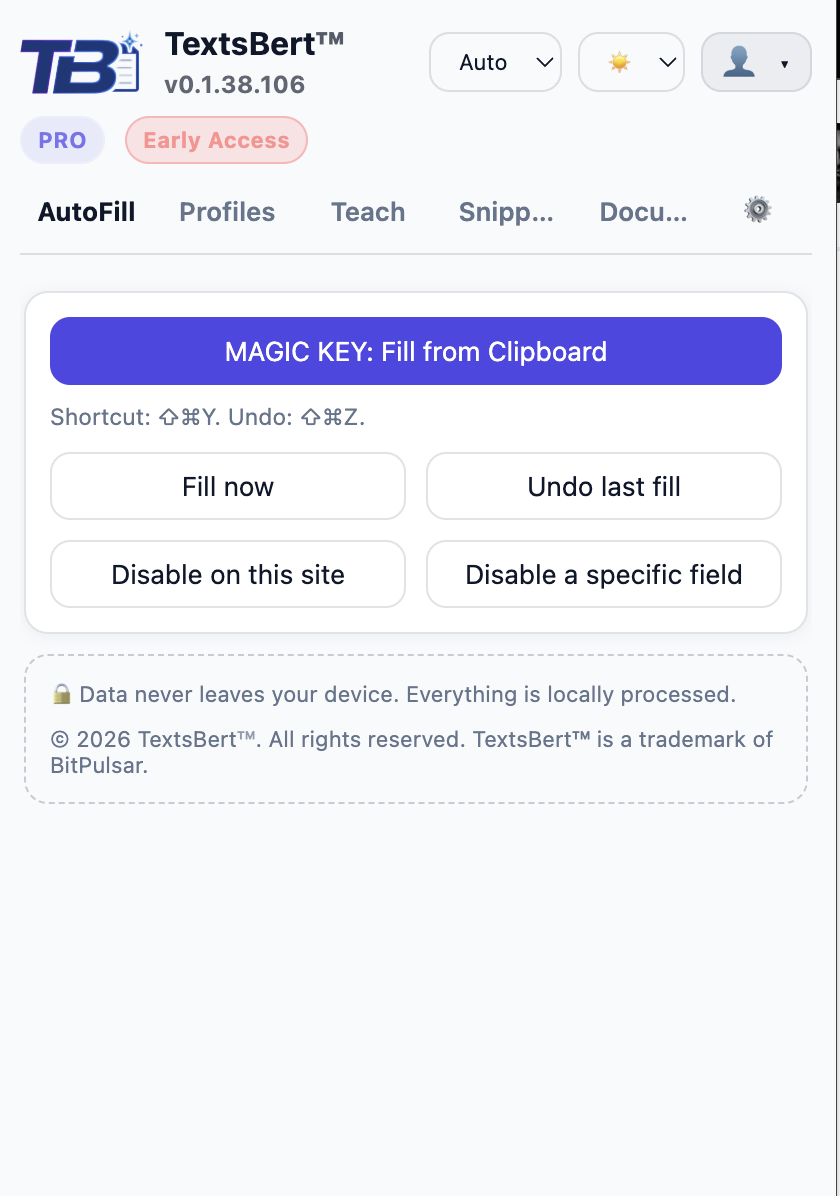 Fill any form in ~1 second. Privacy-first with 100% local processing for autofill. Teachable field mappings (BETA), profiles for repetitve Data fillings, and snippets for cliches. Optional team workspaces with end-to-end encrypted sync. Offers 14-days trial. What it does One hotkey: paste + fill across the page in seconds Safety-first logic: skips uncertain fields rather than filling wrong data Profiles & reusable data blocks to avoid repetitive typing Multi-language friendly (EN/DE/FR/ES/AR)