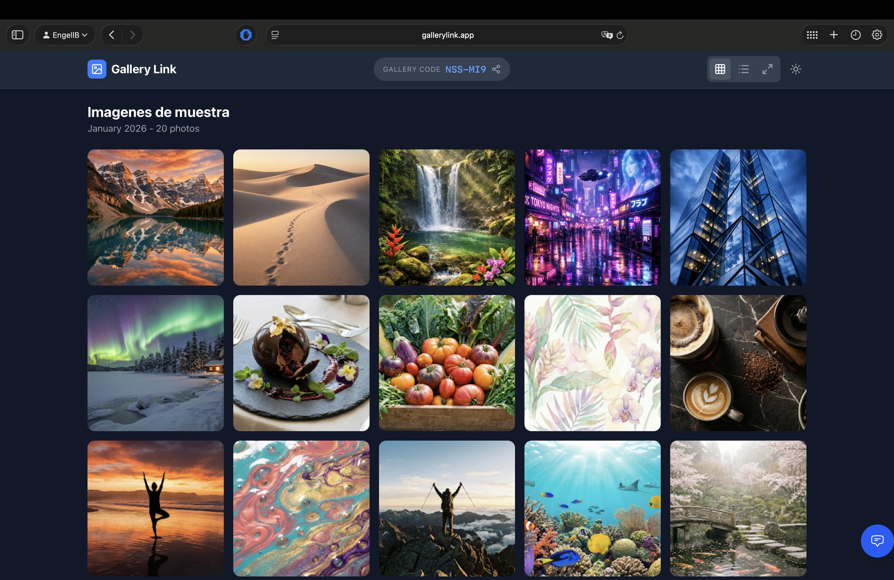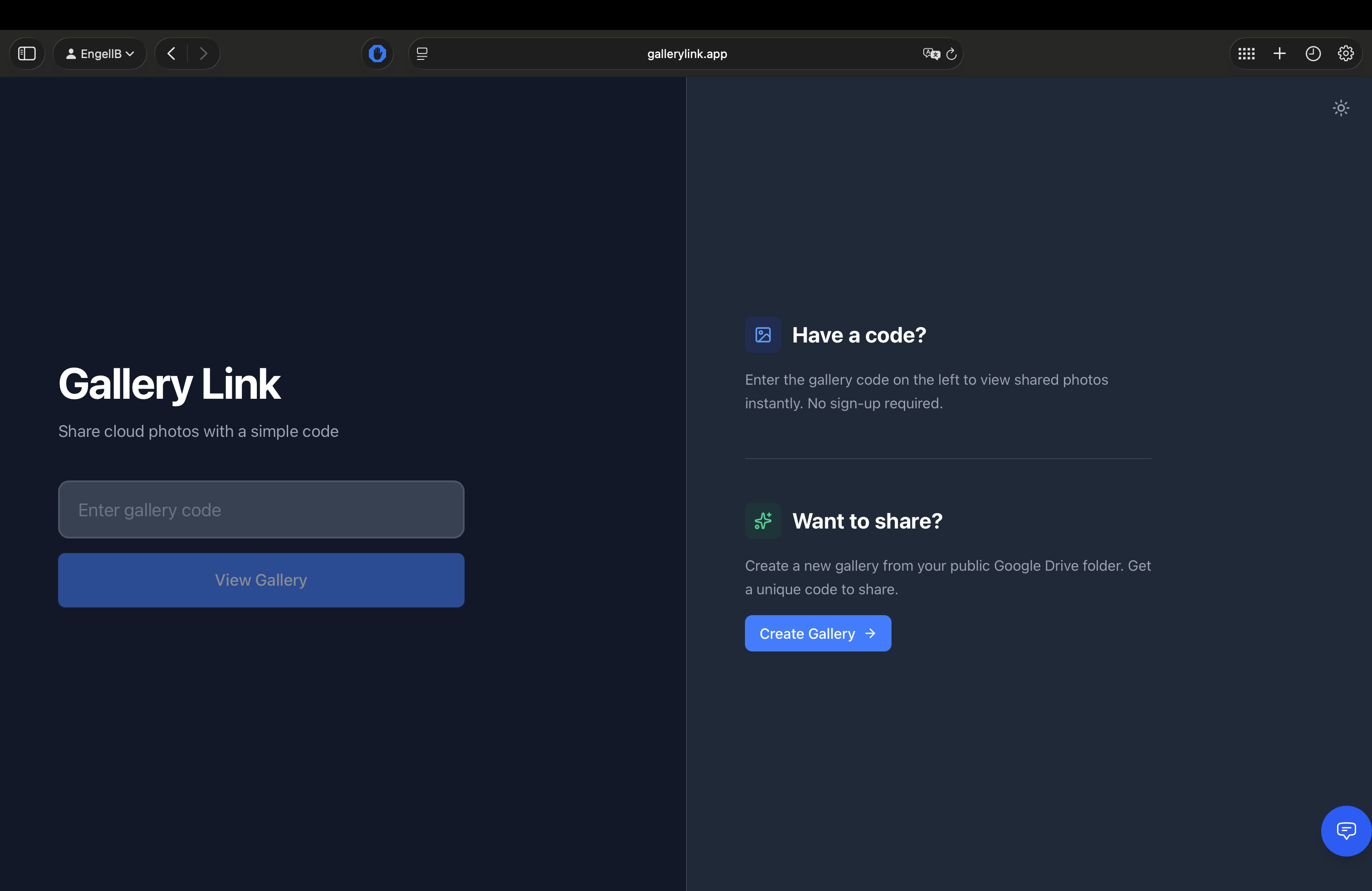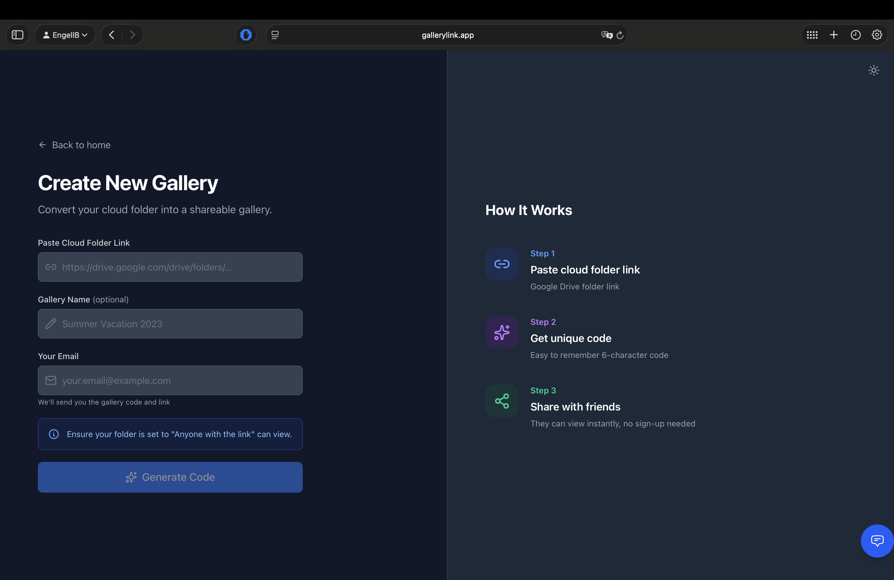 Share photo galleries from cloud storage with unique codes. No sign-up required.Minimalist web app for sharing photo galleries from Google Drive via unique 6-character codes. Users receive gallery details via email.