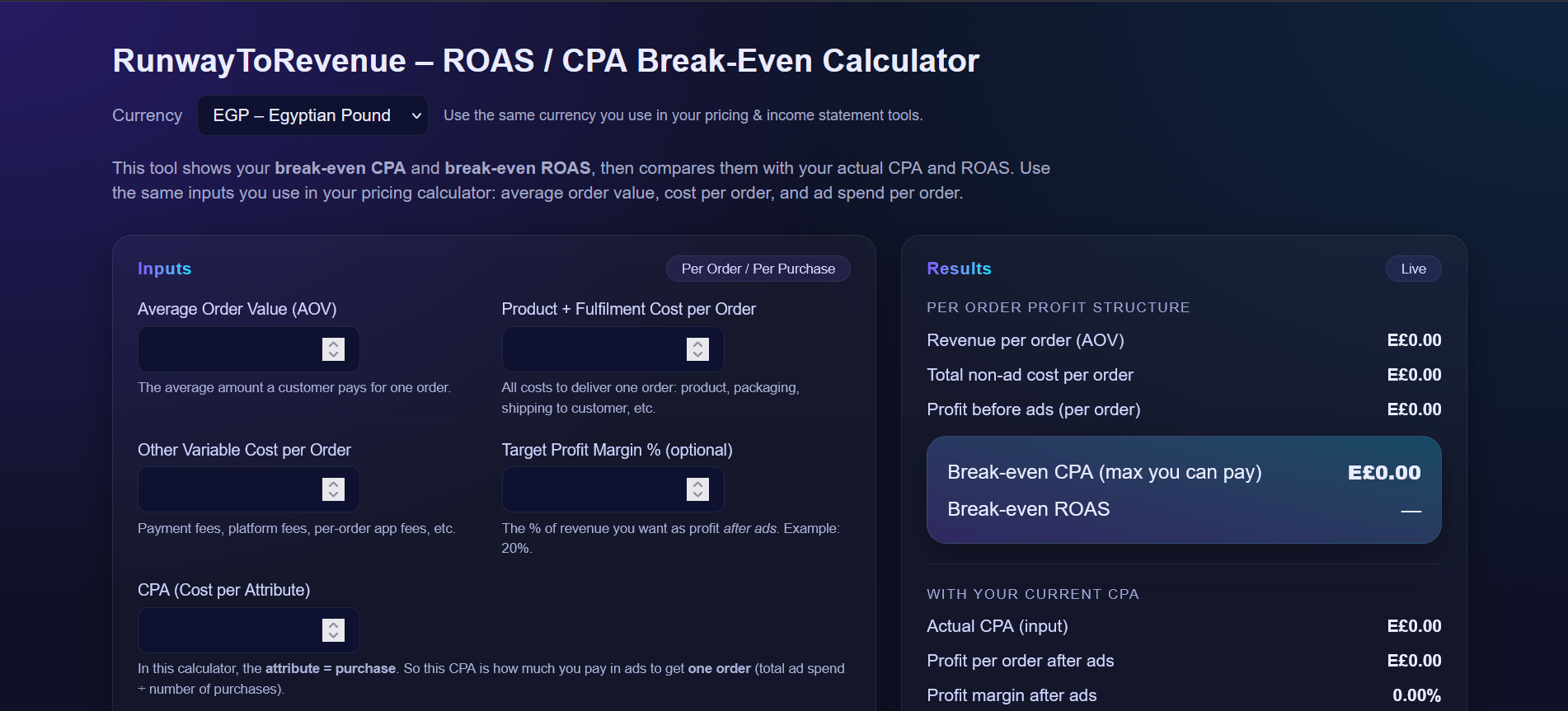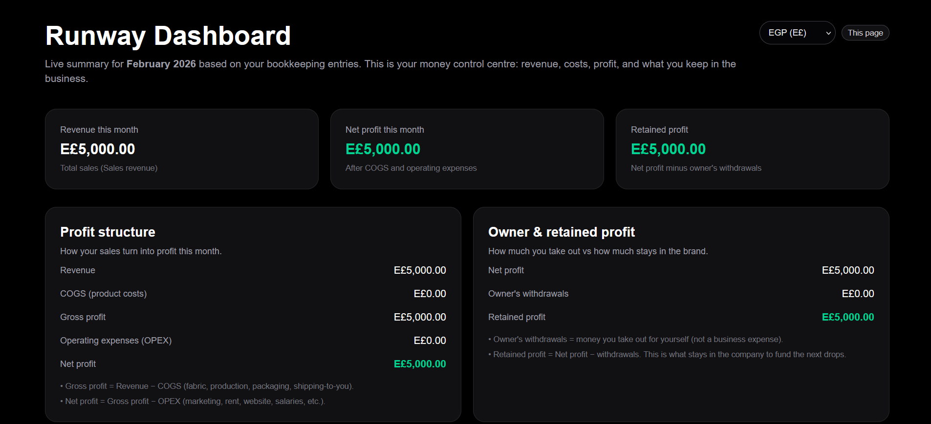Runway Tools is an operations system for fashion brand founders who still run the business themselves. It brings financial clarity to everyday decisions like pricing, production quantity, and cash flow through calculators, AI validation, and a single dashboard — helping founders replace guesswork with real numbers before scaling or delegating.