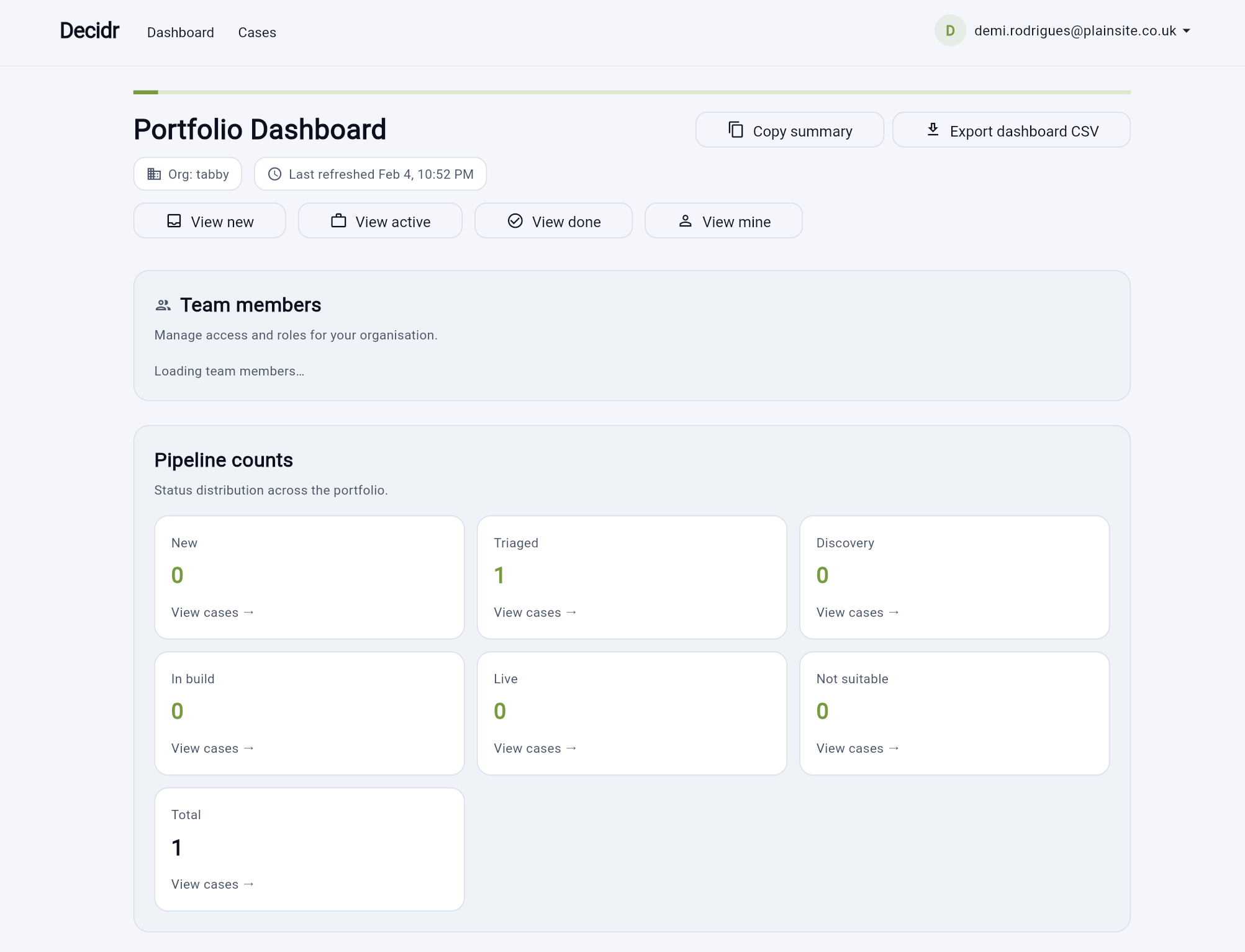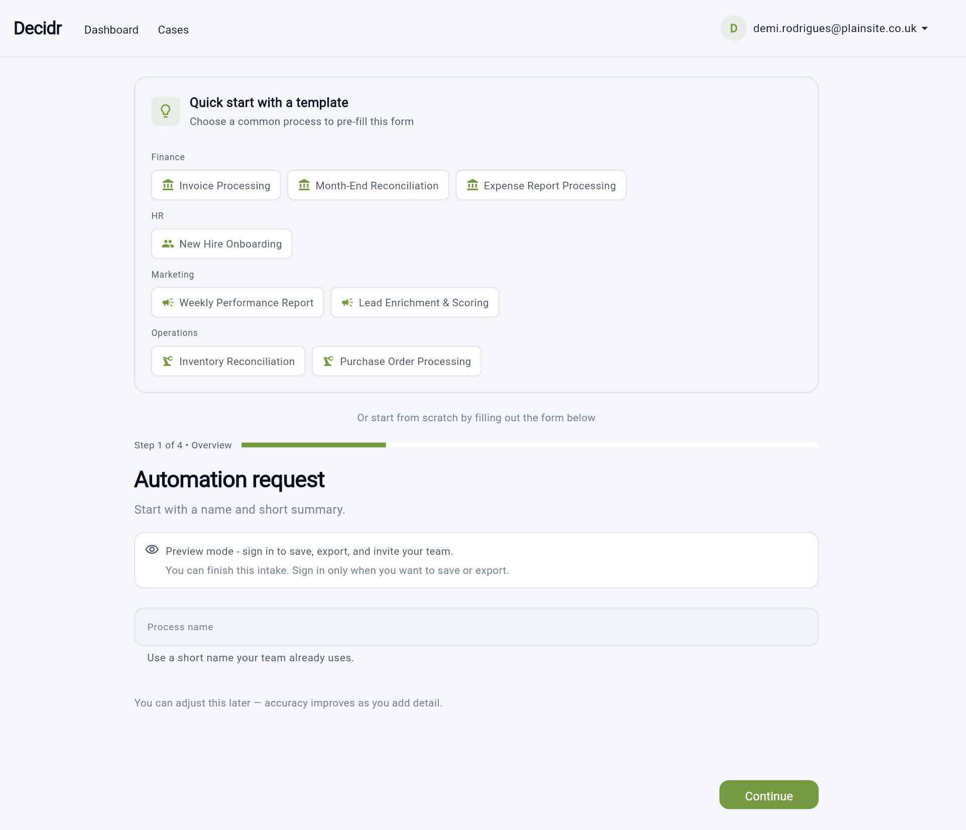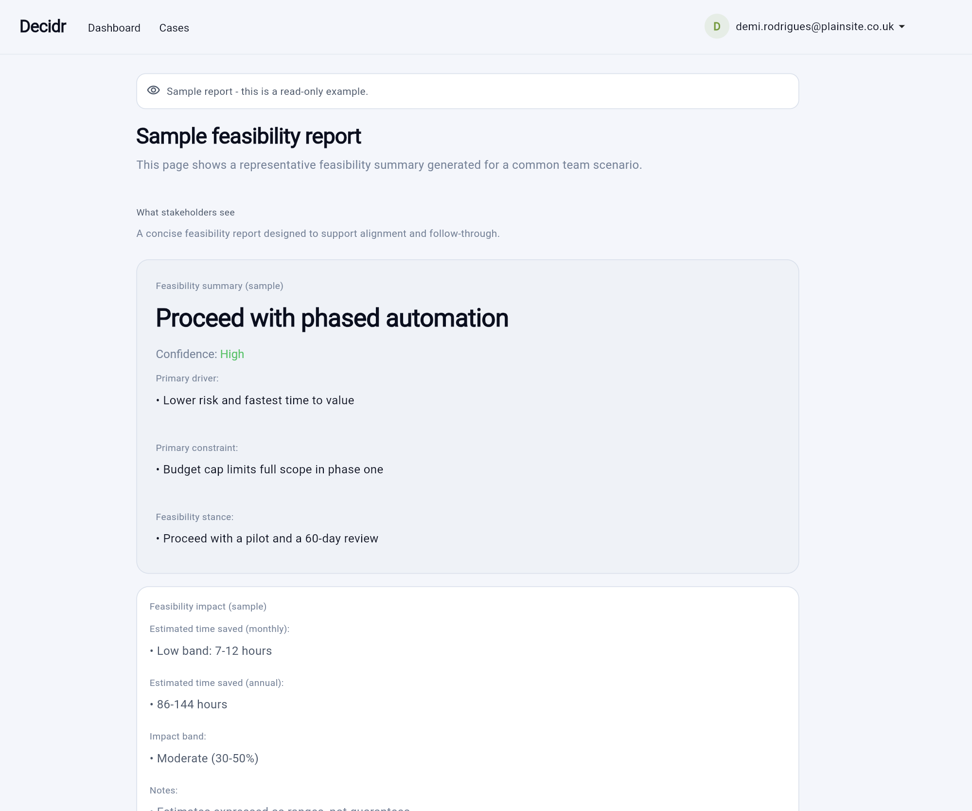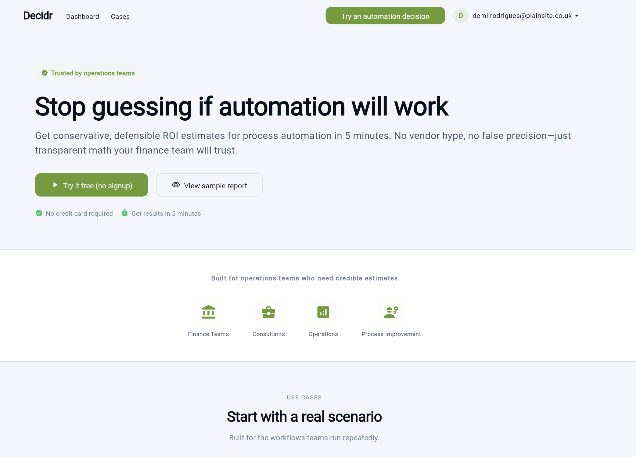 Automation teams waste weeks building ROI models in Excel. Consultants charge $10k per study. Vendor calculators are biased. Decidr solves this: 5-minute assessments with transparent calculations finance teams trust. 8 templates covering 70% of use cases, conservative estimates (low/medium/high ranges), complete audit trails. Multi-tenant B2B SaaS built on Flutter+Firebase. Stripe integrated, payment-ready. Pre-revenue (never launched) but production-complete.