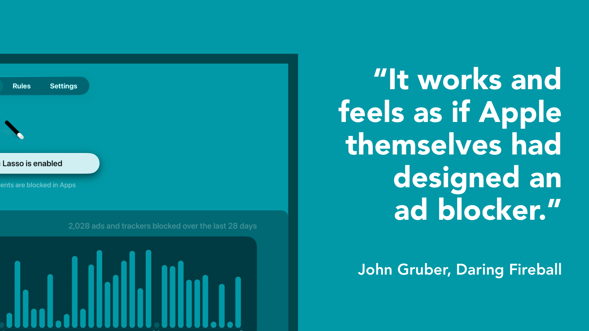 Magic Lasso Adblock v5.1 now blocks ads and trackers on your Apple TV, enabling you to watch your favourite tv shows with less interruptions while protecting your privacy from in-app ad tracking. This release builds upon our iPhone, iPad and Mac apps, to work seamlessly on your Apple TV, extending protection to streaming video, games, and news apps. All ad blocking is done directly on-device, using a fast, efficient Swift-based architecture that follows our strict zero data collection policy.
