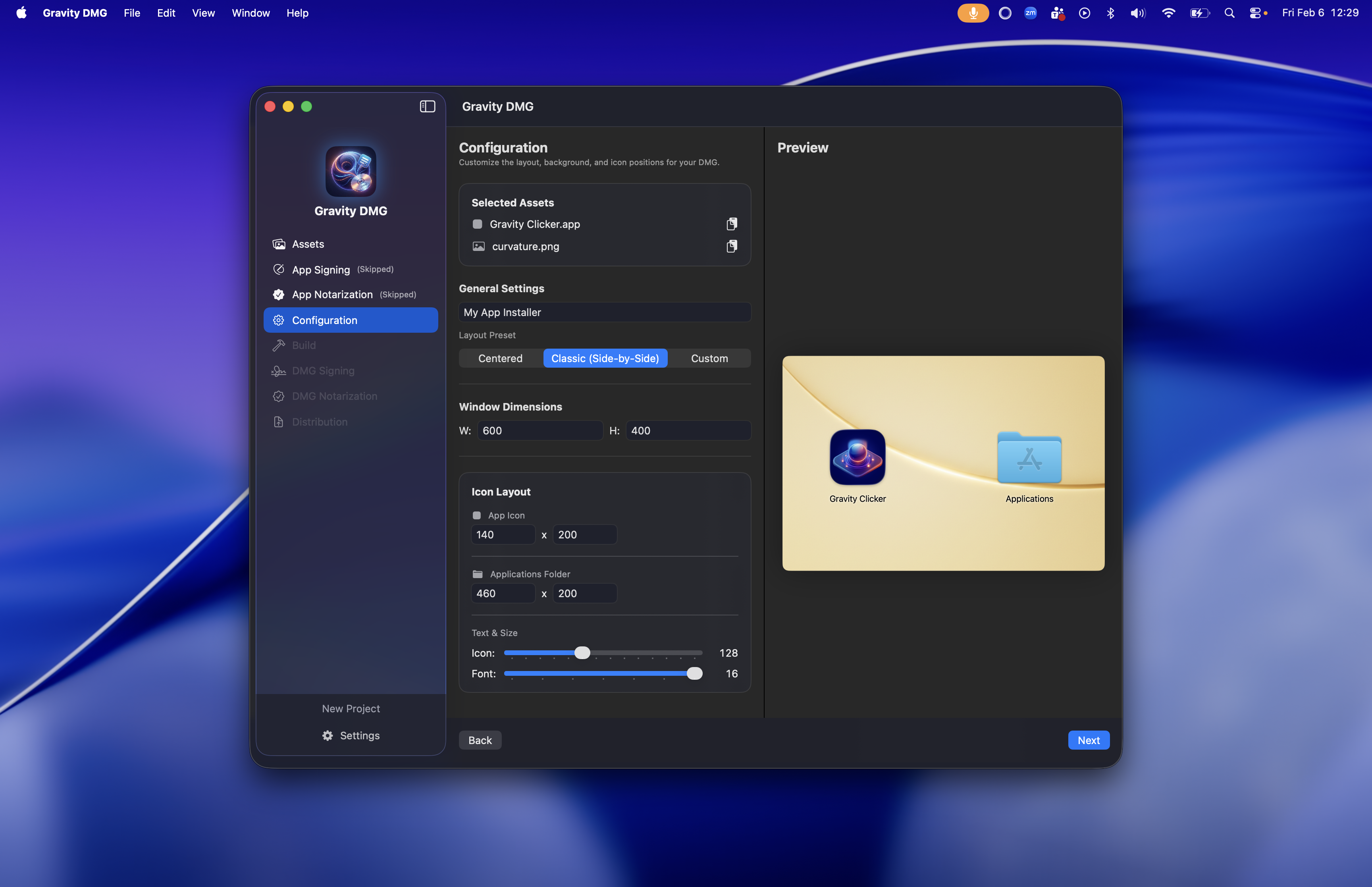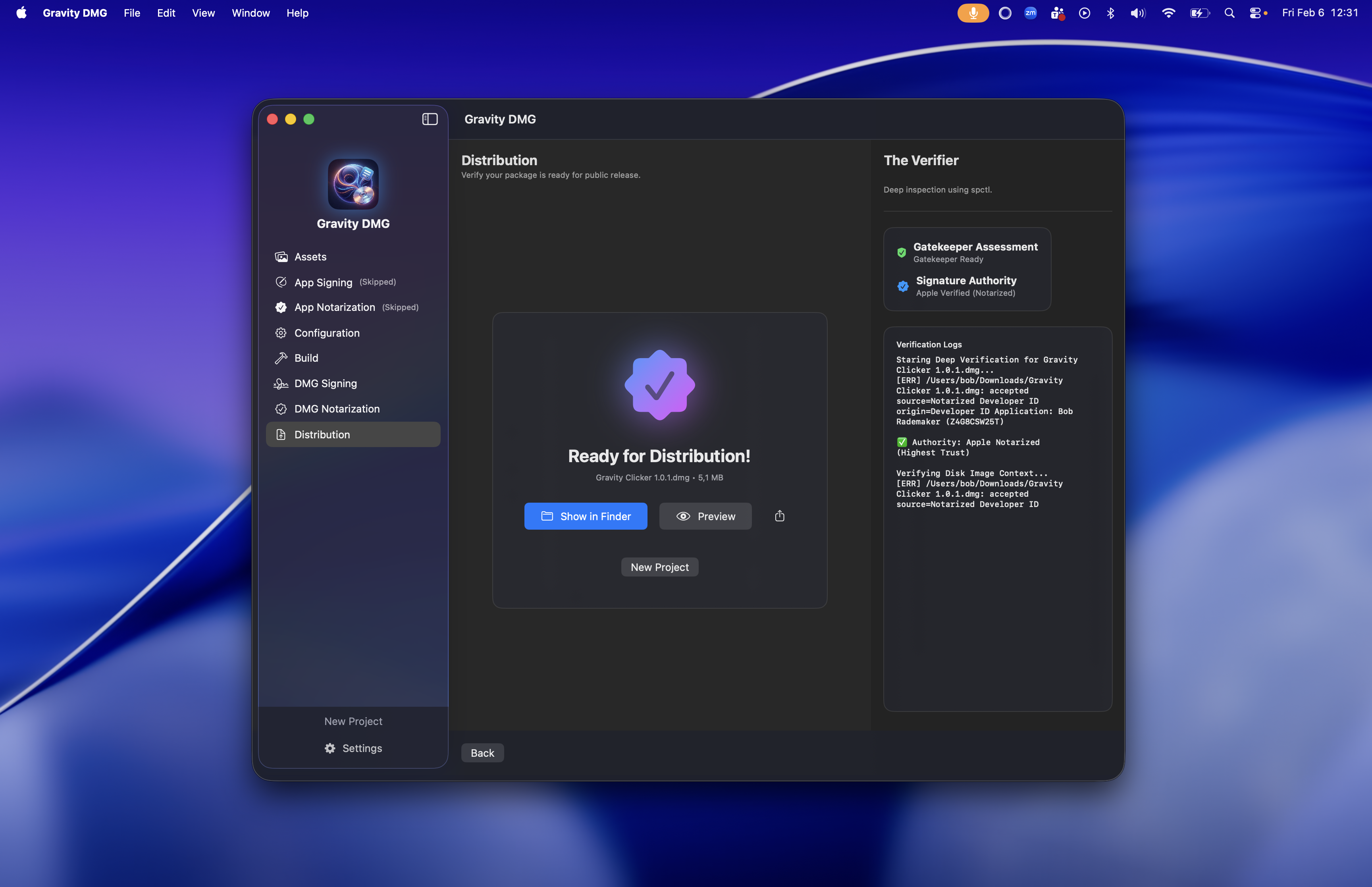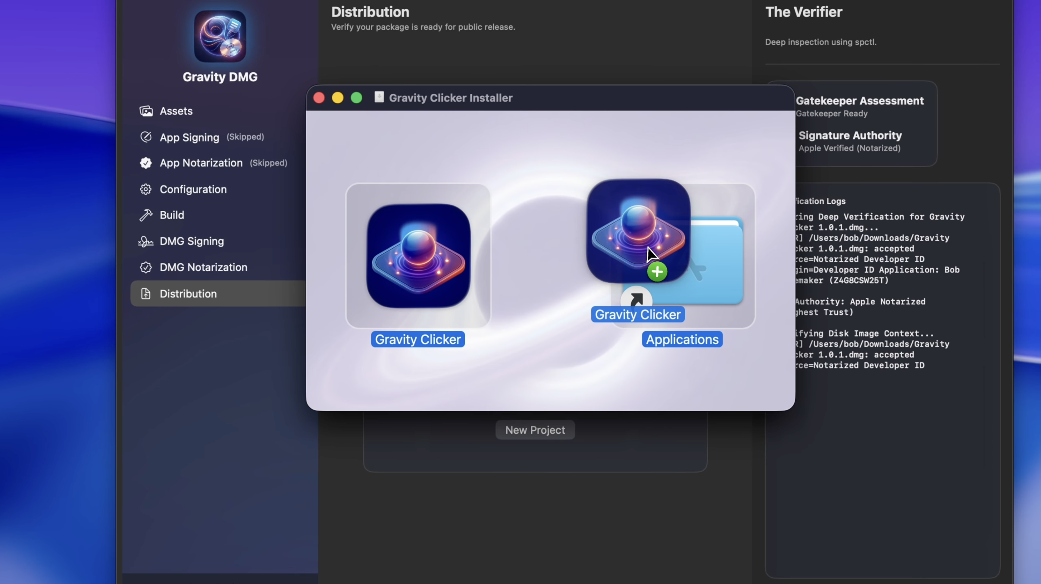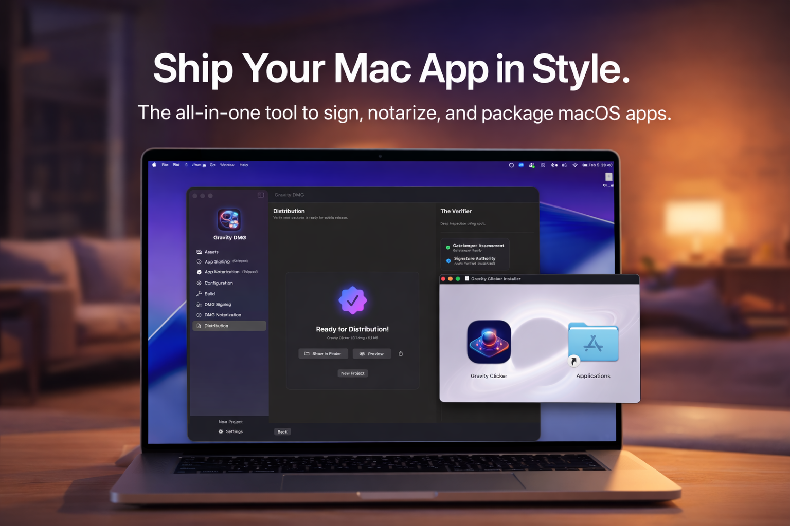 Build beautiful, notarized DMGs in seconds. Gravity DMG is the all-in-one tool to sign, notarize, and package macOS apps with professional elegance. Stop fighting complex command-line tools like notarytool and hdiutil. The Autopilot Workflow: ✦ Visual Styling: Curated layout presets ✦ One-Click Notarization: Native Apple API ✦ Secure & Local: System Keychain integration
