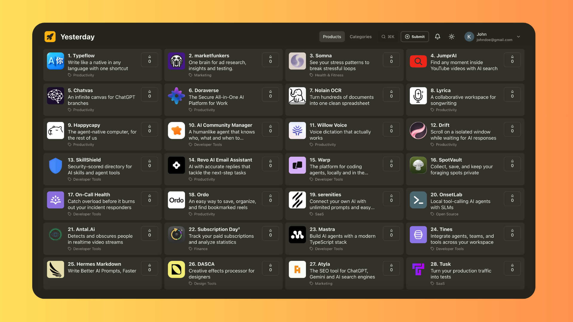 A visibility-first discovery platform built to put your product in front page. Tired of your launch getting buried? Our streamlined UI/UX design and weekly relaunch feature ensure your product gets a higher chance to be visible on screen without users needing to scroll for miles, Whether you’re a curator hunting for the next big tool or a solopreneur looking for those crucial first users, we level the playing field. No "top 5" paywalls—just pure discovery for makers who are just getting started.