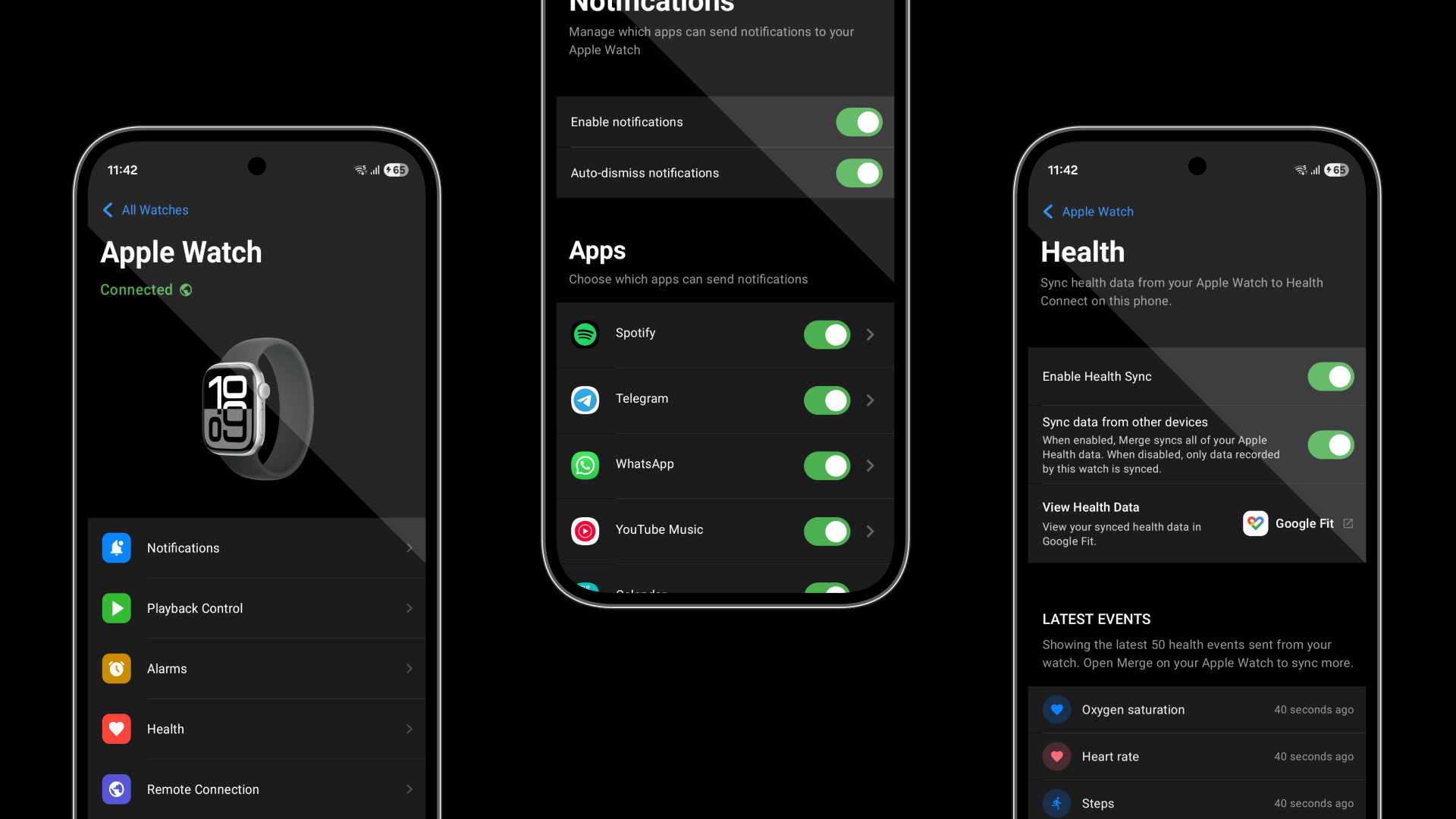 Merge finally brings the Apple Watch to Android. Unlock Apple Watch's cutting-edge health data on your Android phone, synced to any Health Connect compatible app. Get Android notifications on your wrist, reply to messages, control media playback, and more.