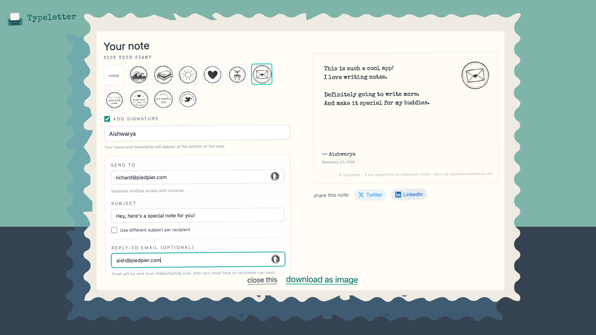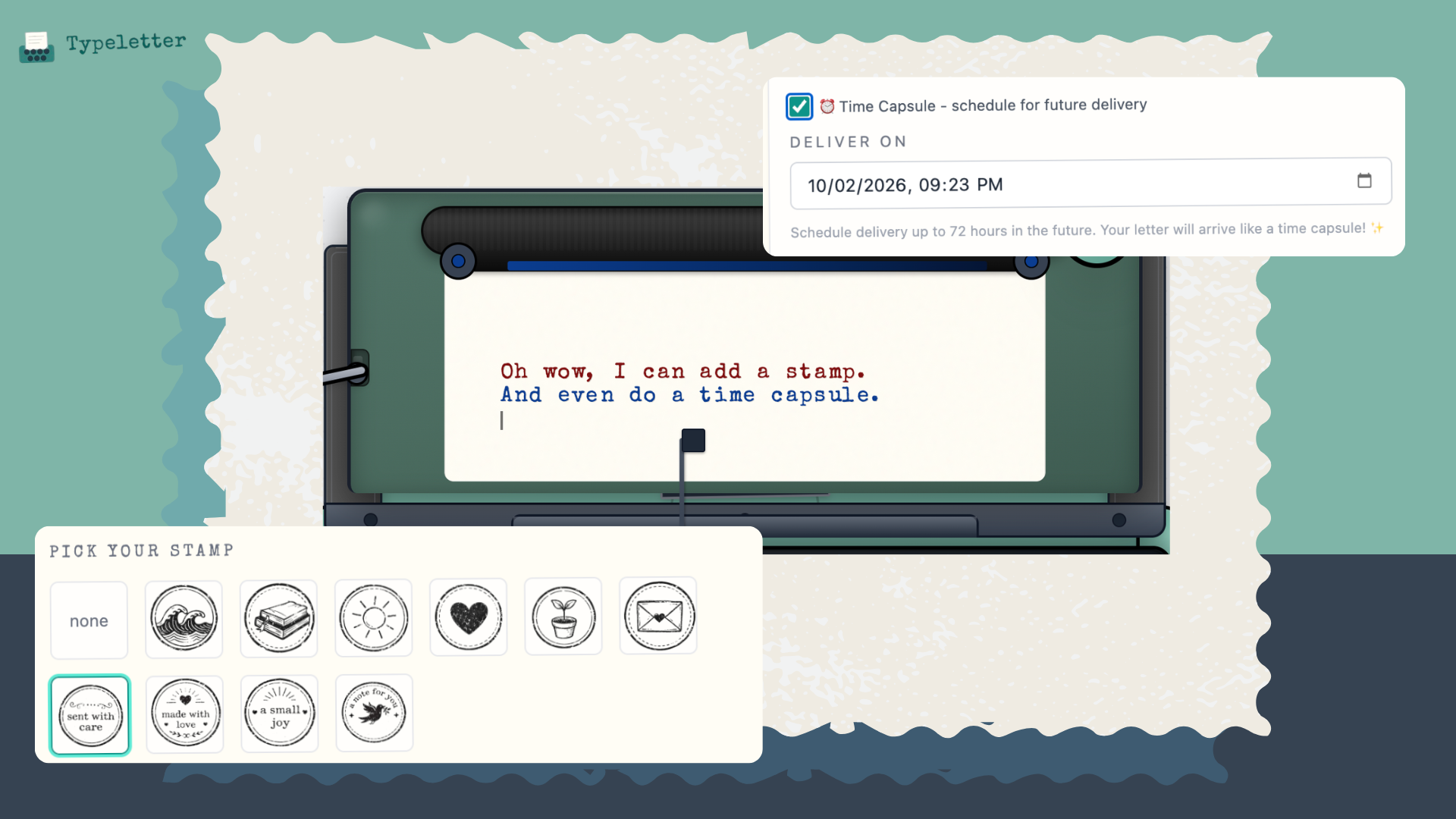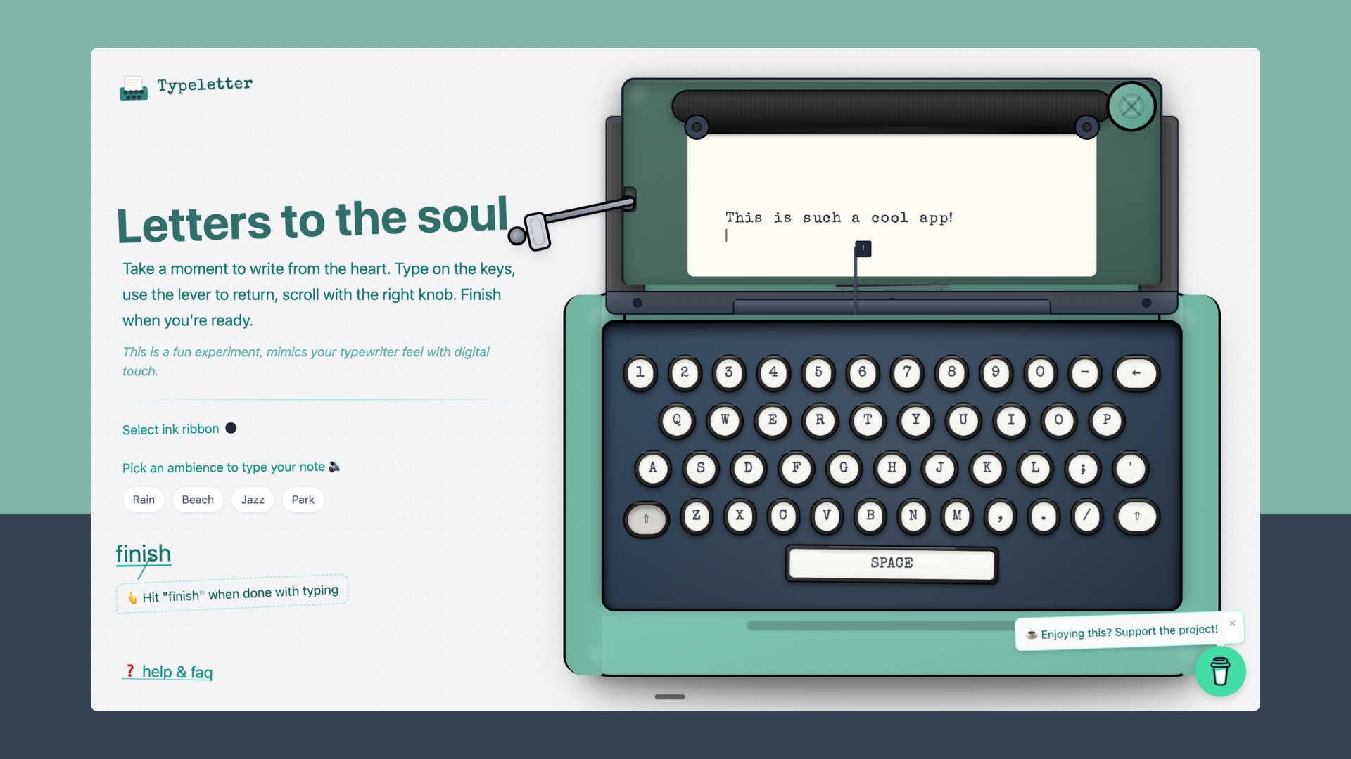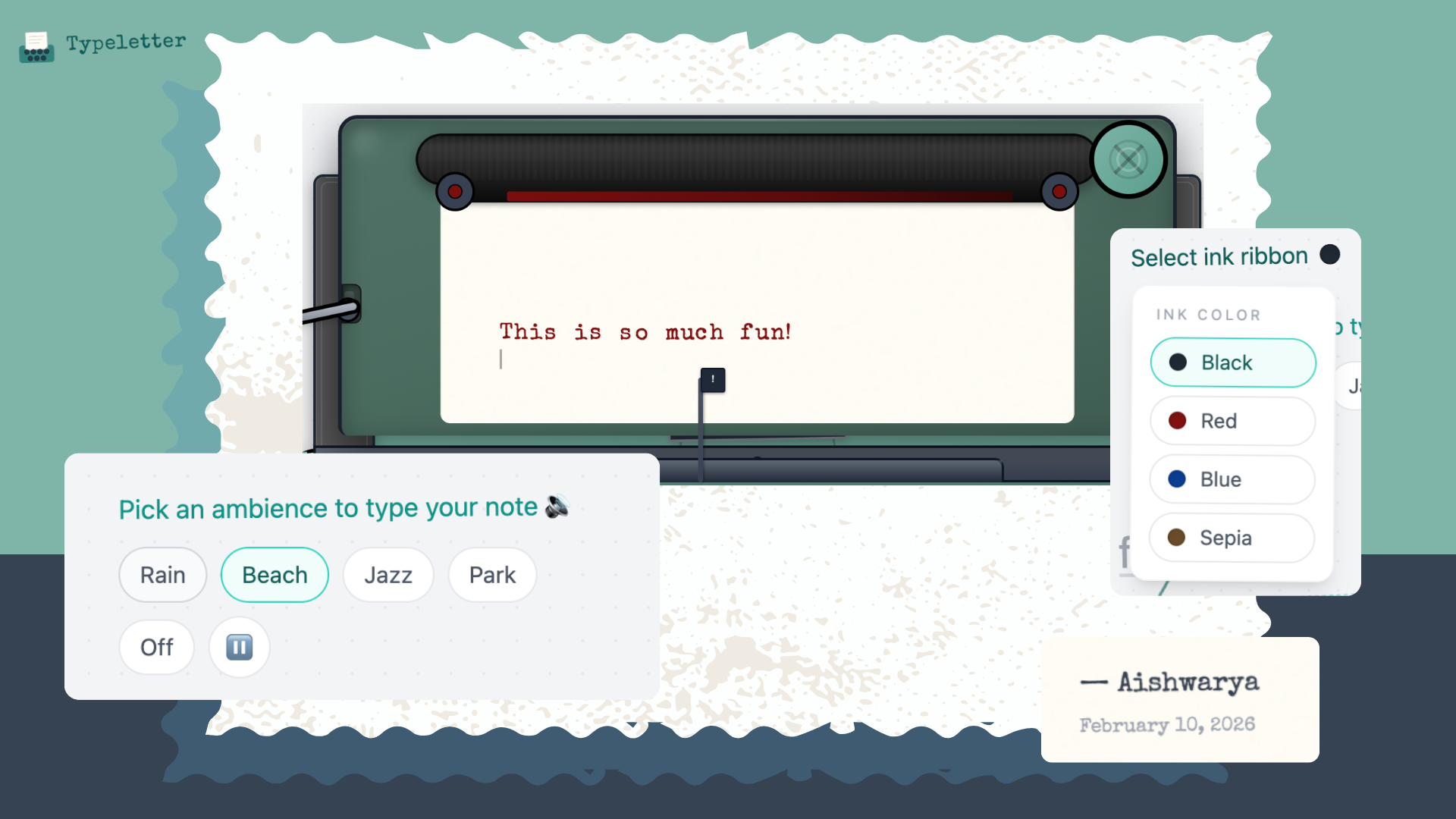 Turn your browser into a cozy, nostalgic writing nook for letters, journals, and thoughts you’ve been meaning to write. Typeletter mimics the feel of a real typewriter: clacky keys, carriage return lever, scroll knob, without any setup or sign-up. Pick your ink ribbon (Black, Red, Blue, Sepia), choose an ambience like Rain, Beach, Jazz, or Park, and just start typing from the heart. When you’re done, hit “finish” to email your note, download it as a beautiful image with wax seal stamps.