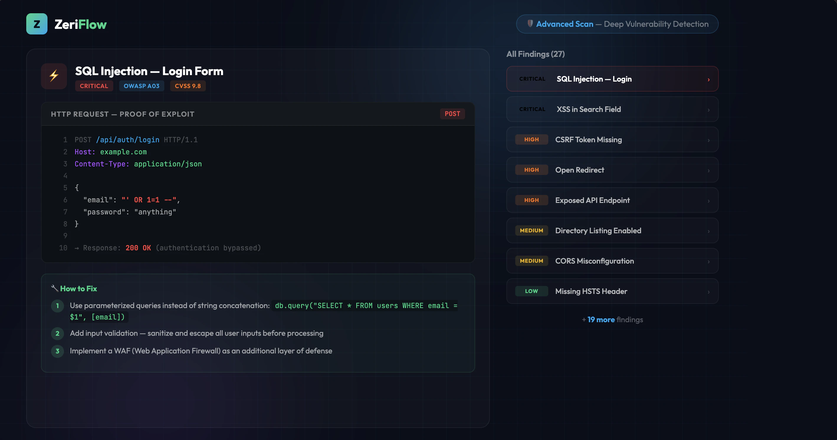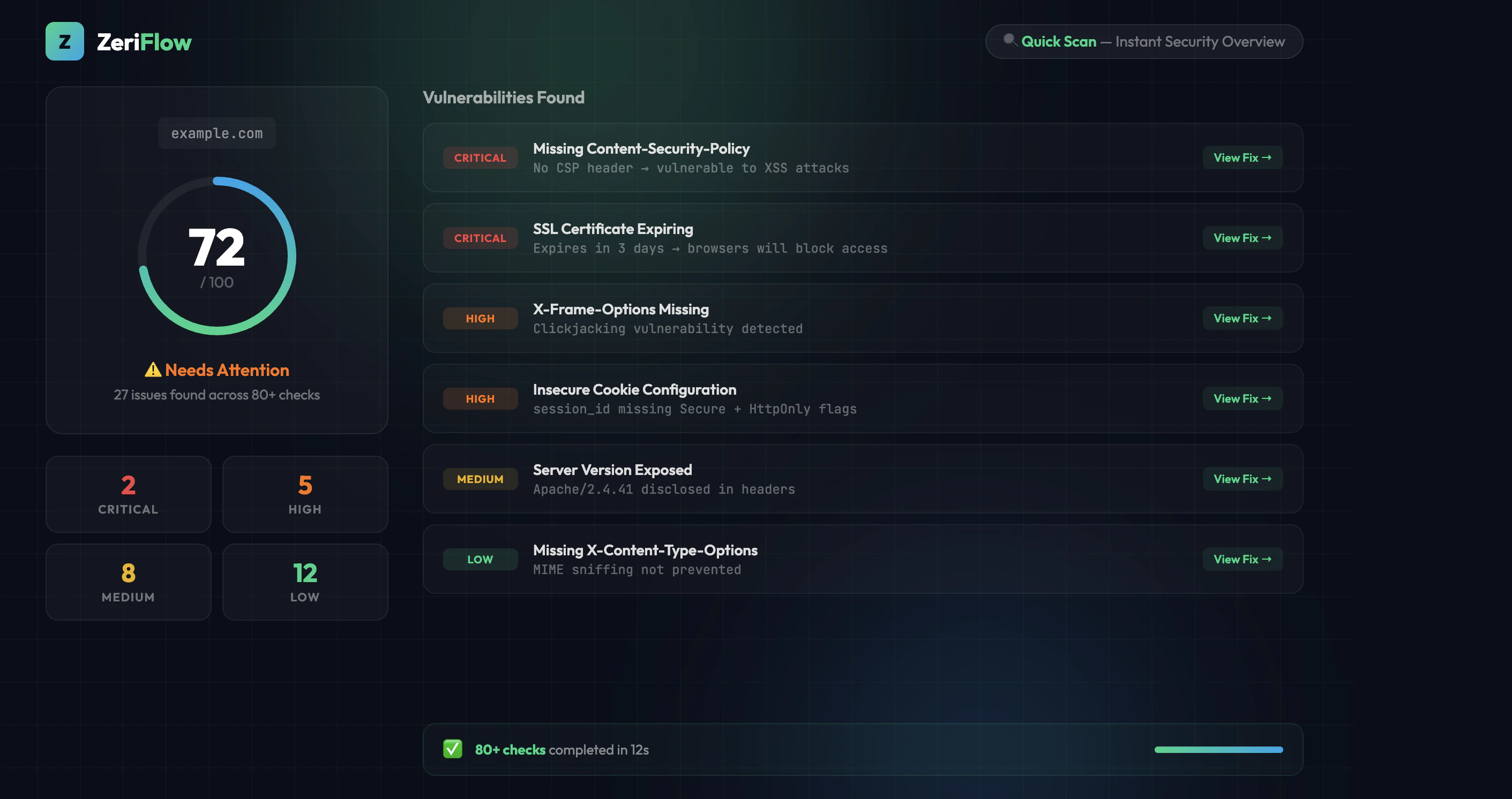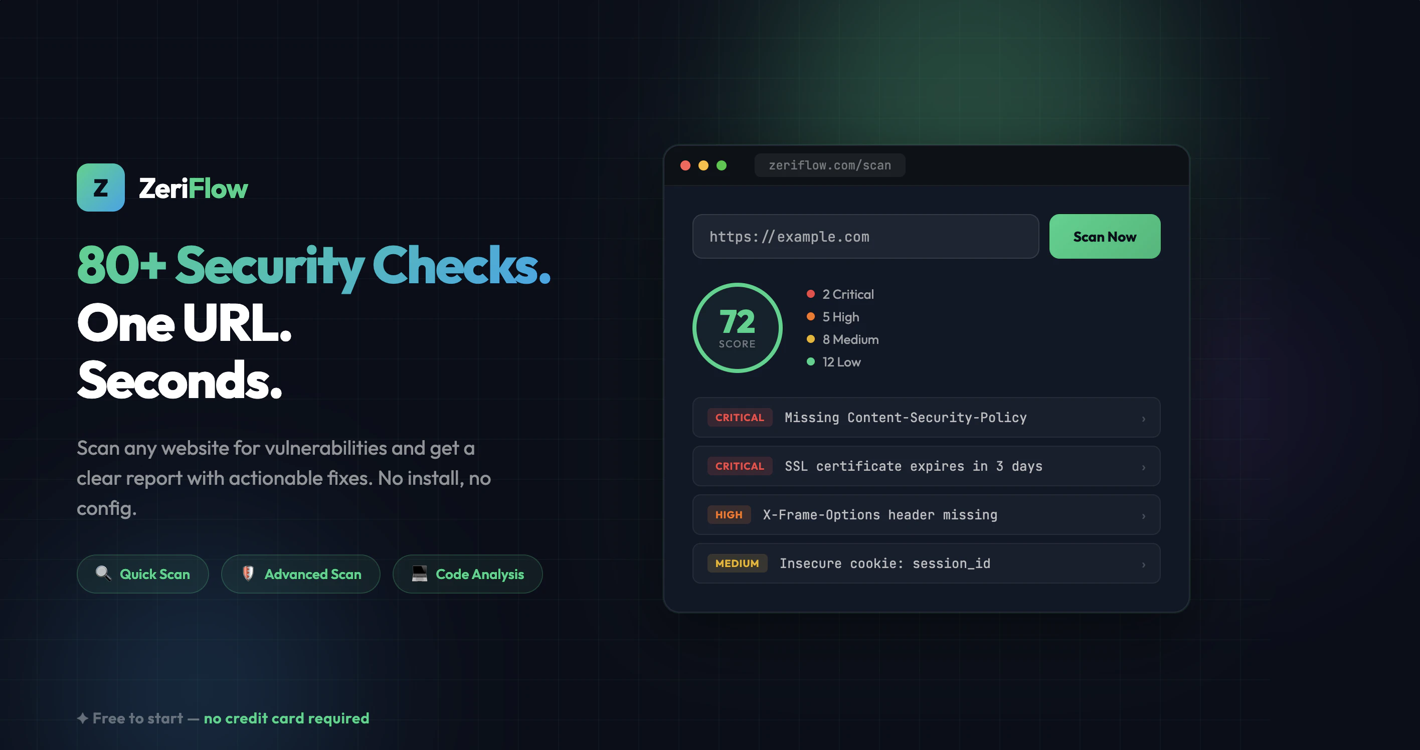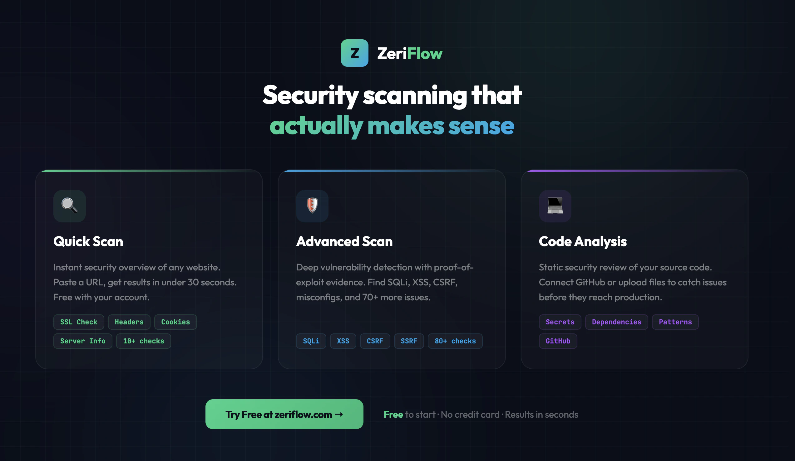 ZeriFlow is a web scanner that runs 80+ non-intrusive checks on any website and delivers a clear vulnerability score with actionable fixes. Quick Scan : Paste a URL, get an instant security overview. Free with an account. Advanced Scan : Deep vulnerability detection: SQLi, XSS, CSRF, exposed endpoints, and 70+ more checks. Code Analysis: Connect GitHub or upload code to catch secrets, vulnerable deps, and insecure patterns. Built for developers who need security without enterprise pricing.