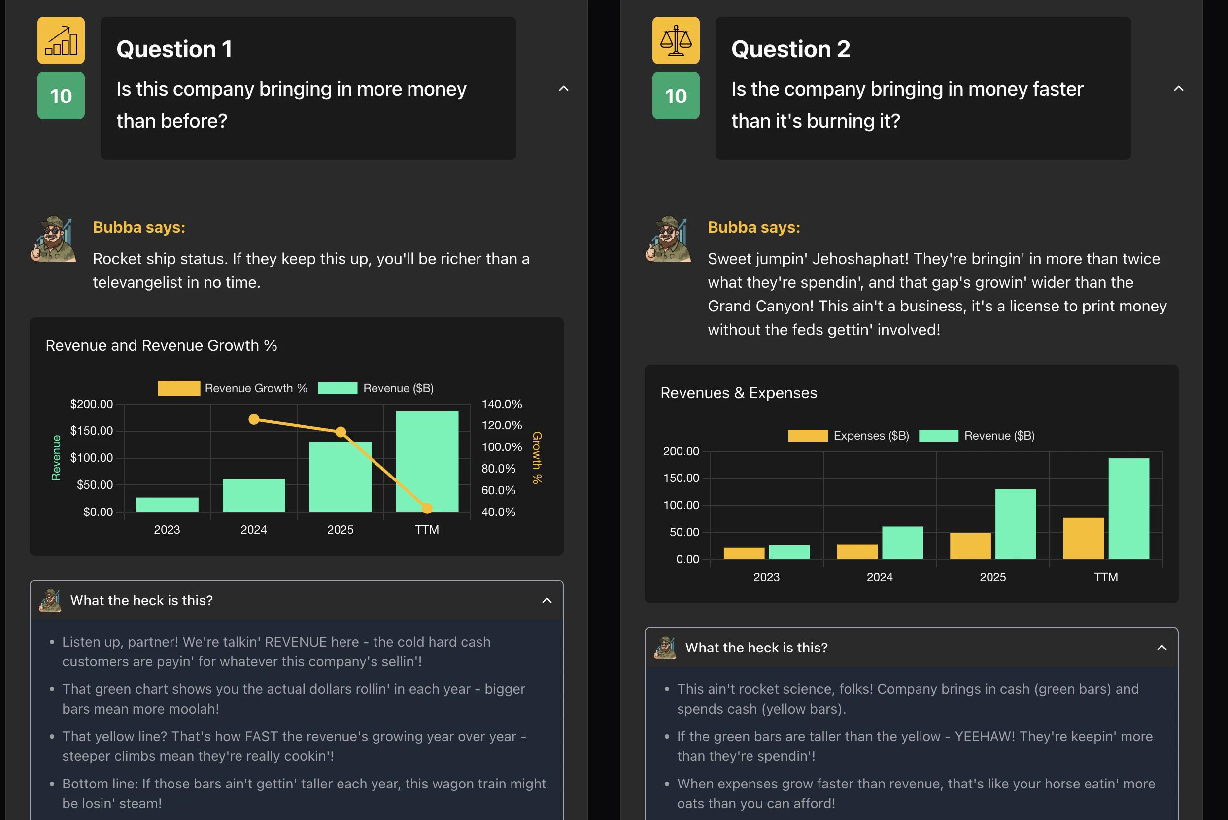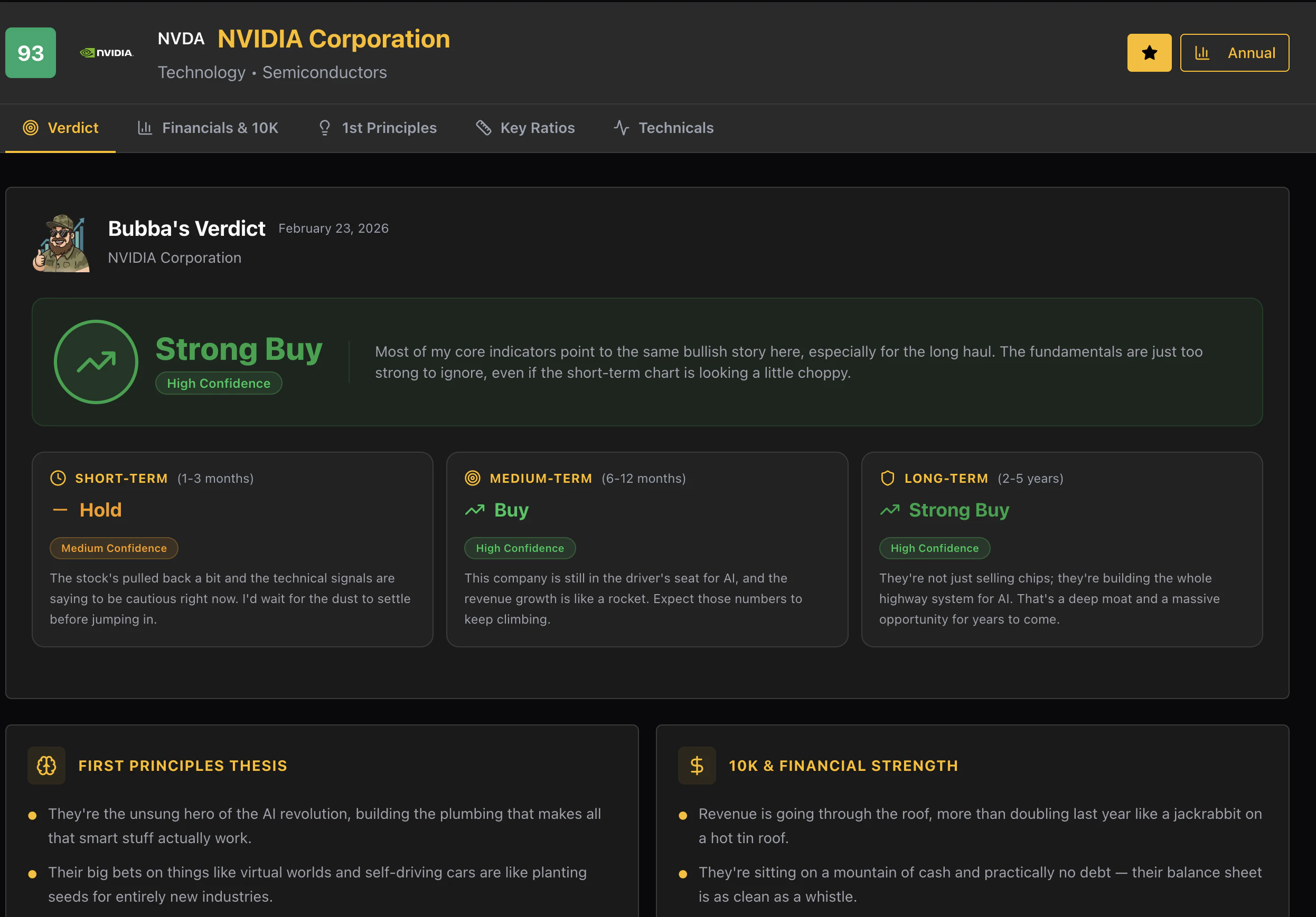 Ask Bubba is an AI stock research tool built for people who actually want to learn the market — not just get a hot take. Bubba breaks down 10Ks, technicals, key ratios, first principles, and delivers an overall Verdict in plain English with zero jargon. Free tier available. Pro unlocks the full suite for $3/mo or $30/yr — priced to cover costs, not to get rich. Try it free for 7 days. Bubba's got you.